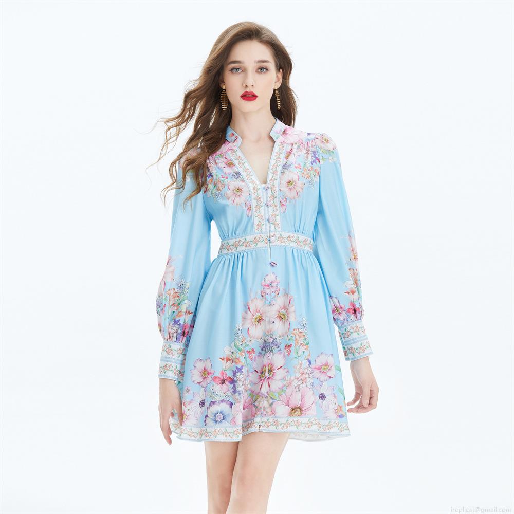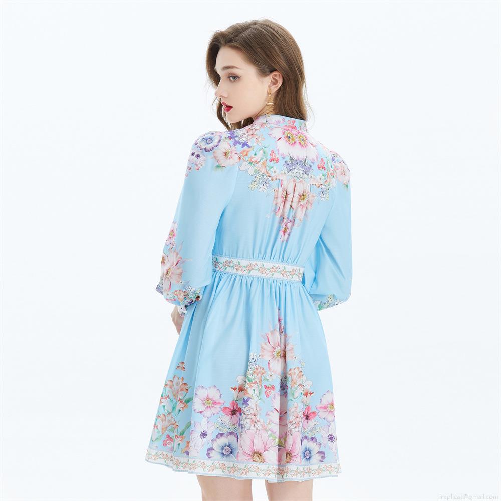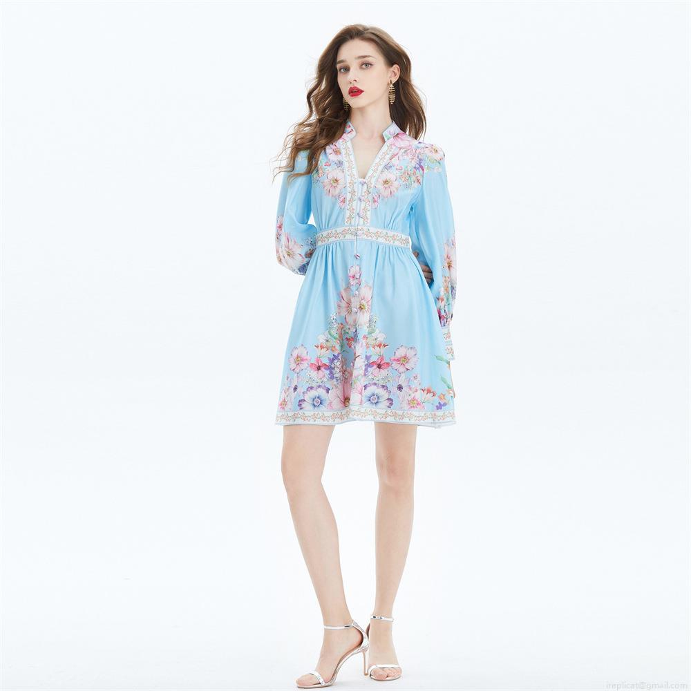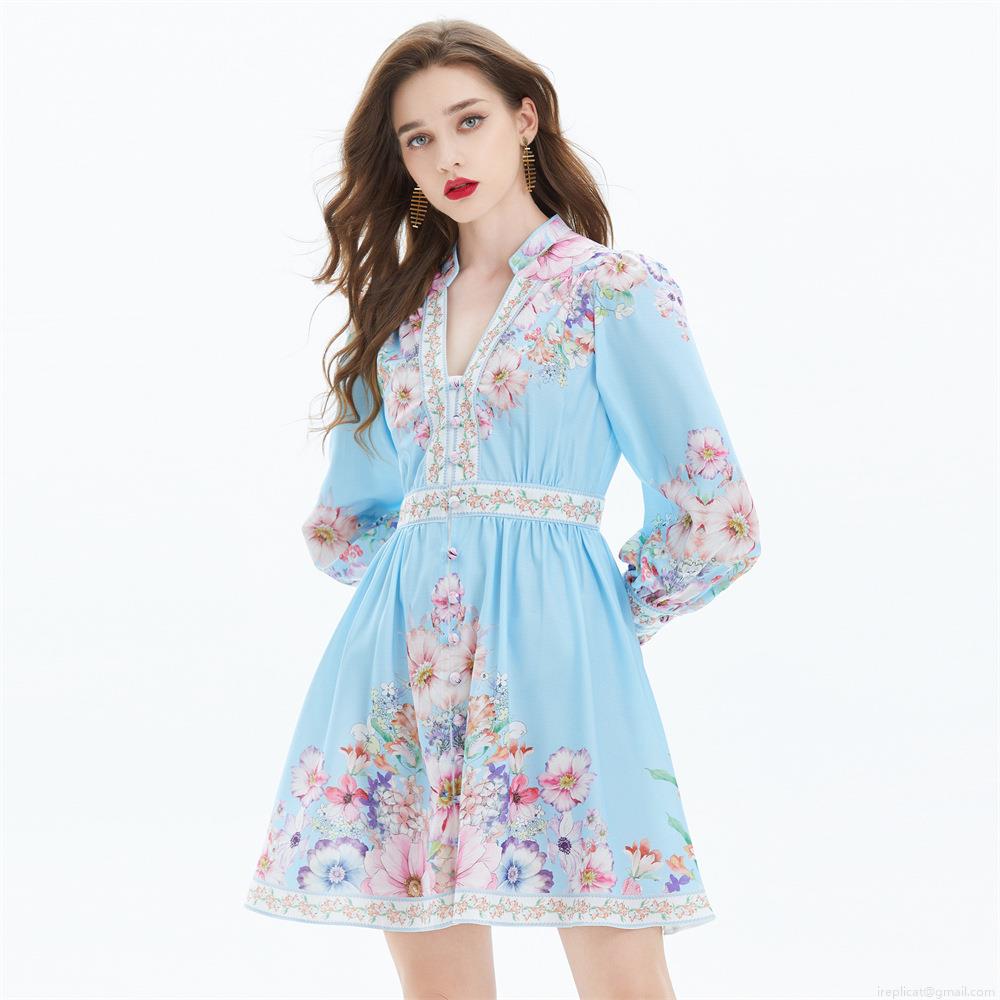 • Women's Elegant Light Blue Floral Print Mini Dress Palace Style V-Neck Lantern Sleeve Waist-Tightening Short Dress For Summer Autumn Vacation Party