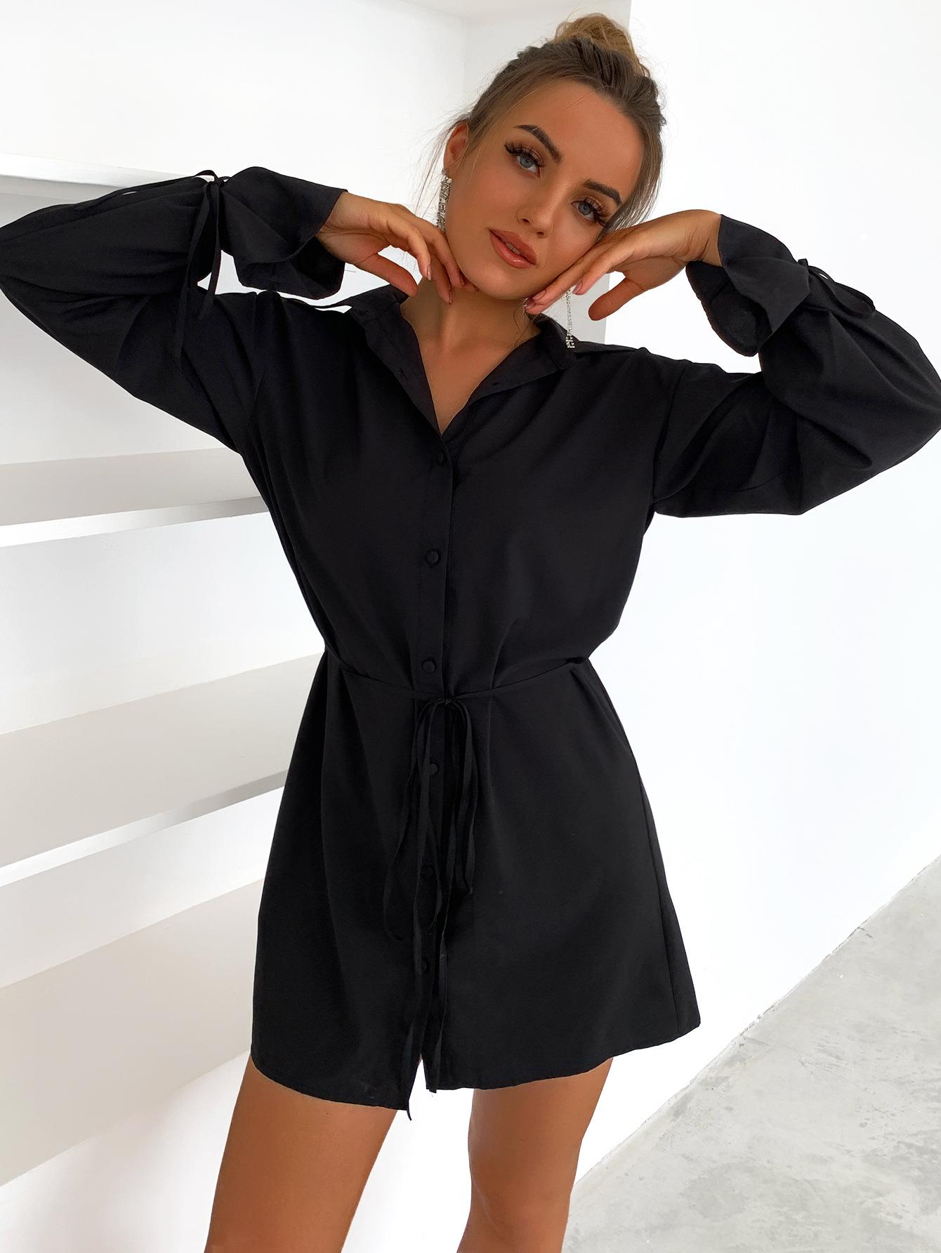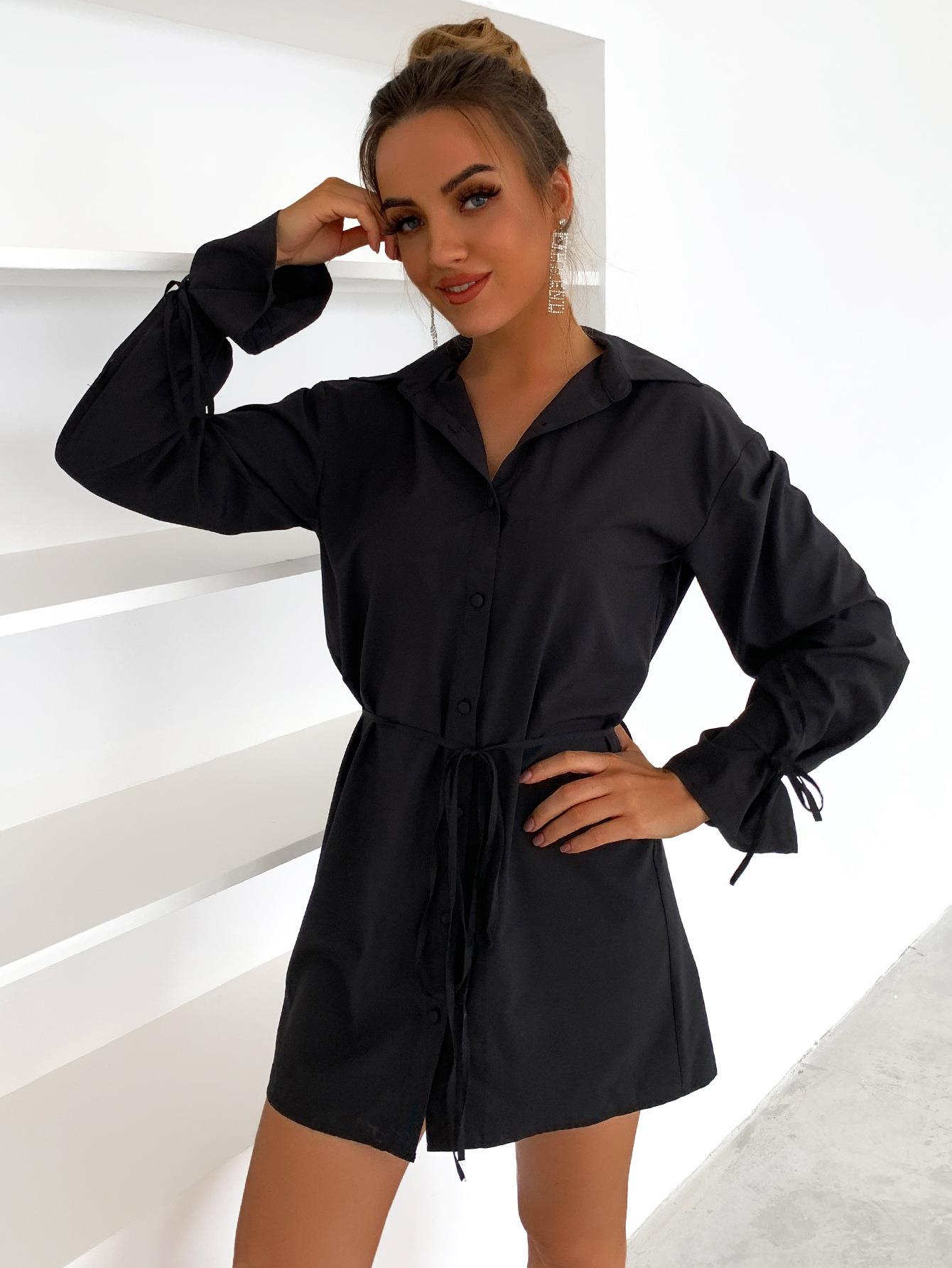 • Women's Elegant Long Sleeve Shirt Dress Solid Color V-Neck Waist Tie Button Down Mini Dress Casual Streetwear Fashion Dress For Office Party