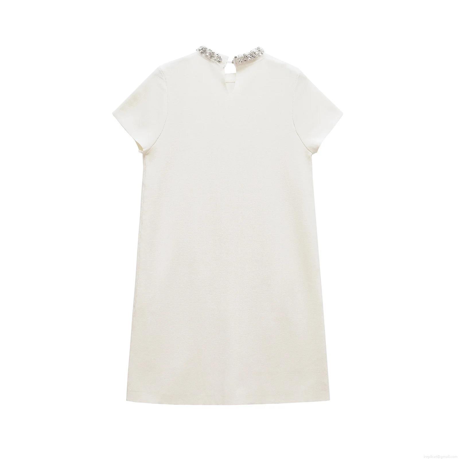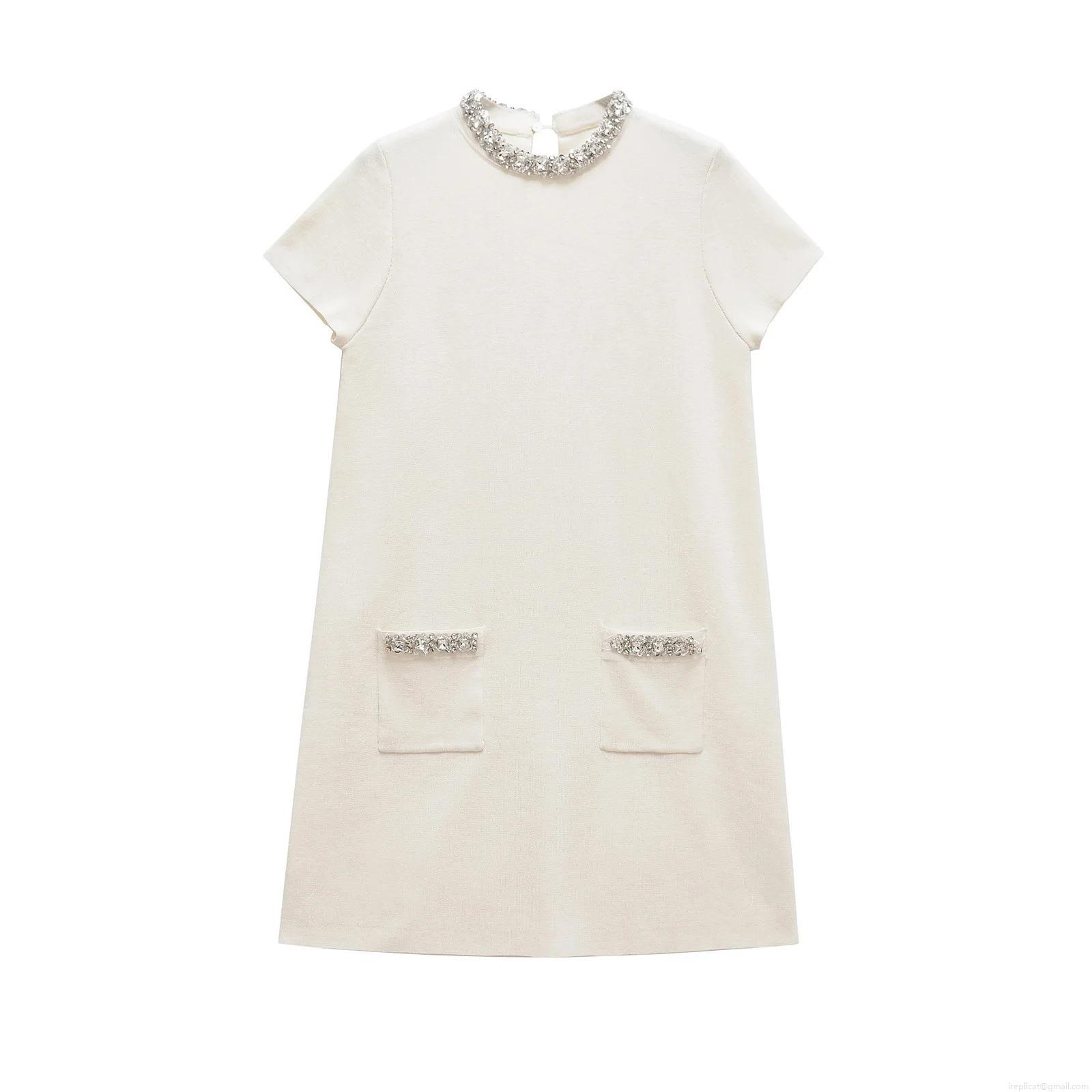 • Women's Elegant Mercerized Cotton Short Sleeve Dress Heavy Rhinestone Beaded Pocket Detail A-Line Mini Dress For Party Banquet Celebrity Style