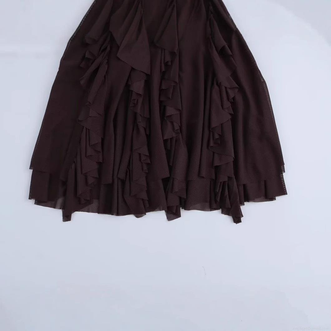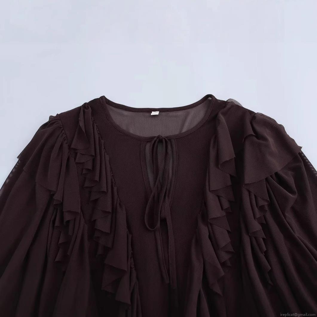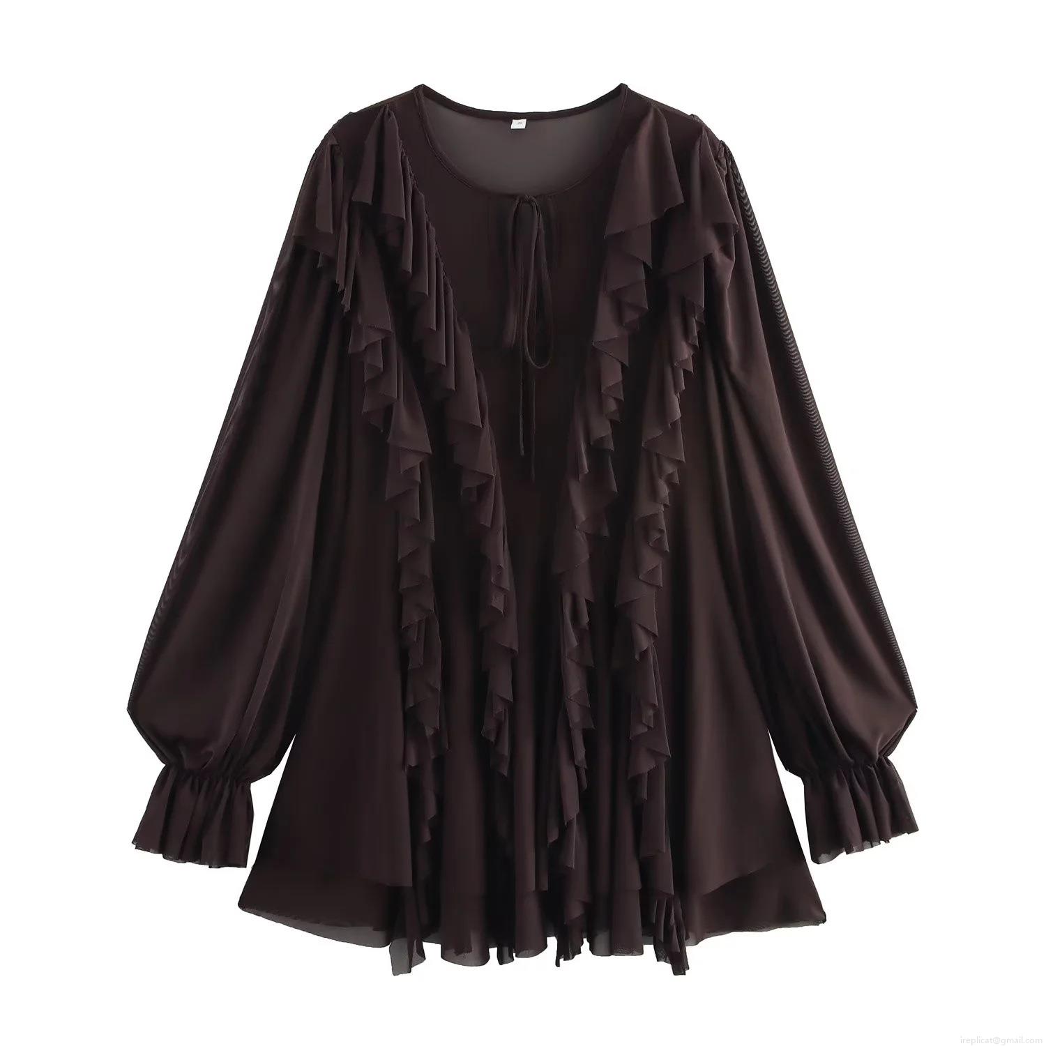 • Women's Elegant Mesh Polyester Mini Dress Ruffle Tiered Layered Long Flare Sleeve Tie Neck Coffee Maroon Party Socialite Style Short Dress For Ladies