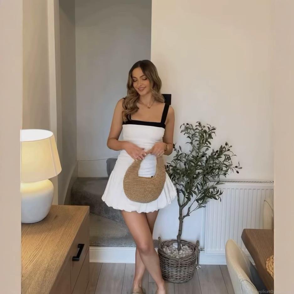 • Women's Elegant Mini Dress Black and White Contrast Square Neck Sleeveless Shirred Corset Style Bubble Hem Summer Party Dress
