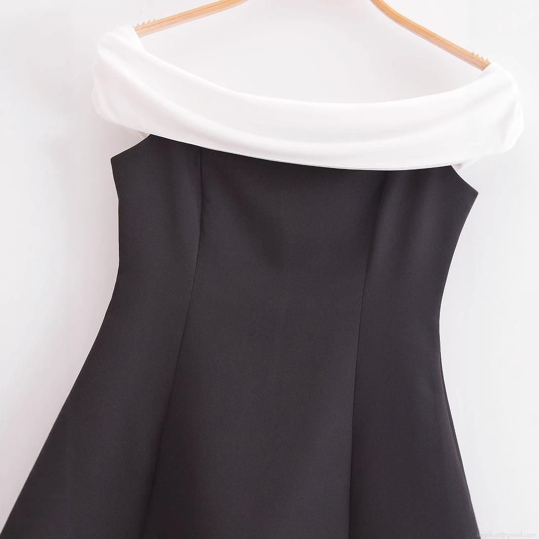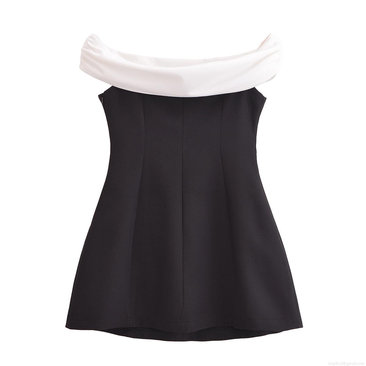 Women's Elegant Off-Shoulder Mini Dress Black White Contrast Splicing 100% Polyester Sleeveless Bodycon Party Dress Slim Fit Clubwear Lady