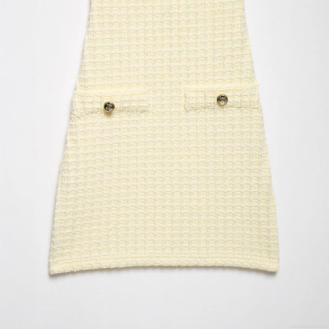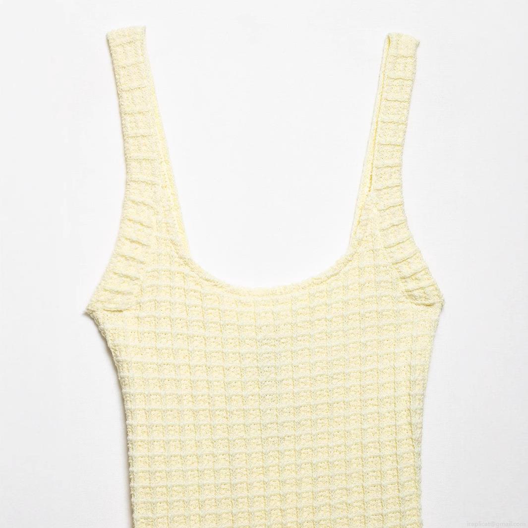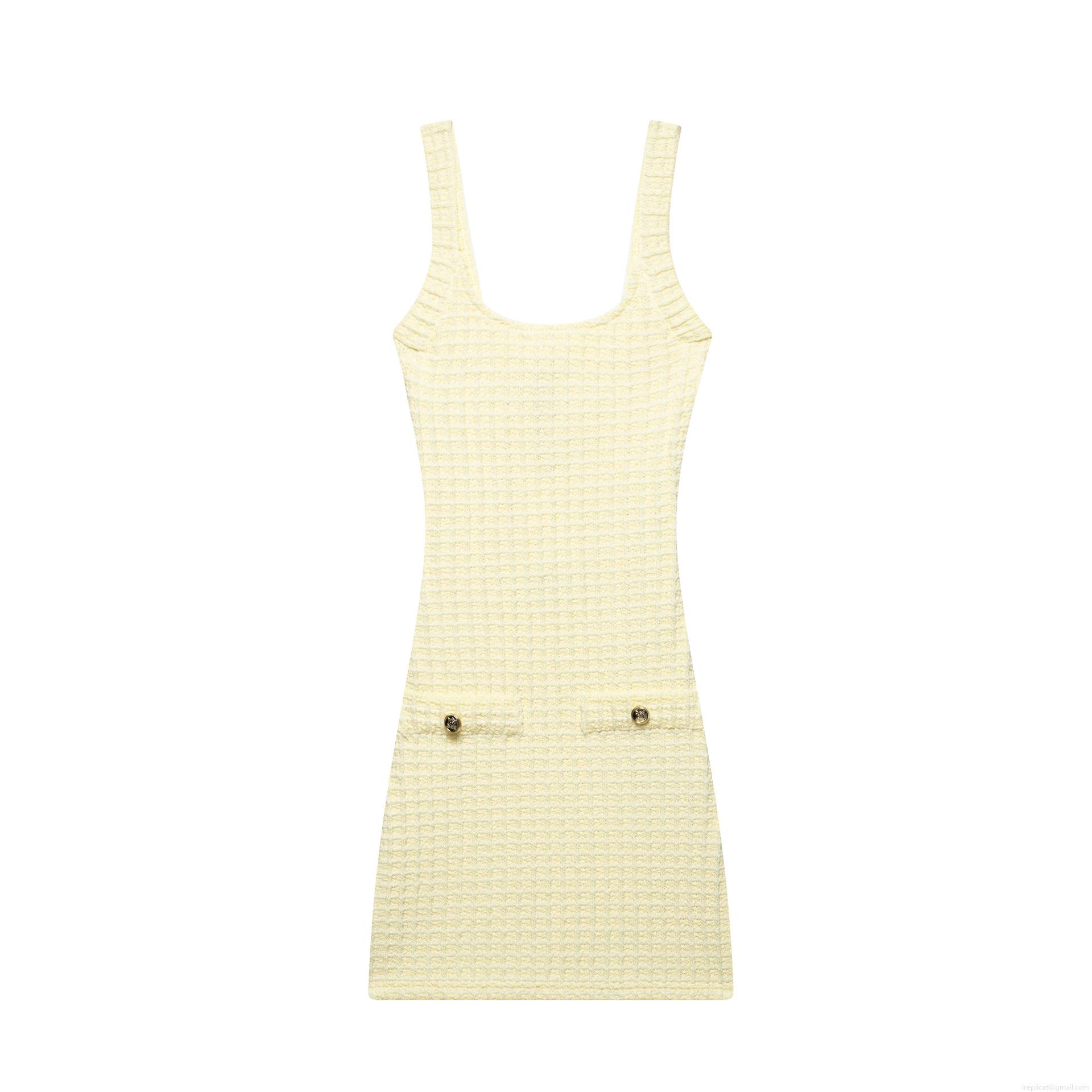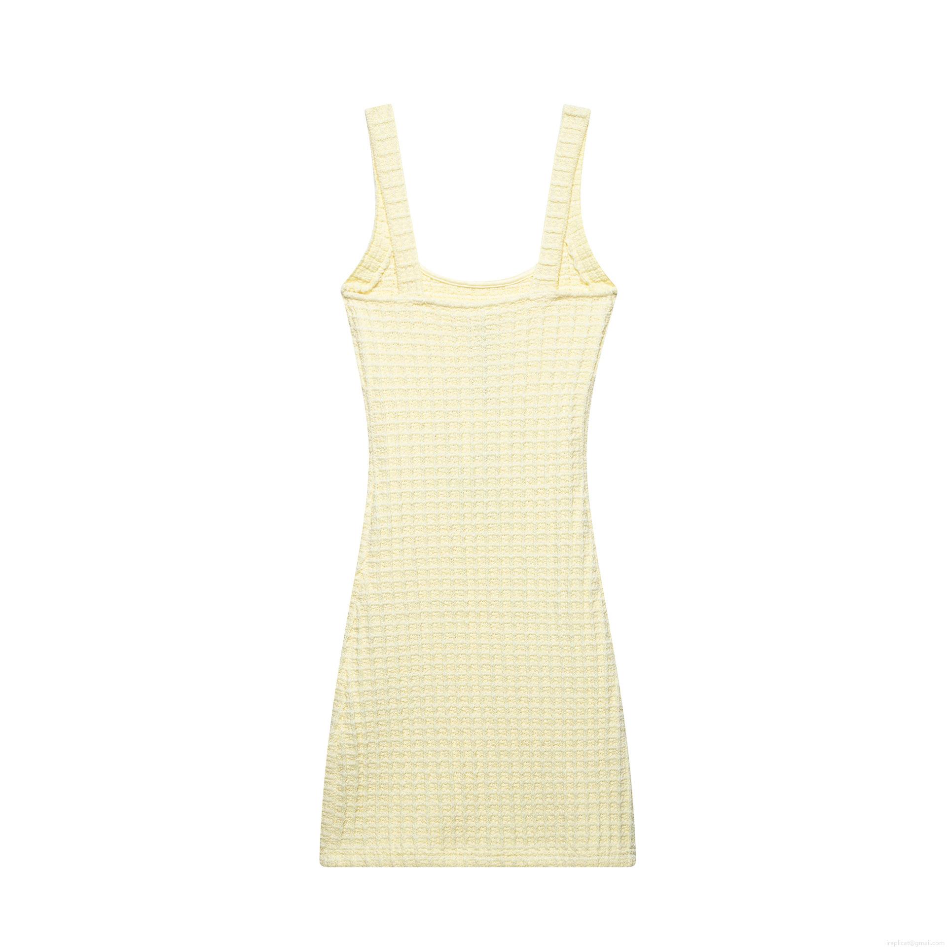 • Women's Elegant Pale Yellow Waffle Knit Mini Dress Square Neck Spaghetti Strap Slim Fit Bodycon Dress with Decorative Gold Buttons Summer Party Wear