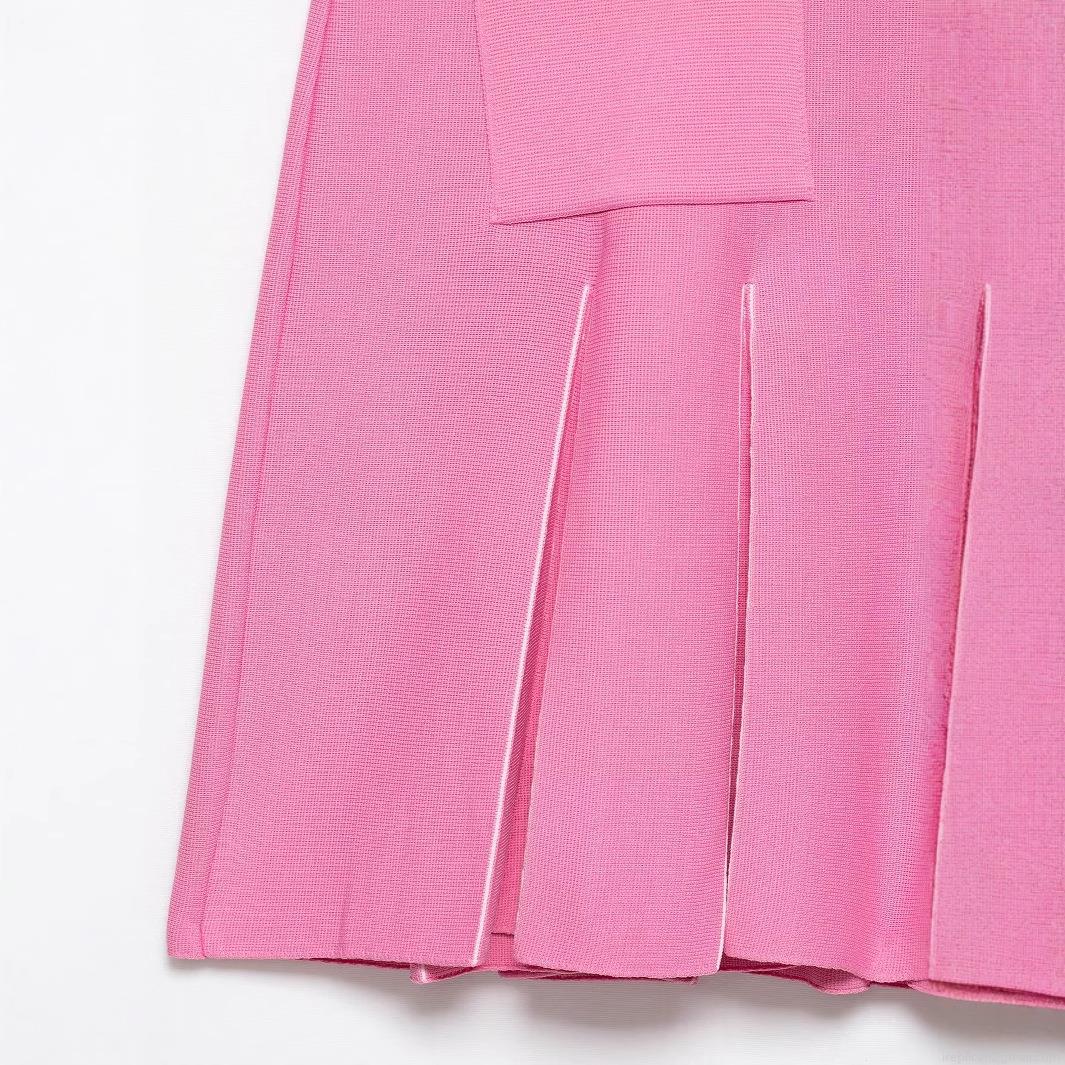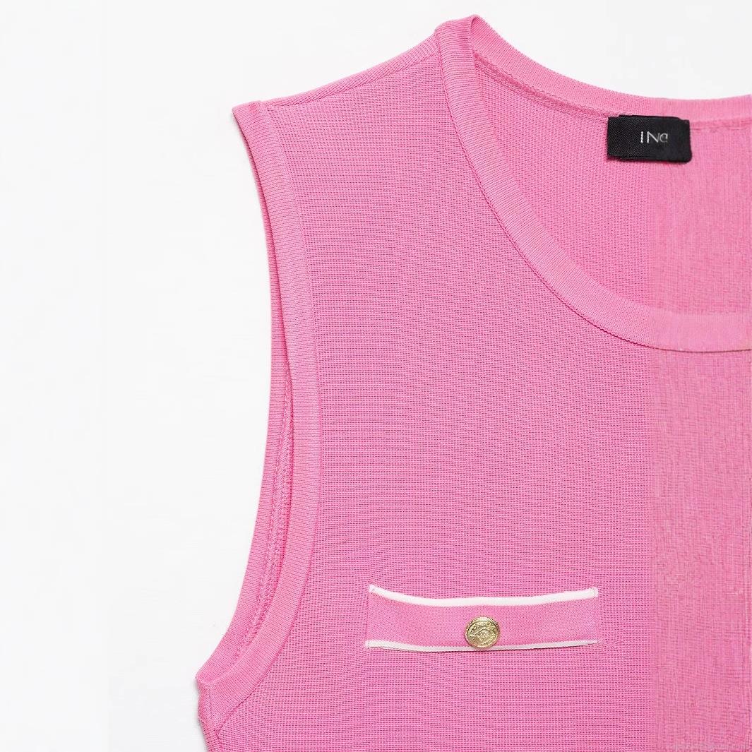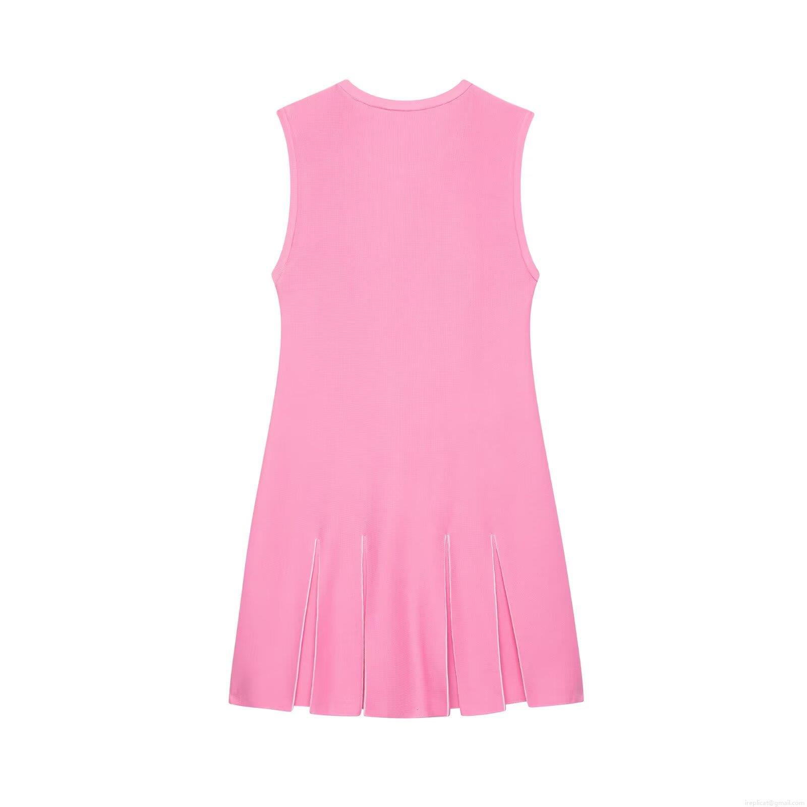 • Women's Elegant Pink Knit Mini Dress Sleeveless Round Neck Patchwork Pleated Hem With Decorative Golden Buttons Casual Party Sleeveless Dress For Women