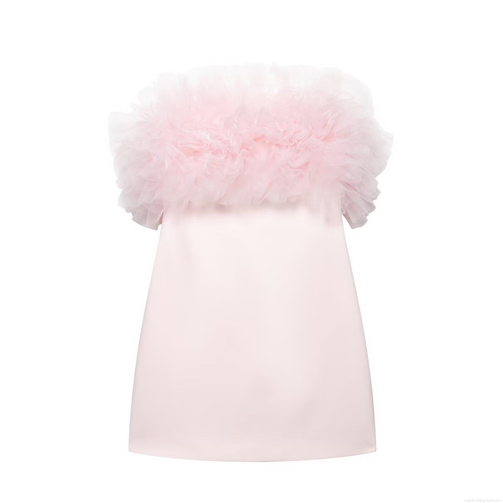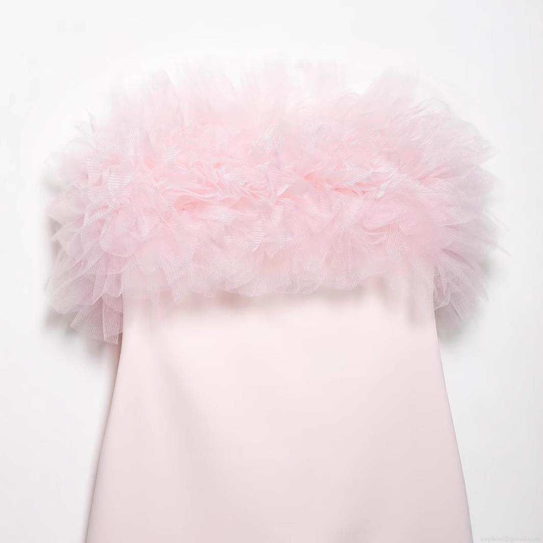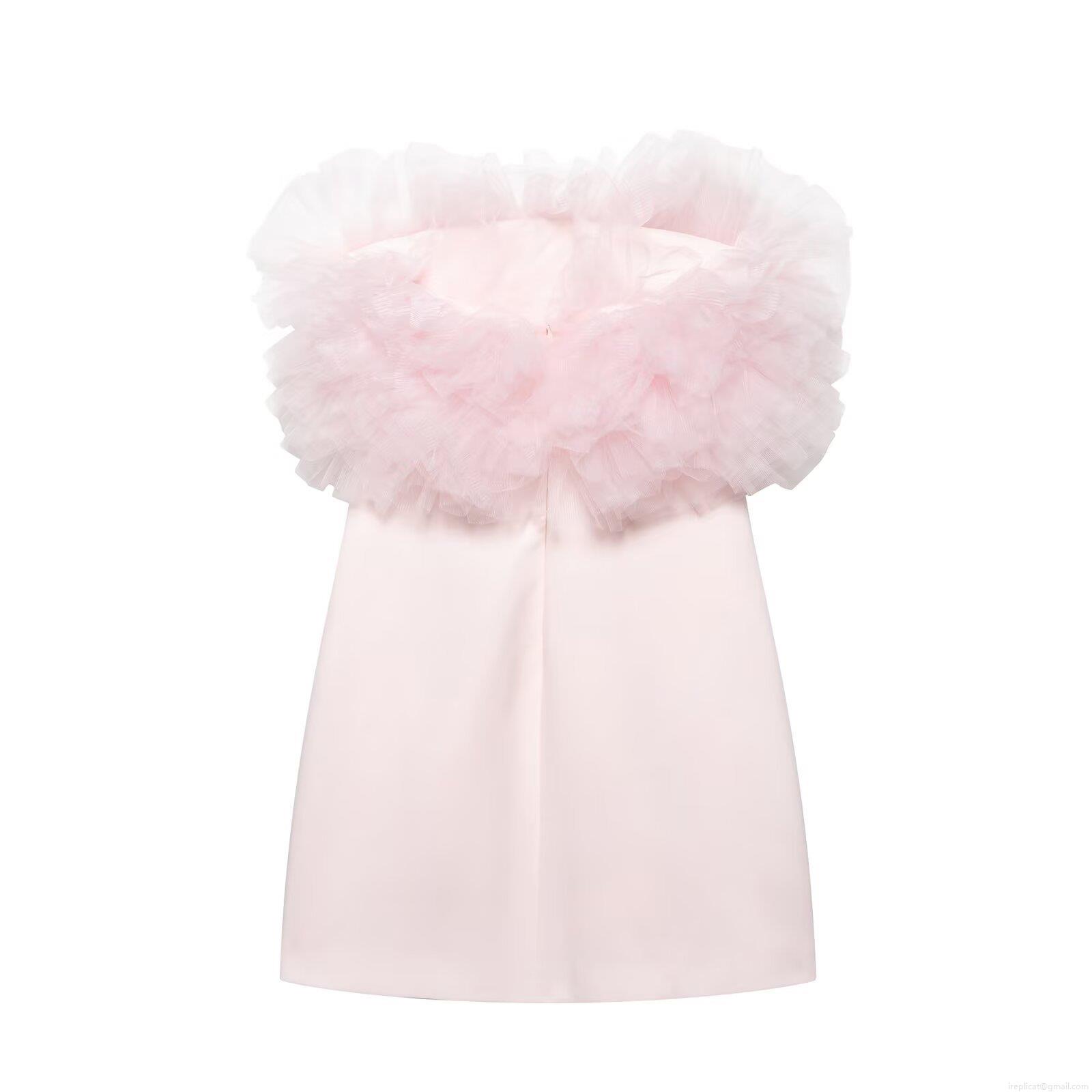 Women's Elegant Pink Mesh Tulle Satin Mini Dress Off-Shoulder Tube Top Ruffle Slim Fit Sleeveless Party Evening Prom Dress
