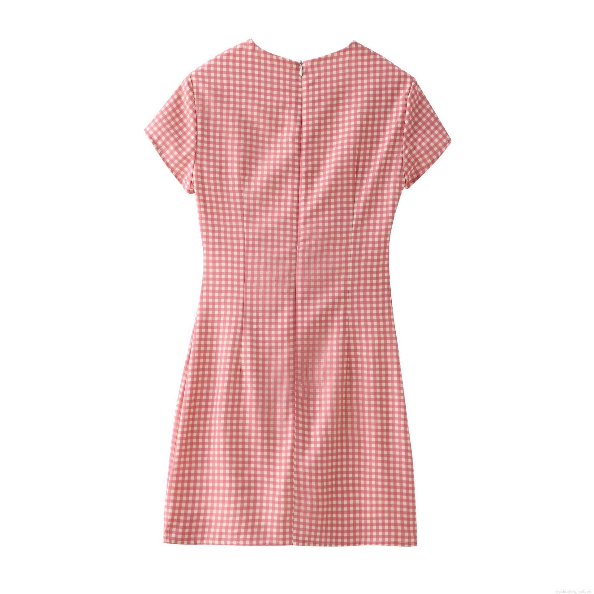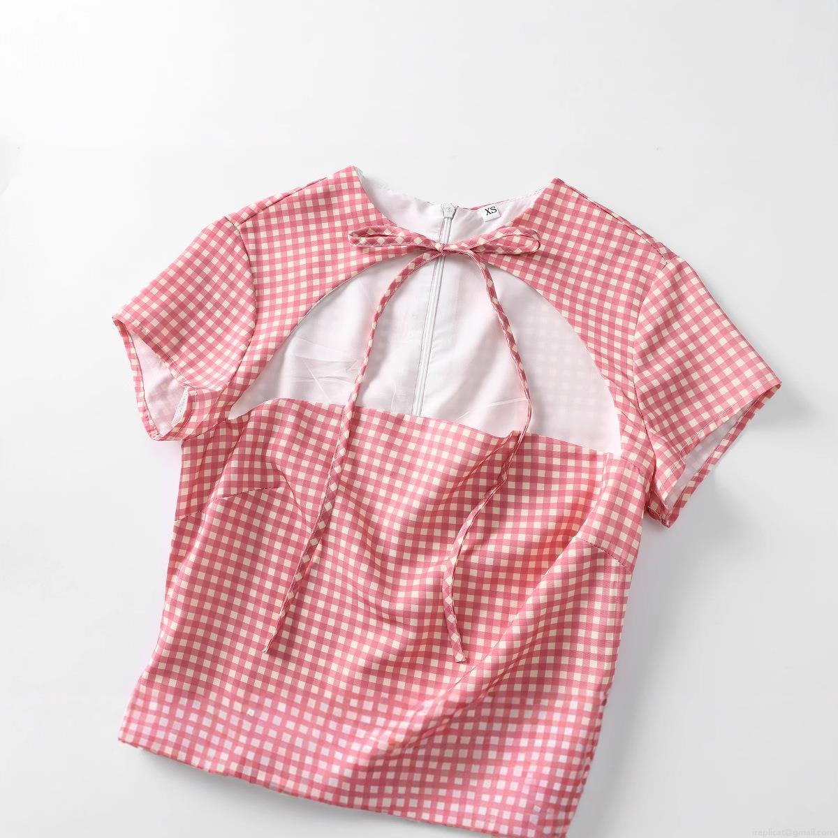 • Women's Elegant Pink White Gingham Mini Dress Round Neck Bow Cutout Back Short Sleeve Polyester Plaid A-Line Dress for Summer Daily Dating Lady