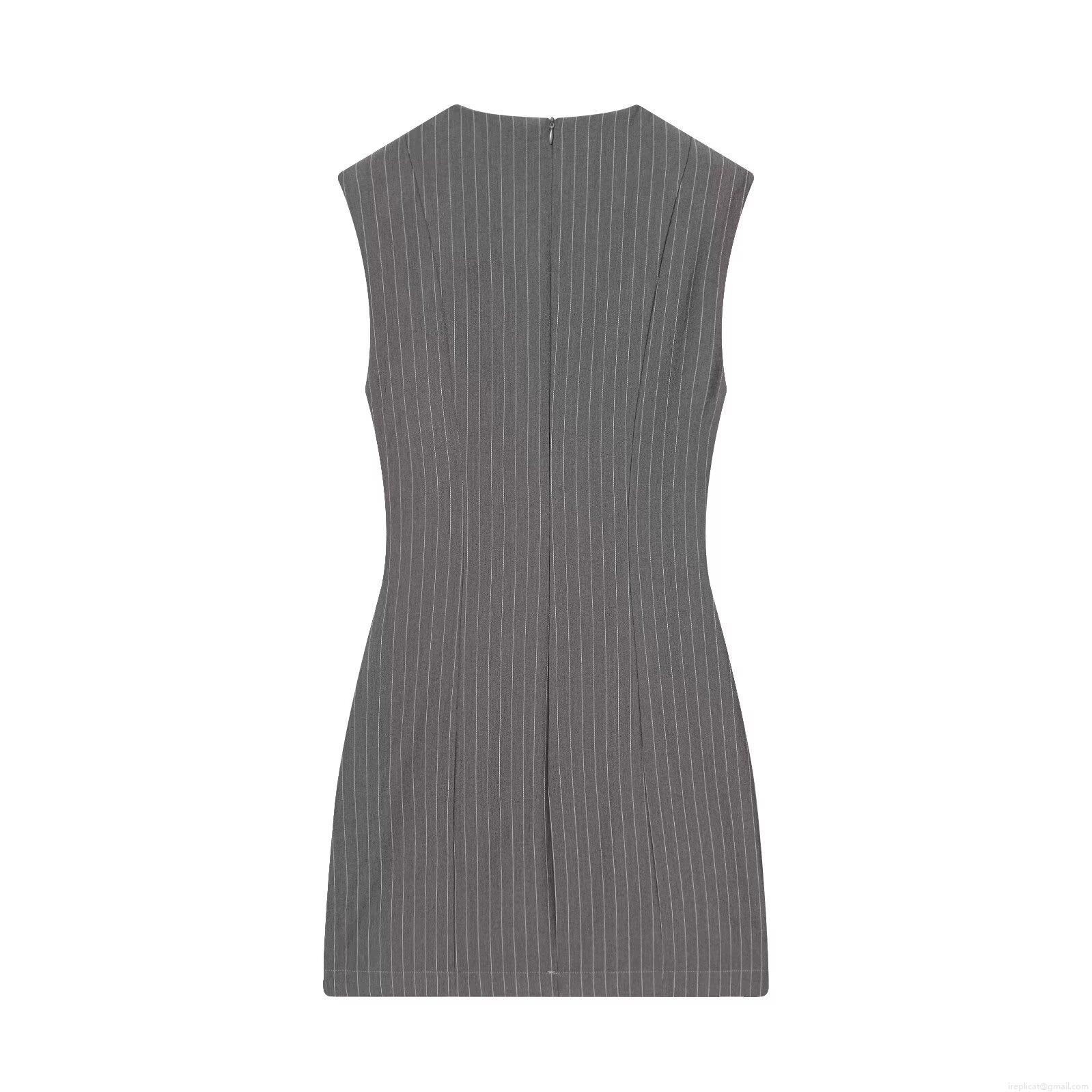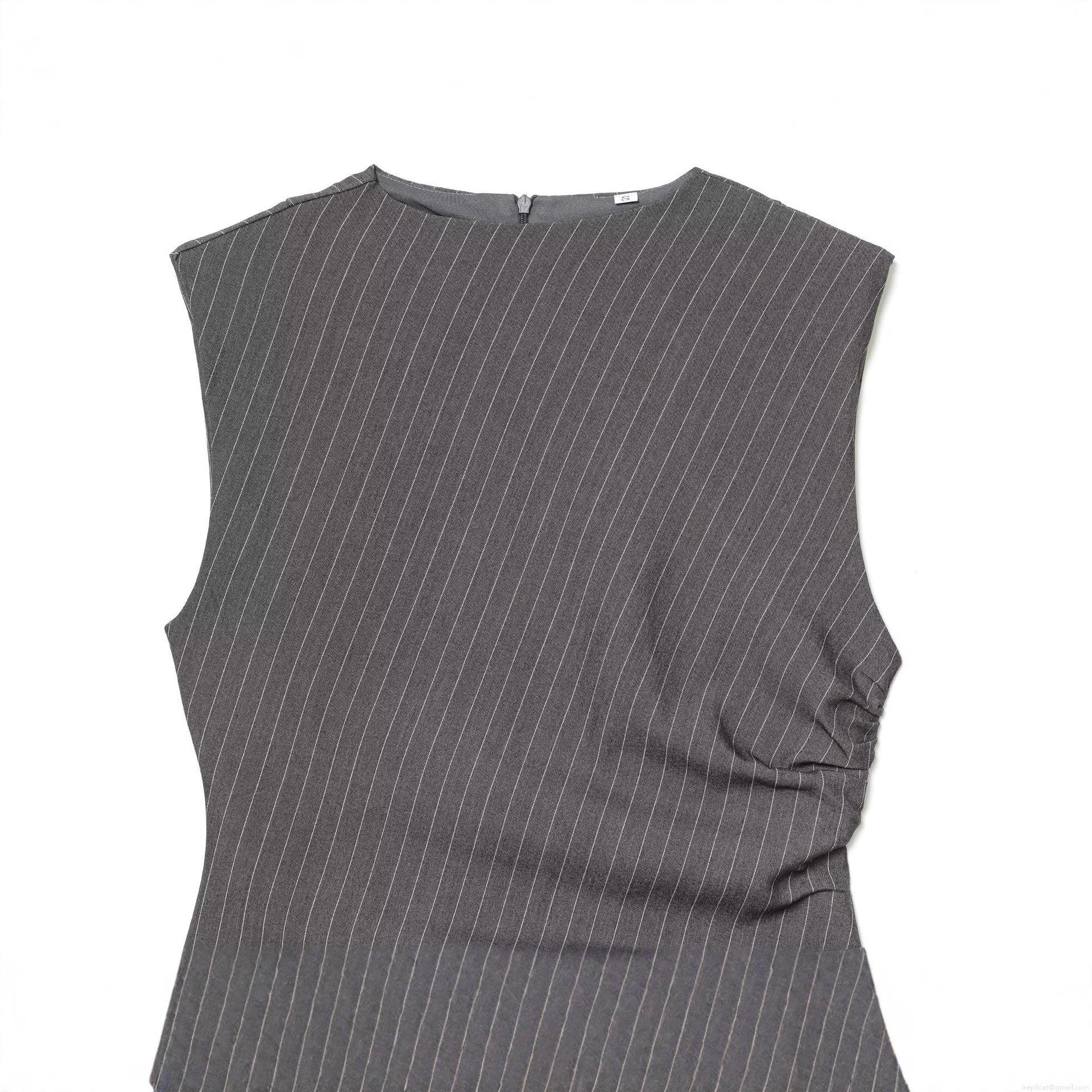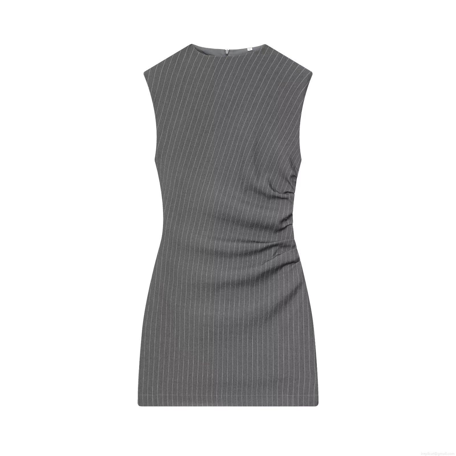 • Women's Elegant Pinstripe Sleeveless Mini Dress With Padded Shoulder Ruched Slim Fit Polyester Party Dress Office Wear