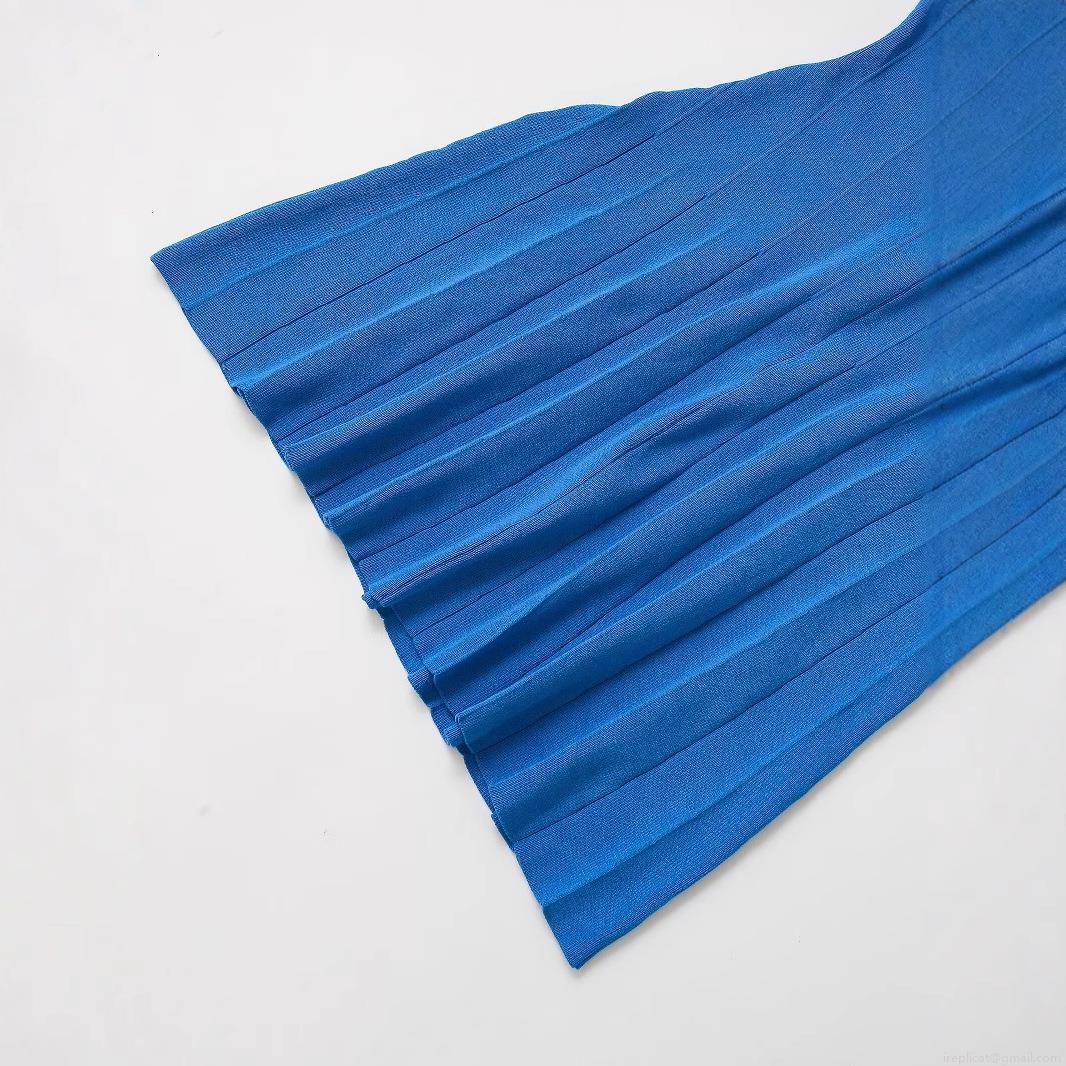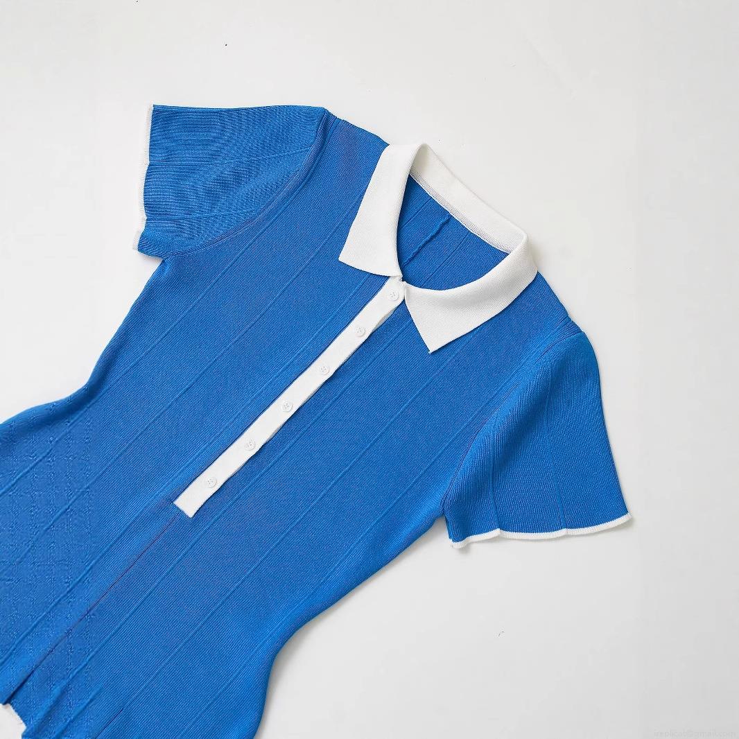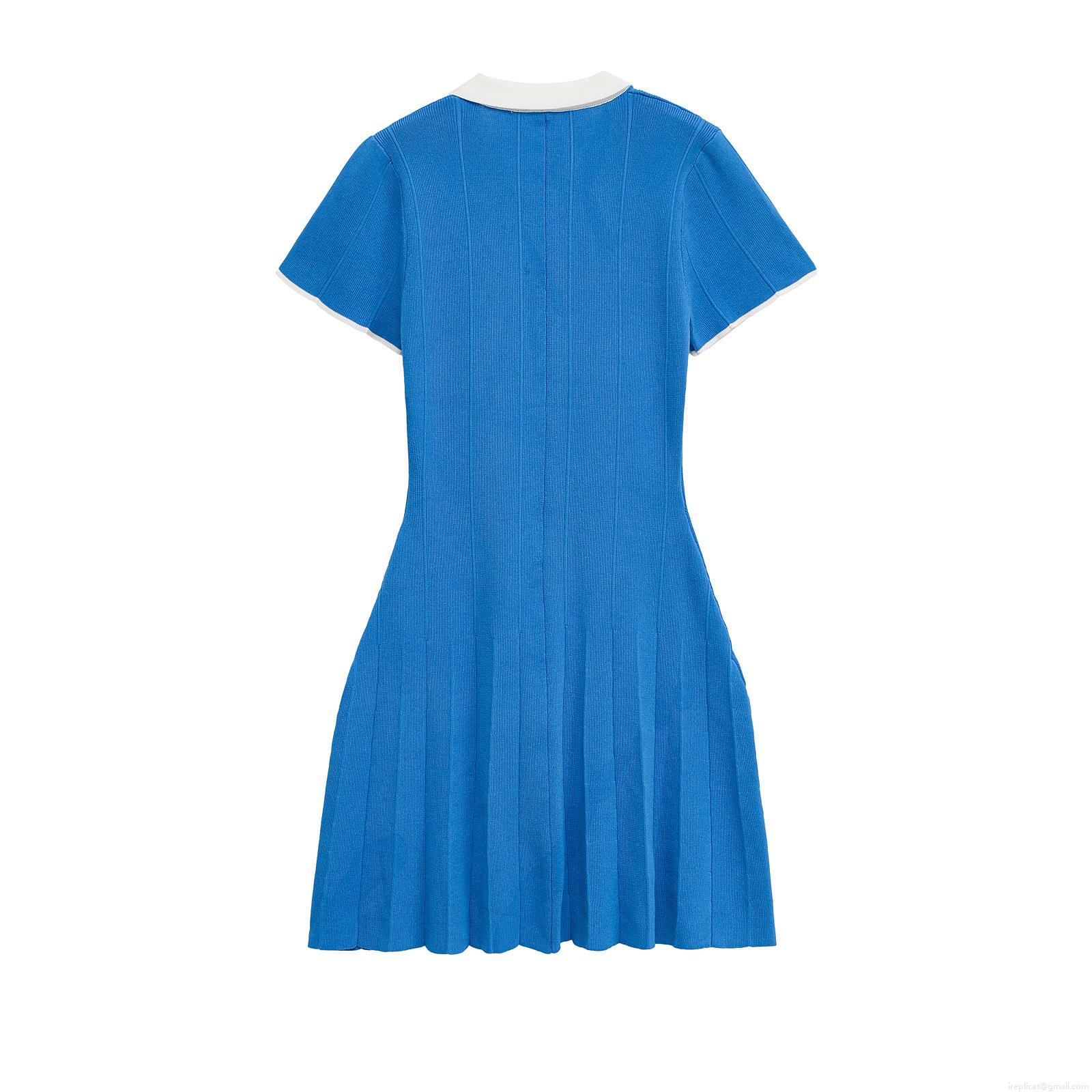 Women's Elegant Polo Collar Knit Mini Dress Contrast Trim Short Sleeve Pleated Tennis Dress Solid Blue Slim Fit Summer Casual Sporty Outfits