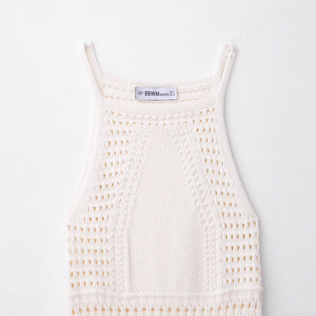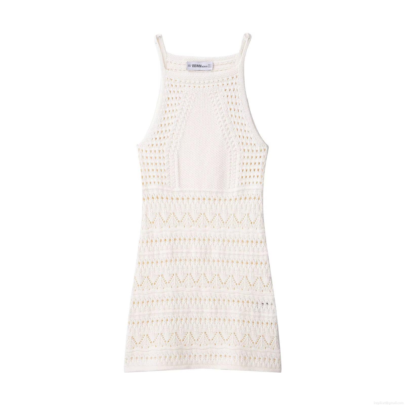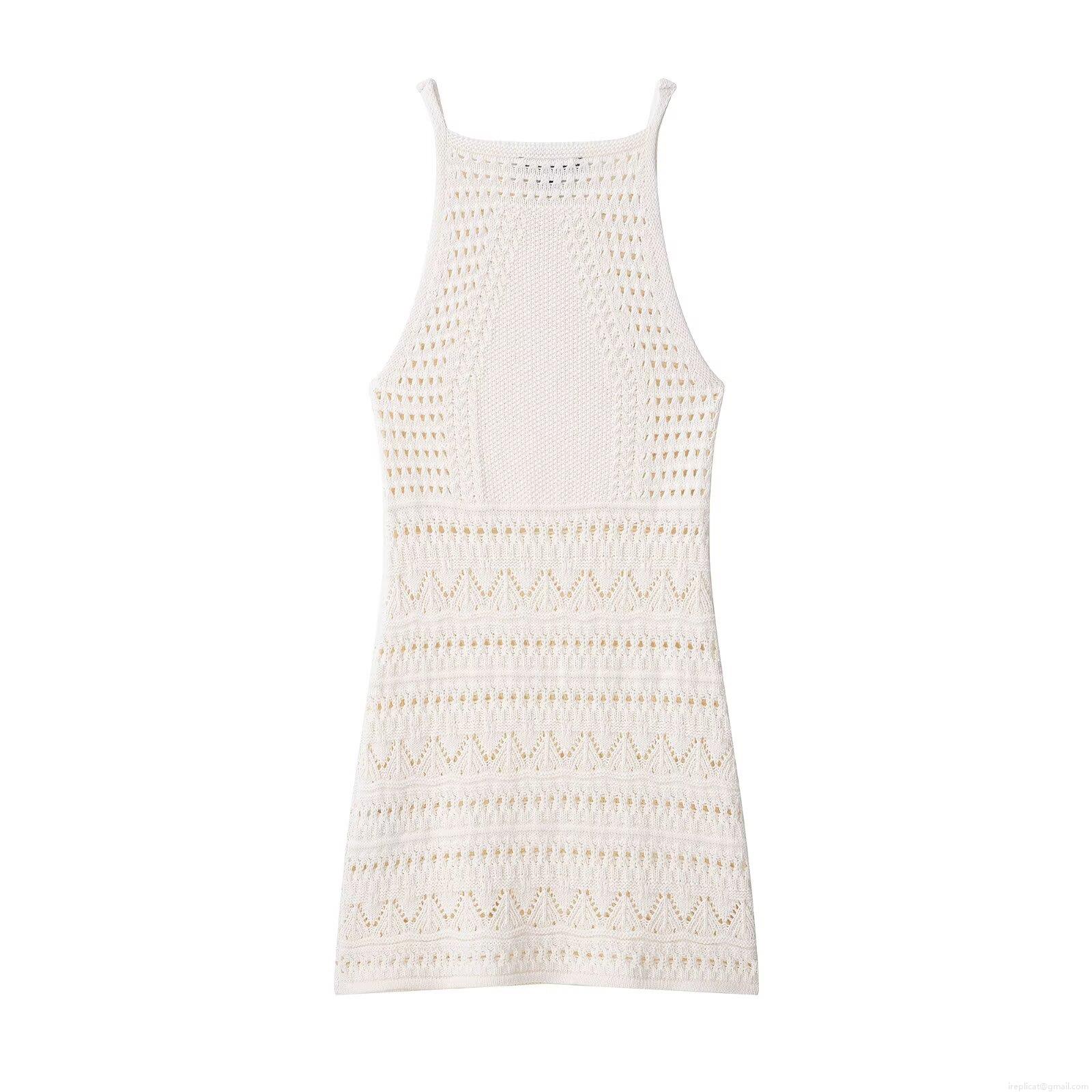 • Women's Elegant Polyester Crochet Halterneck Mini Dress Hollow Out Knit Slim Fit Backless Scalloped Edge Sundress for Summer Beach Party Vacation