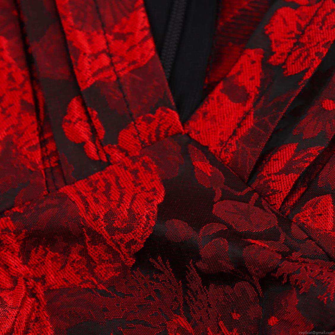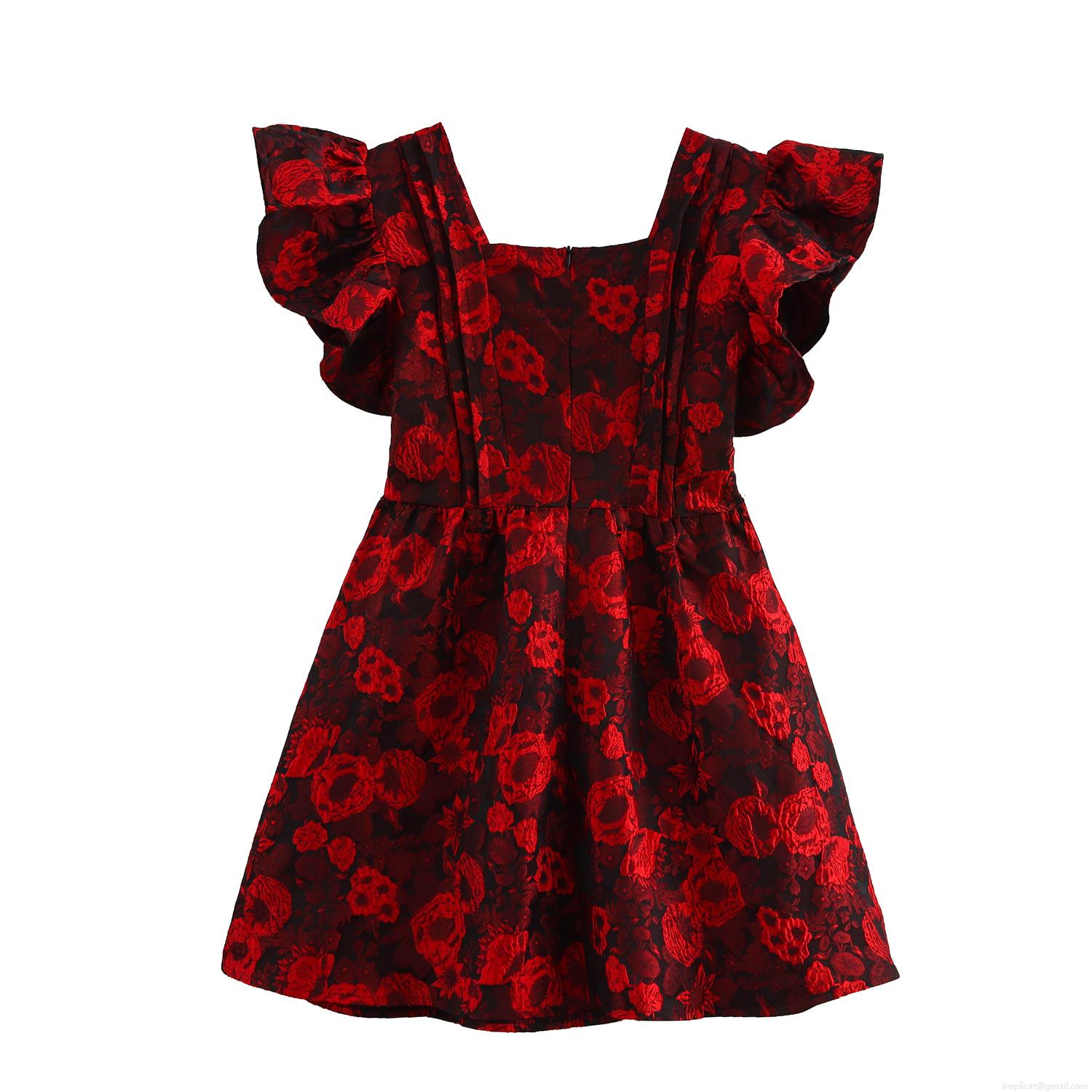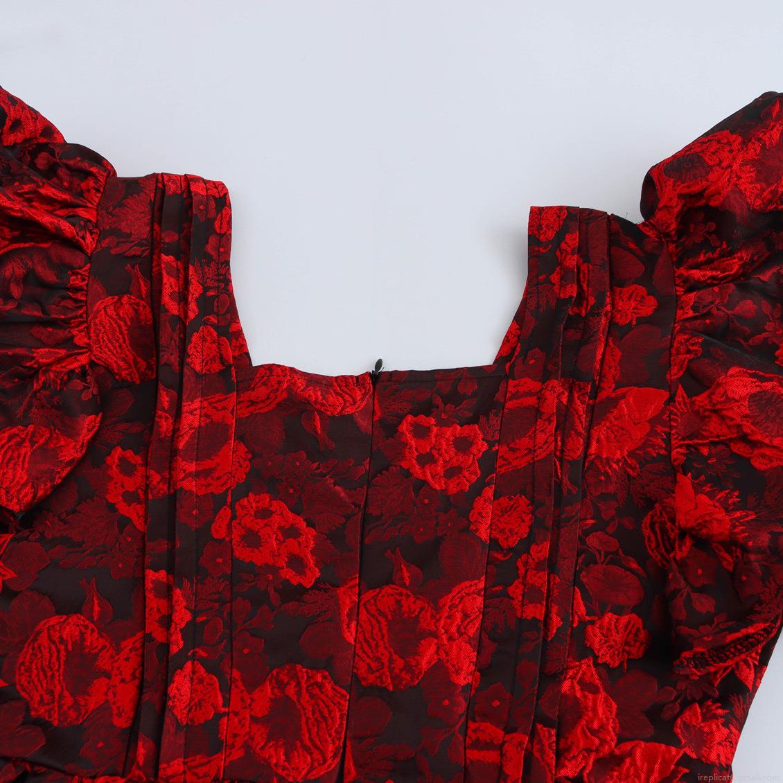 • Women's Elegant Red Floral Jacquard Mini Dress Vintage V-Neck Ruffle Fly Sleeve High Waist A-Line Party Dress with Back Zipper Closure for Ladies