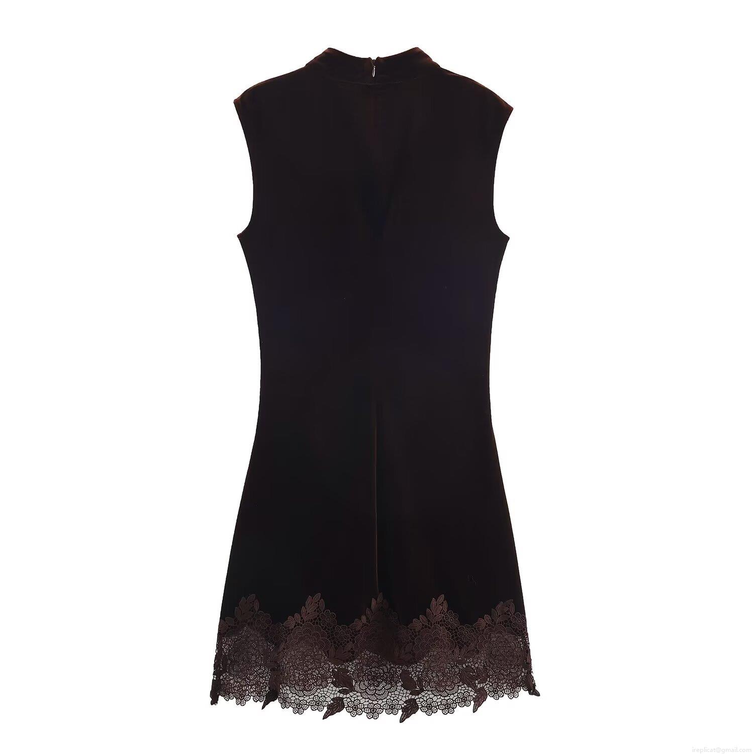 • Women's Elegant Reddish Brown Velvet Mini Dress Lace Patchwork Stand Collar Short Sleeve Bodycon Party Dress Slim Fit Evening Cocktail Gown