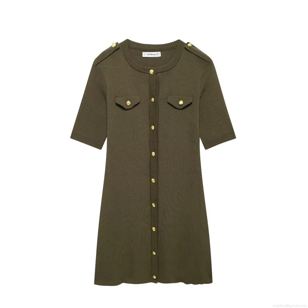 • Women's Elegant Ribbed Knit Mini Dress V-Neck Short Sleeve Gold Button Pocket Decor Olive Green Chic Sweater Dress For Autumn Winter