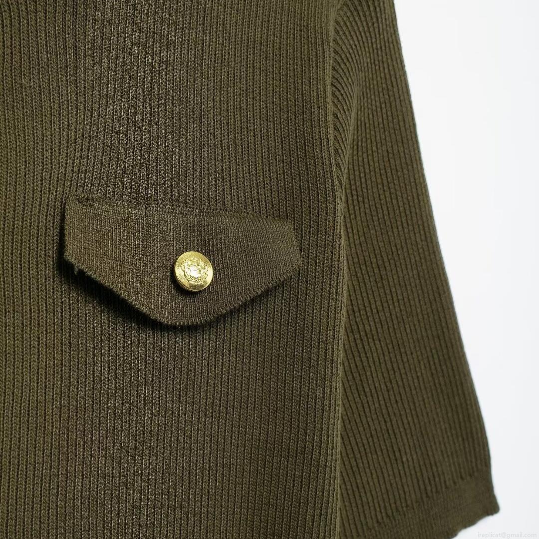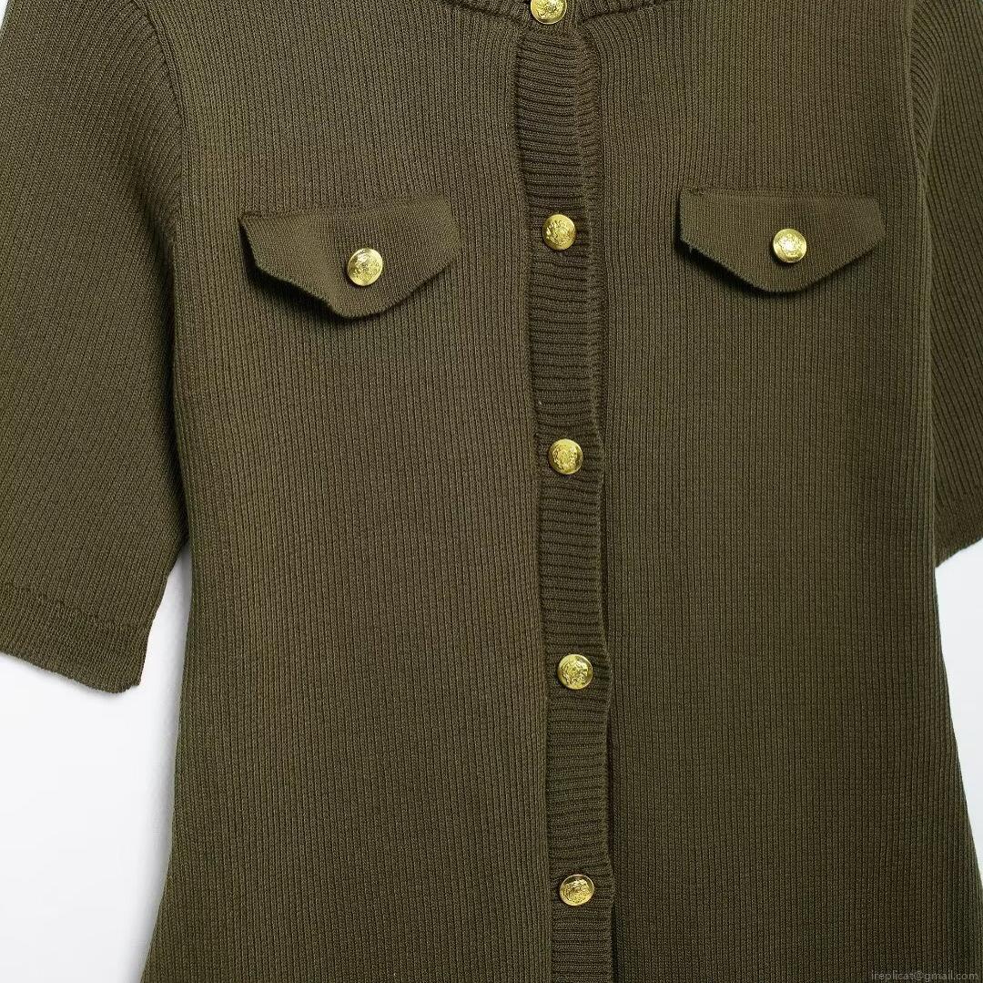 Women's Elegant Ribbed Knit Mini Dress V-Neck Short Sleeve Gold Button Pocket Decor Olive Green Chic Sweater Dress For Autumn Winter