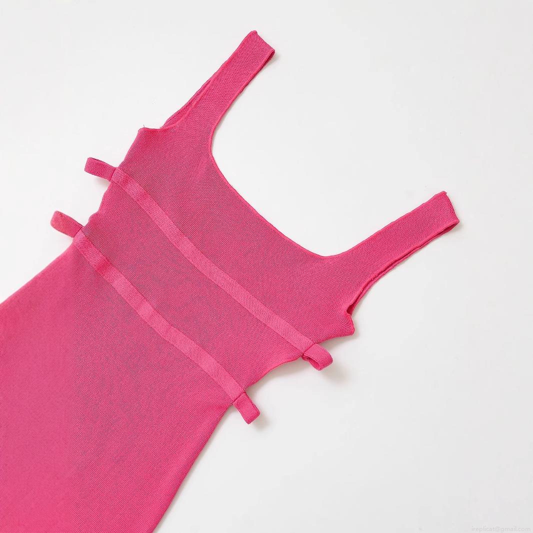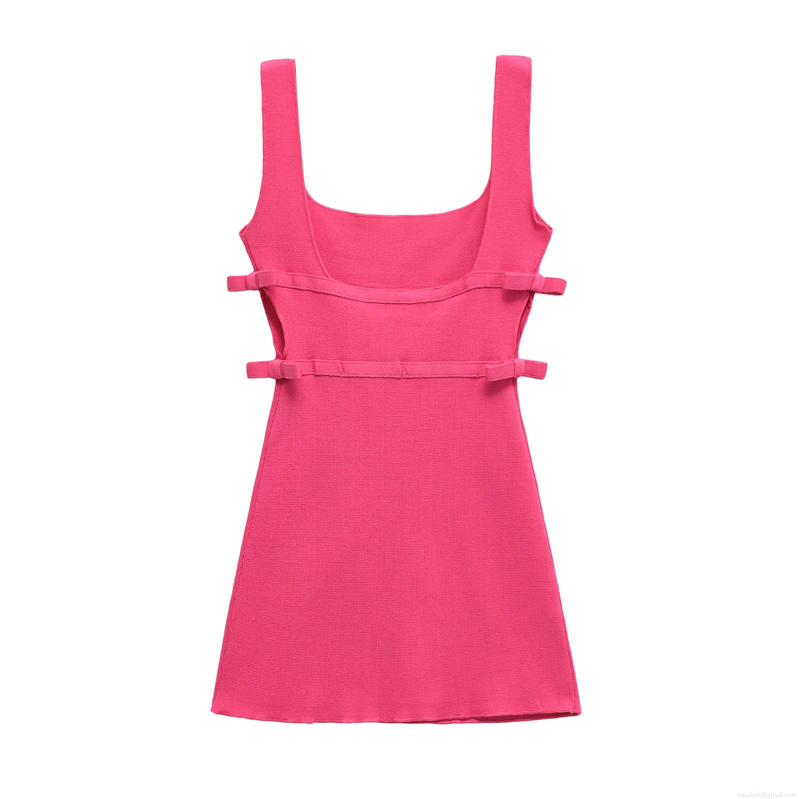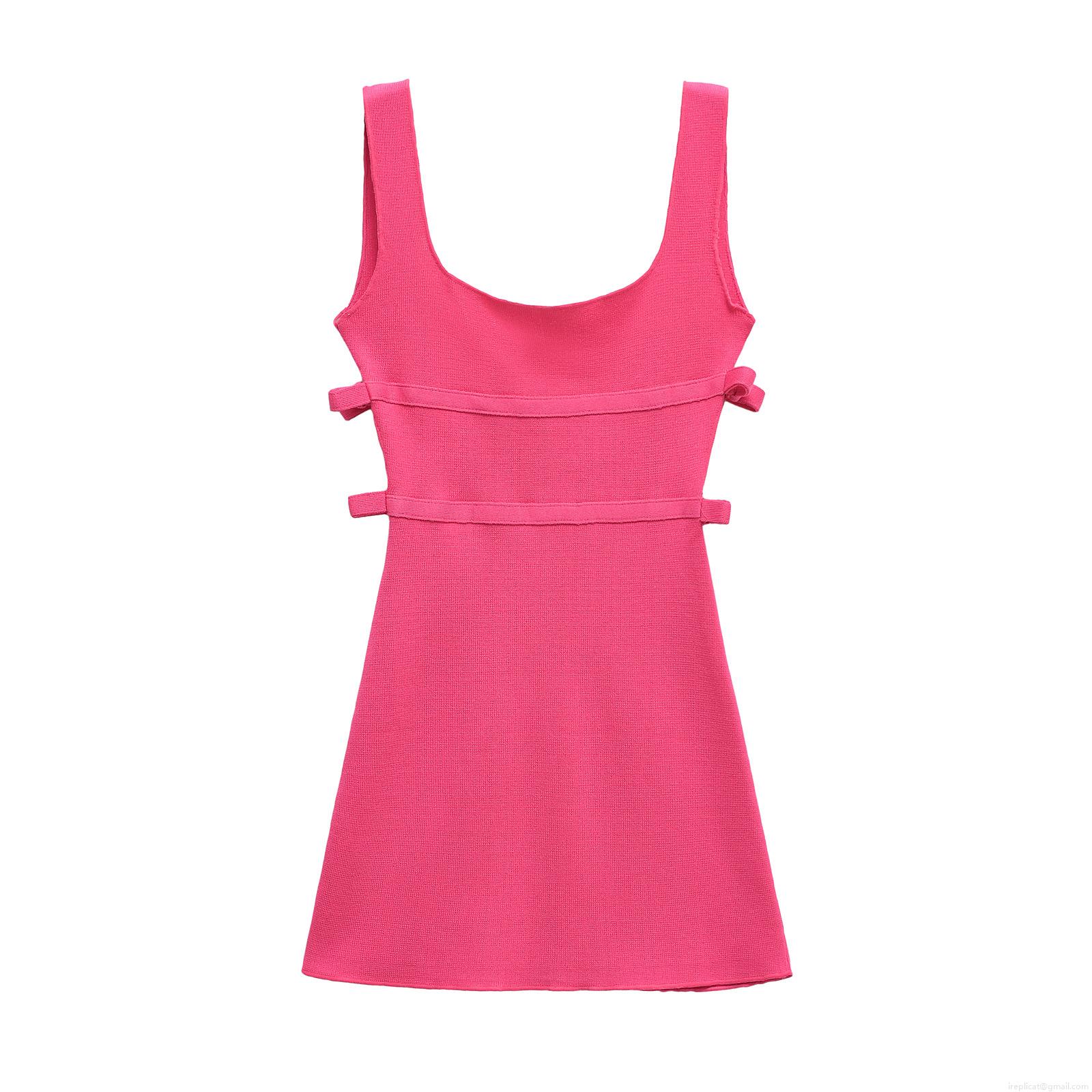 • Women's Elegant Rose Red Mercerized Cotton Knit Mini Dress Sleeveless Square Neck Side Cut-out Bow Detail Bodycon Party Dress