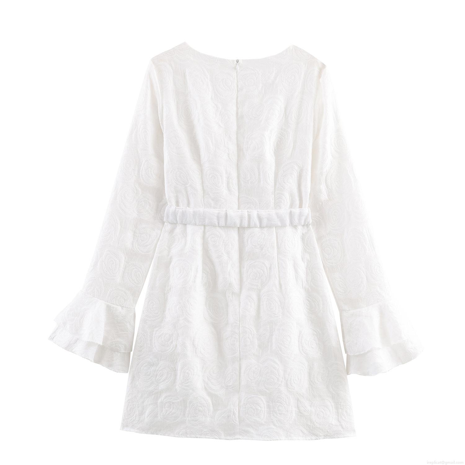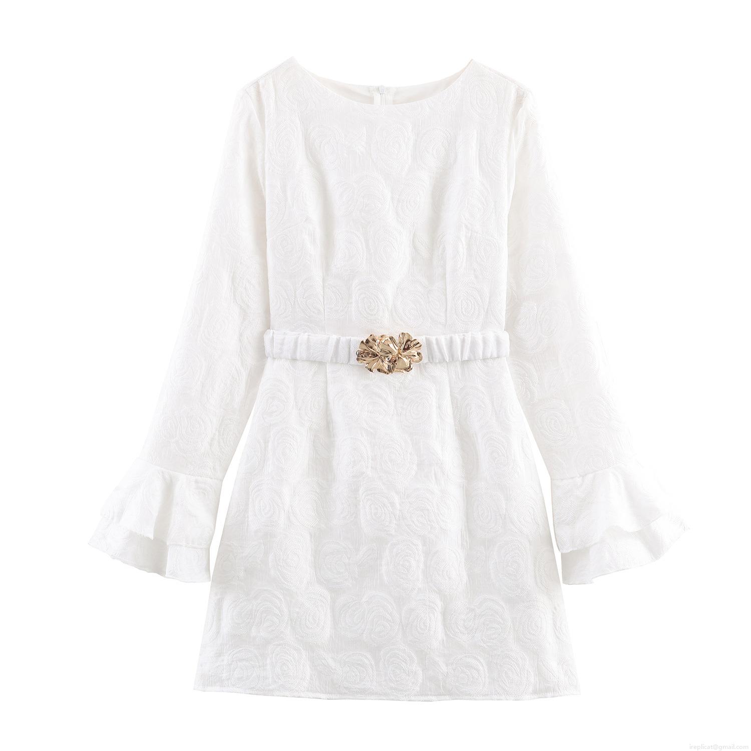 • Women's Elegant Rose Texture A-Line Dress With Gold Flower Buckle Belt Long Trumpet Sleeve Round Neck White Mini Dress For Party Daily