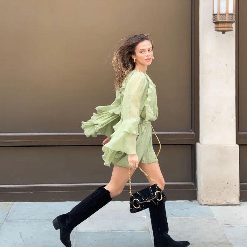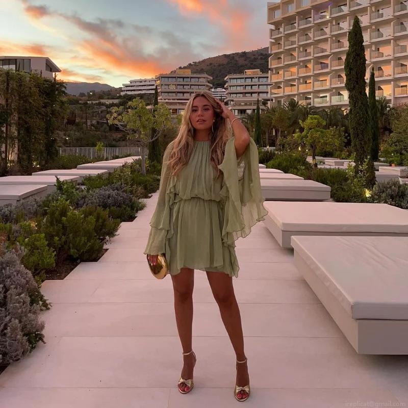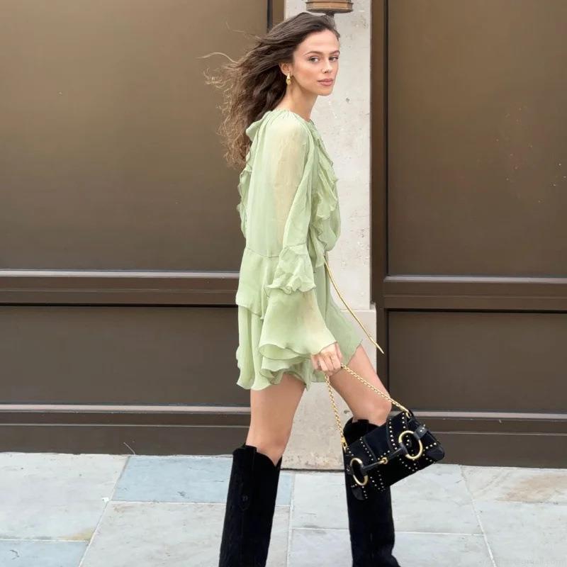 • Women's Elegant Sage Green Ruched Ruffle Mini Dress Sexy High Waist Flared Long Sleeve Layered Tiered Chiffon Short Dress For Party Vacation