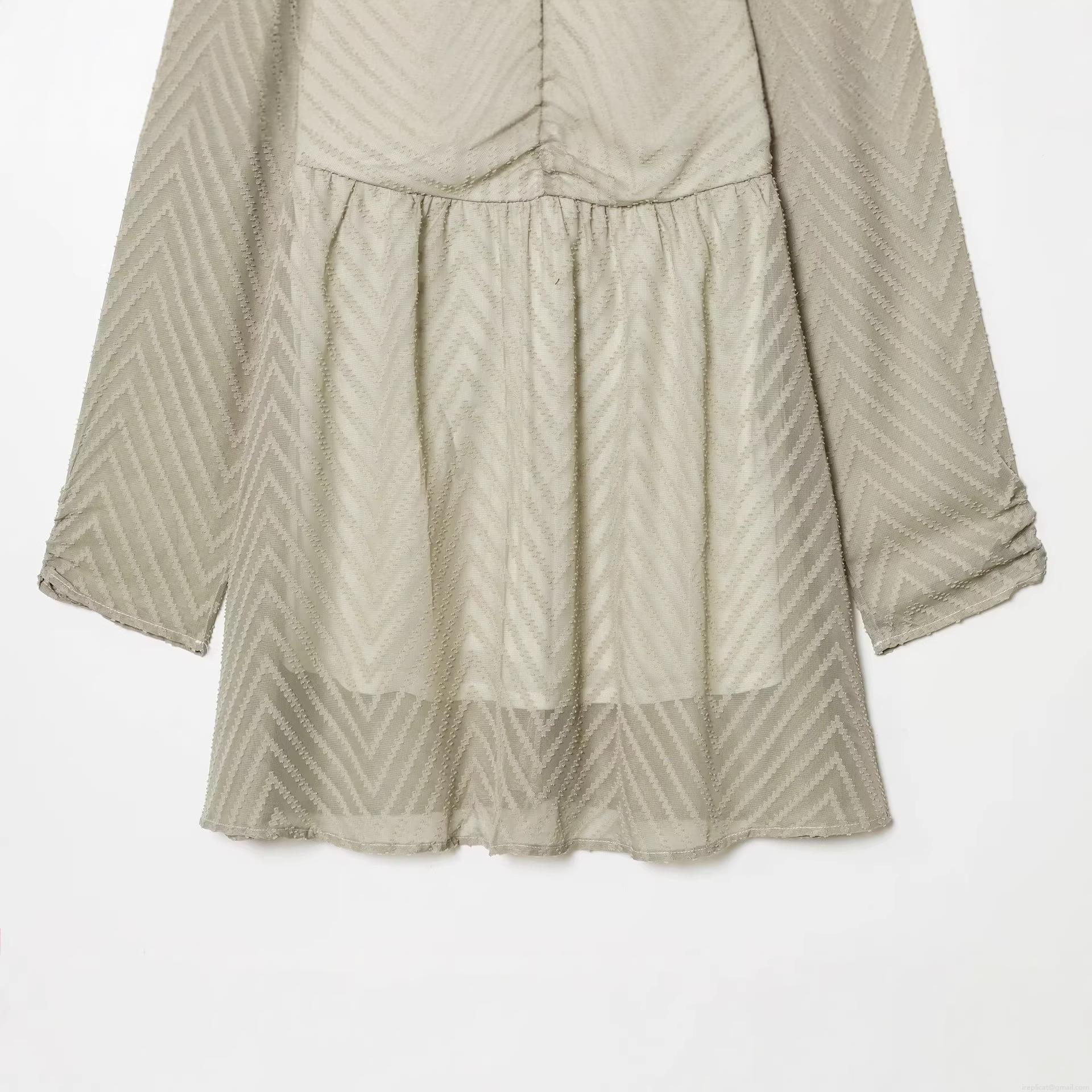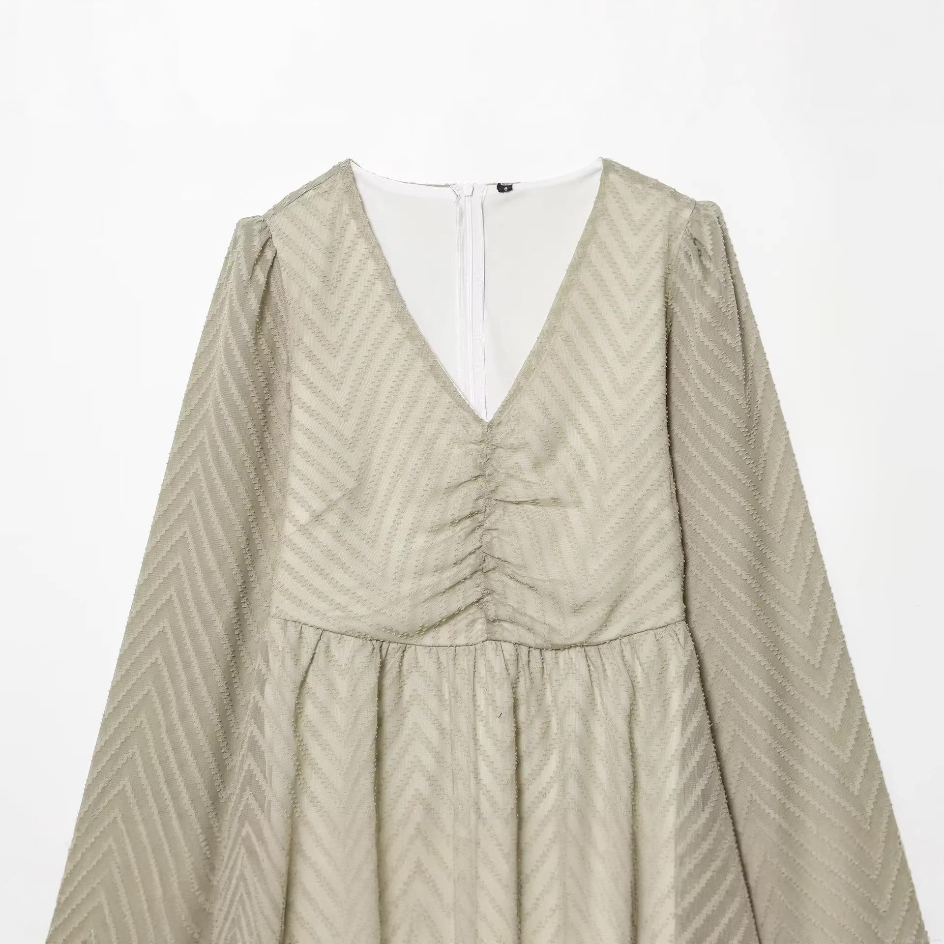 • Women's Elegant Sage Green V-Neck Long Sleeve Mini Dress Textured Chevron Jacquard Casual Flowy Short Dress For Spring Daily Dating Lady