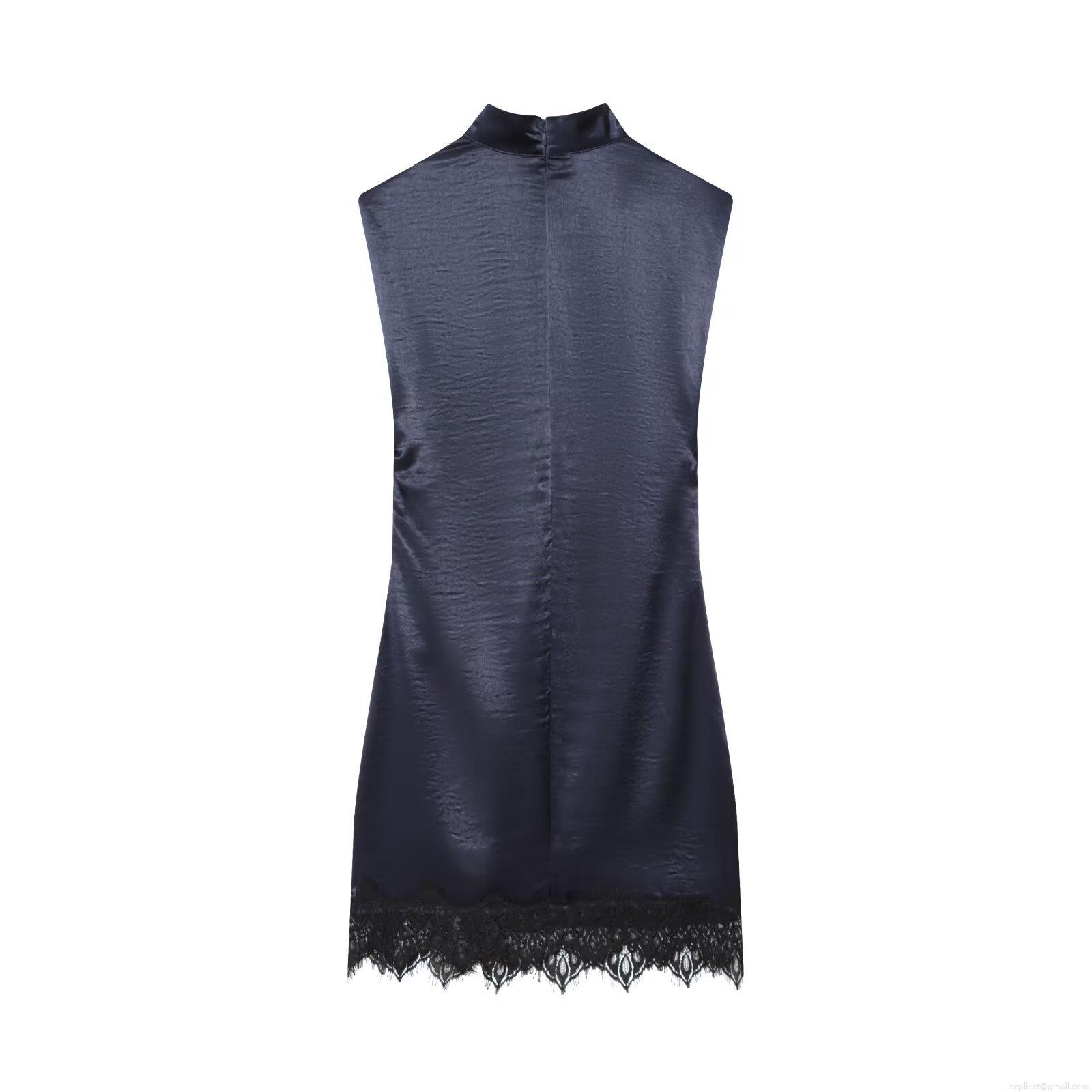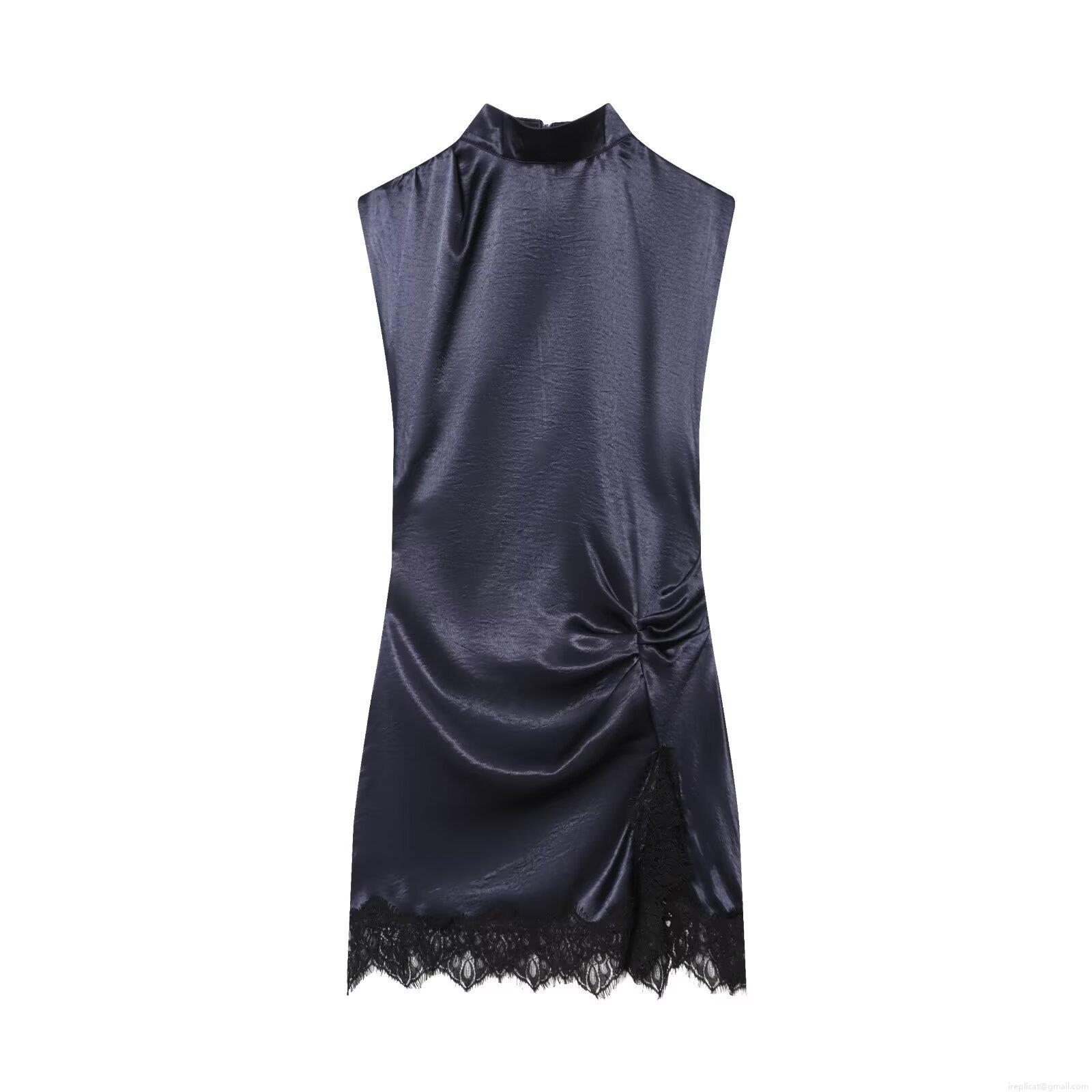 • Women's Elegant Satin Lace Patchwork Mini Dress Sexy Mock Neck Sleeveless Ruched Cocktail Party Bodycon Dress Slim Fit Evening Gown For Women