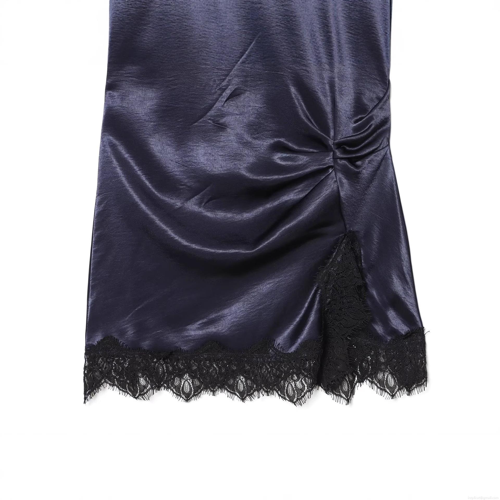 Solid Color, Pleats, Lace Patchwork, Side Fork, Satin Texture, Mock Neck