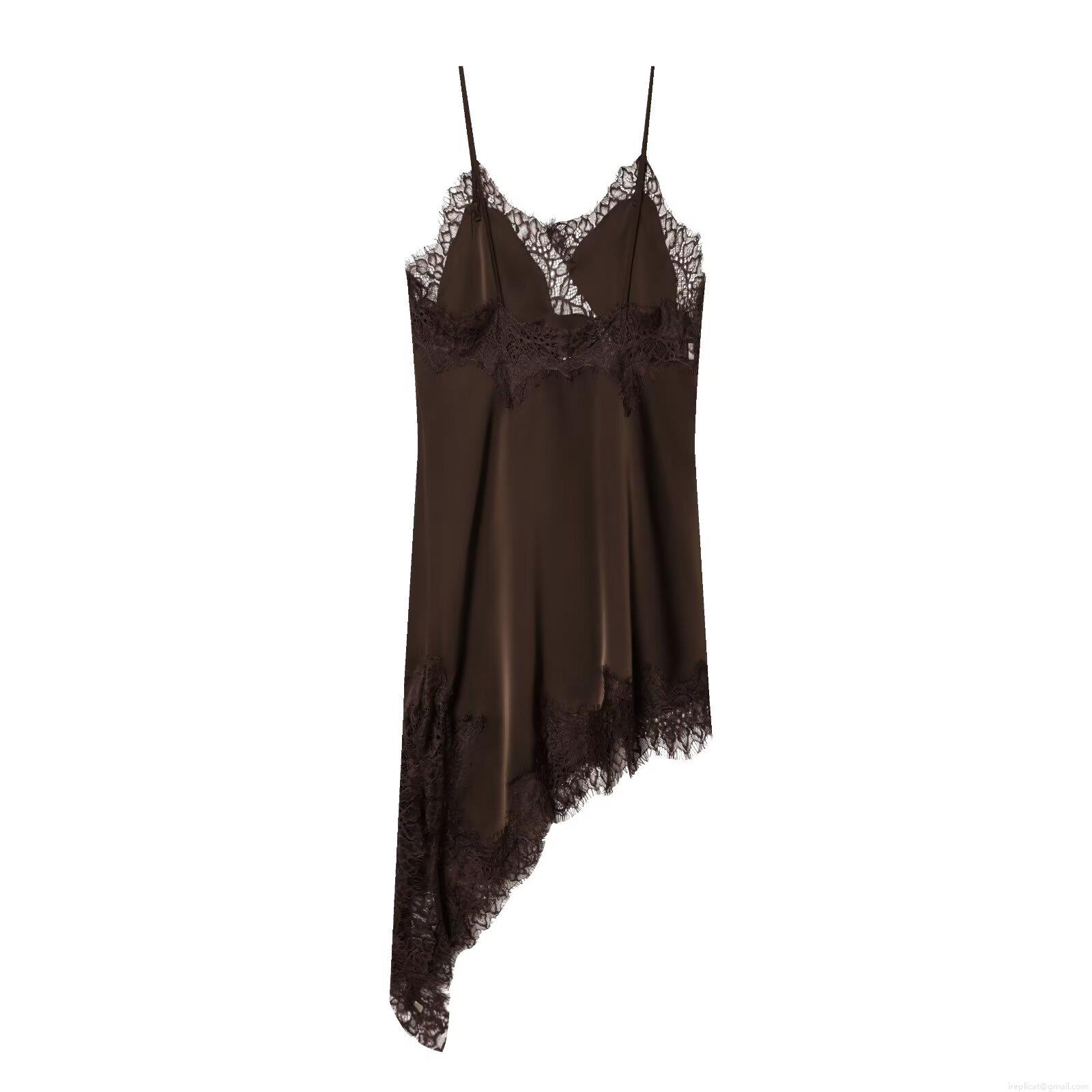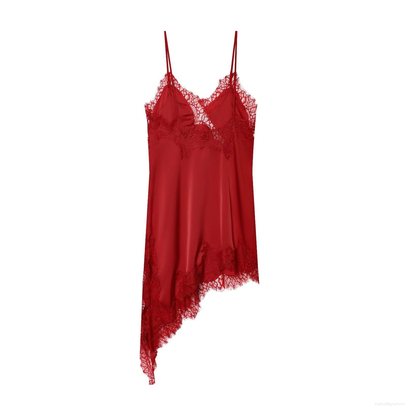 • Women's Elegant Satin Mini Cami Dress With Lace Trim V-Neck Asymmetrical Hem Sleeveless Polyester Slip Dress For Party Vacation Nightgown