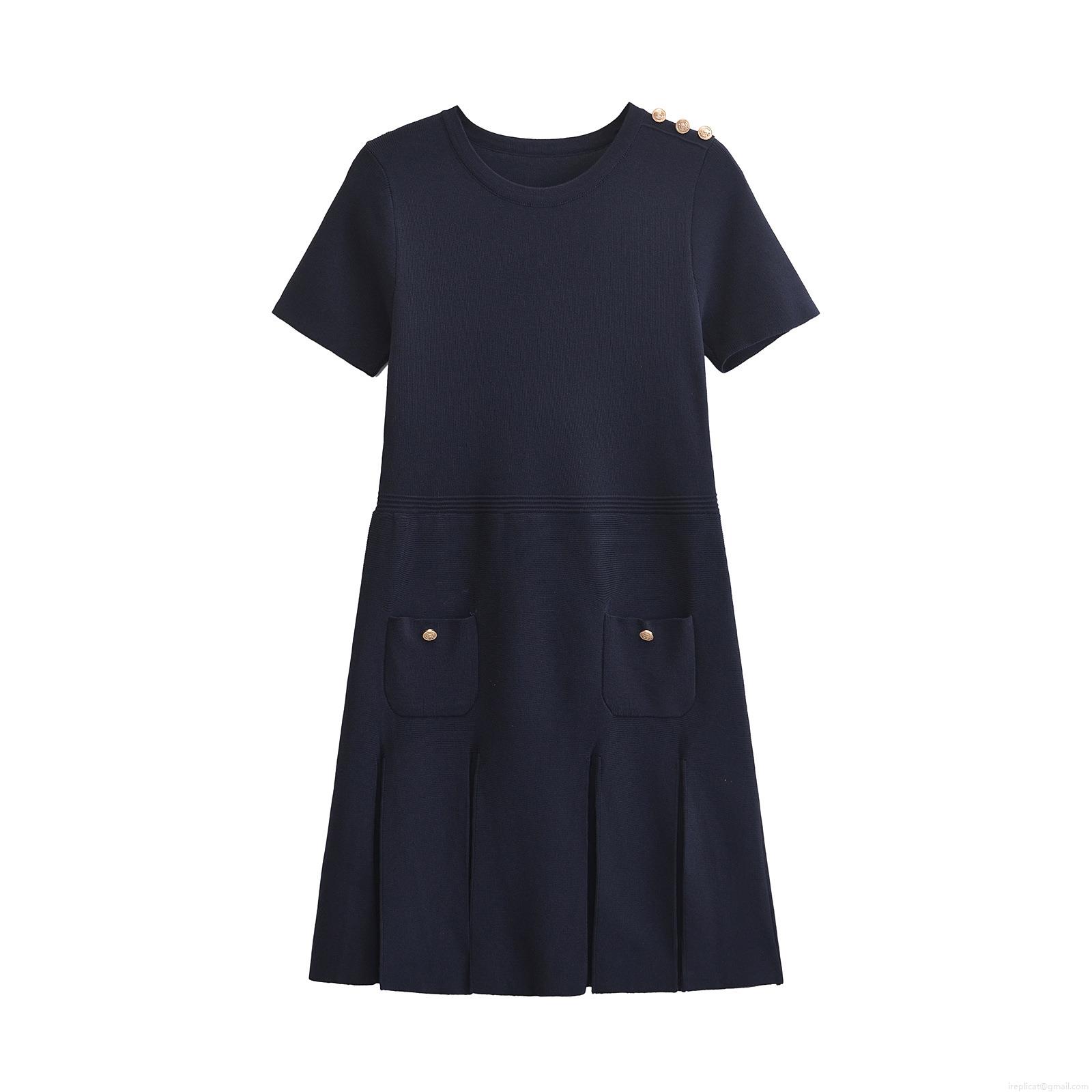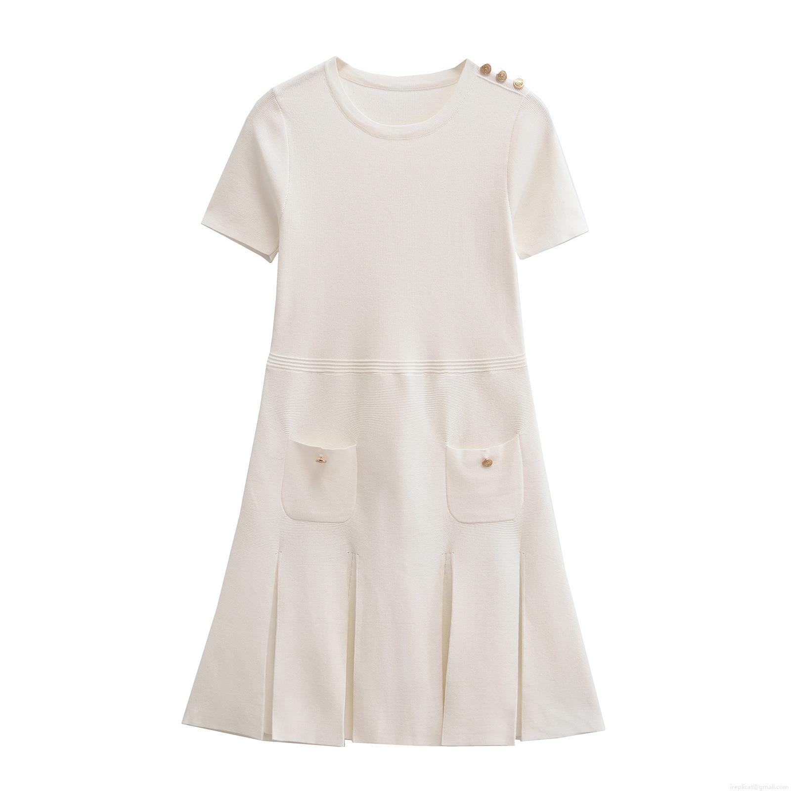• Women's Elegant Short Sleeve Knitted Mini Dress Pleated A-Line Skirt With Gold Buttons Pockets Round Neck Casual Office Party Knit Dress