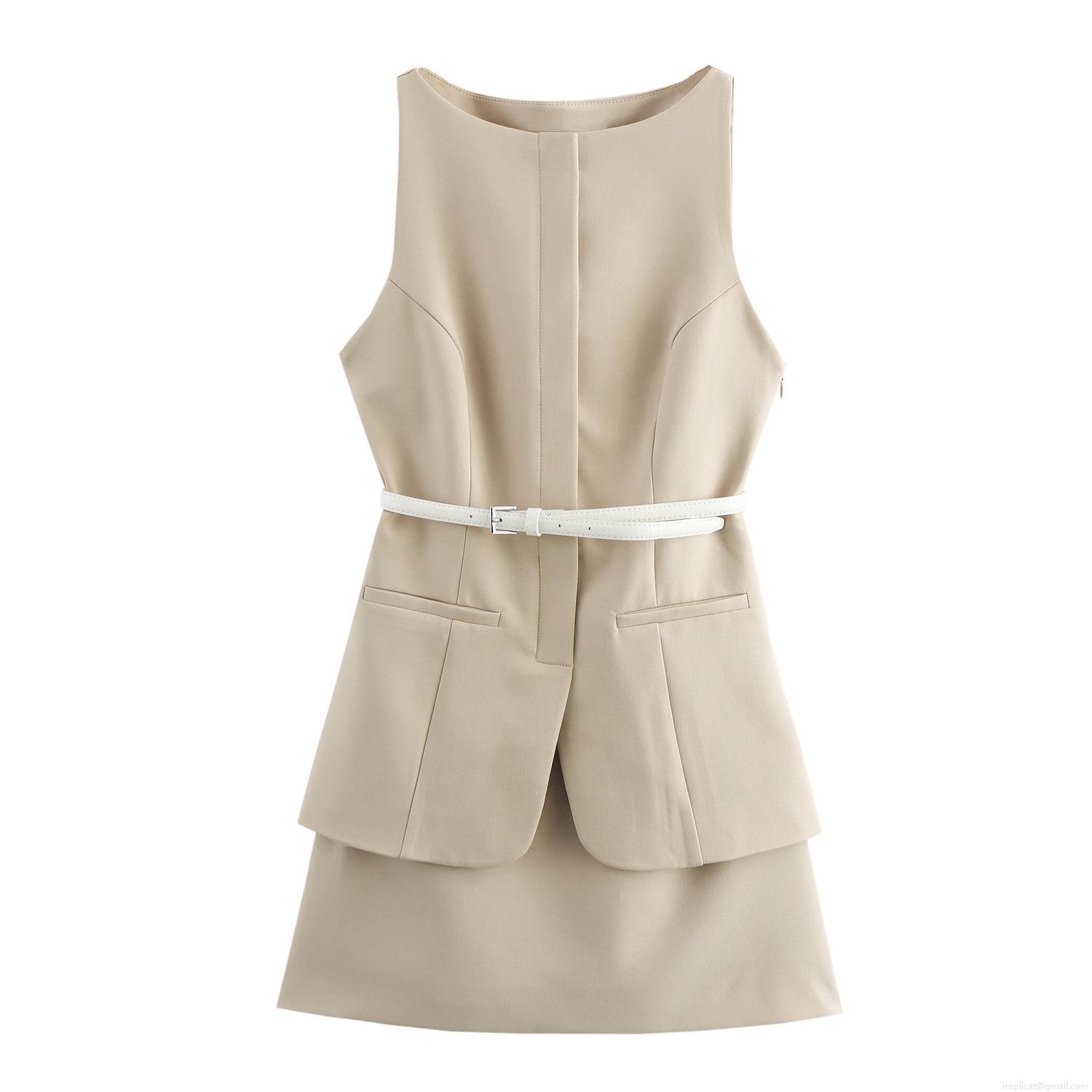 • Women's Elegant Sleeveless Mini Dress With Belt Solid Color Khaki Round Neck A-Line Layered Ruffle Hem Dress For Office Daily Party Commuter Wear
