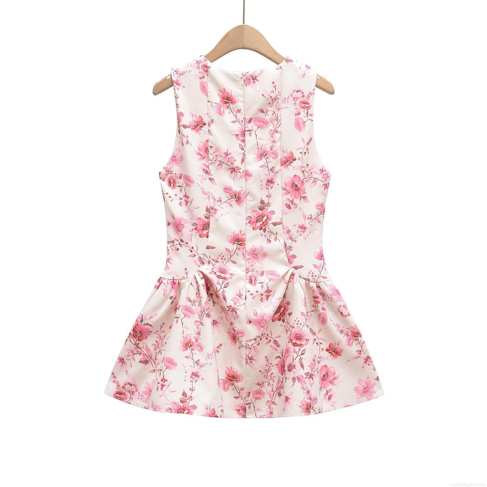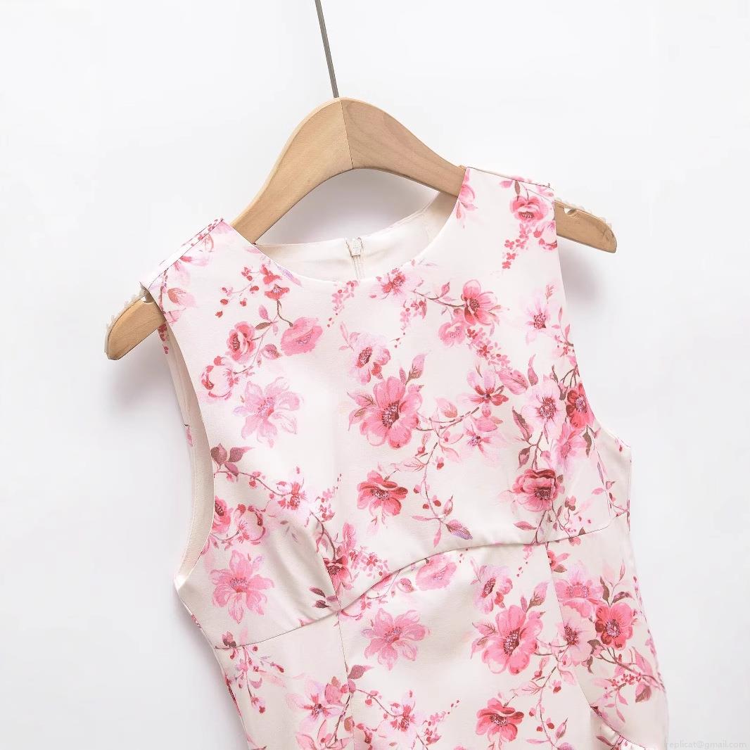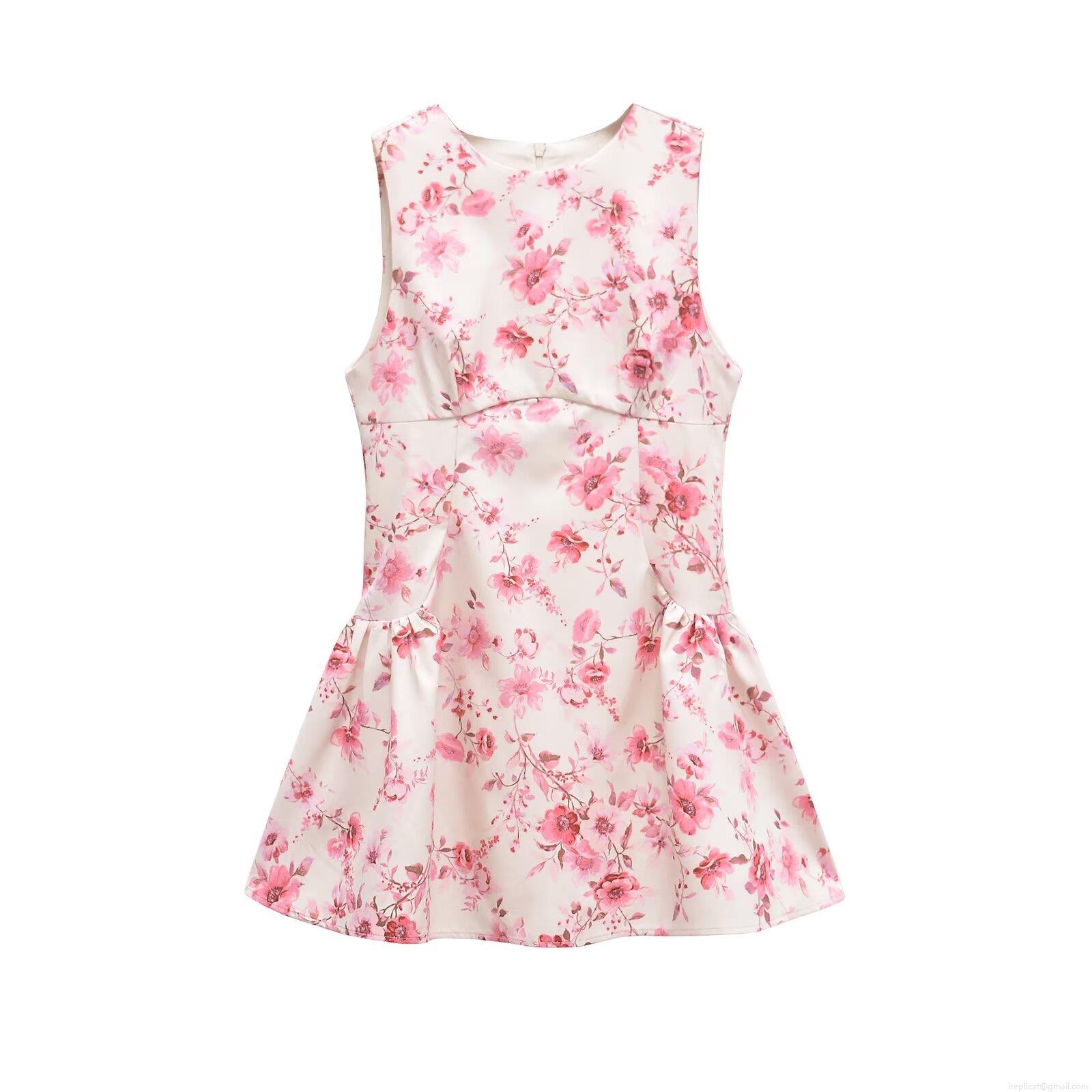 • Women's Elegant Sleeveless Pink Floral Print Mini Dress Polyester Slim Fit Round Neck Summer A-Line Party Dress With Hidden Back Zipper
