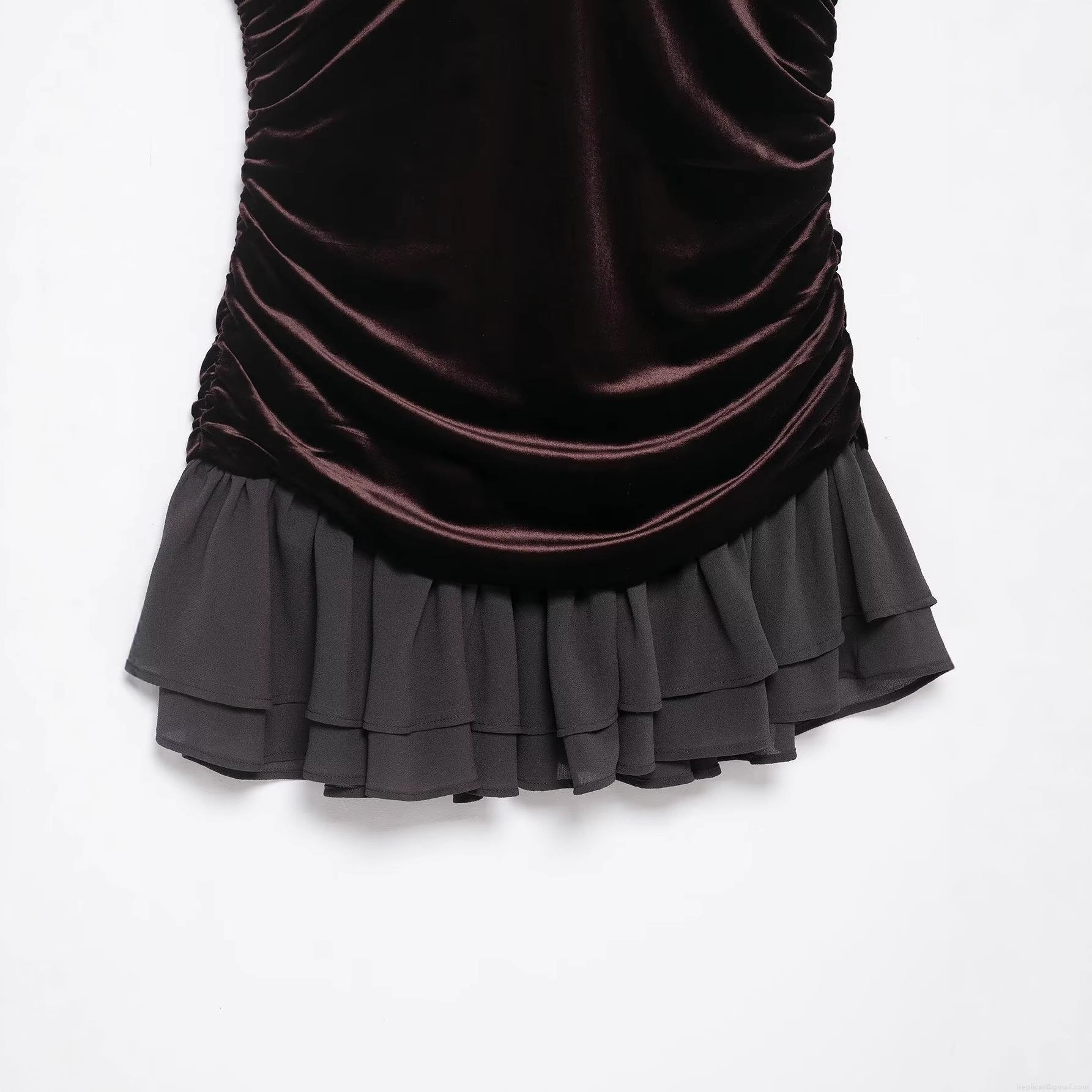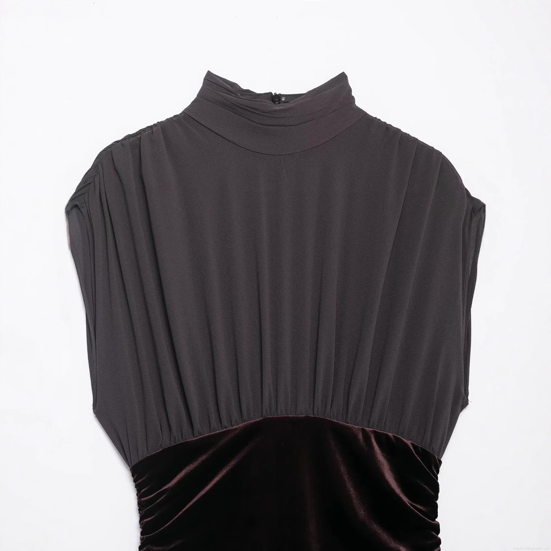 • Women's Elegant Sleeveless Velvet Patchwork Mini Dress High Neck Ruffled Hem Bodycon Cocktail Party Dress For Ladies
