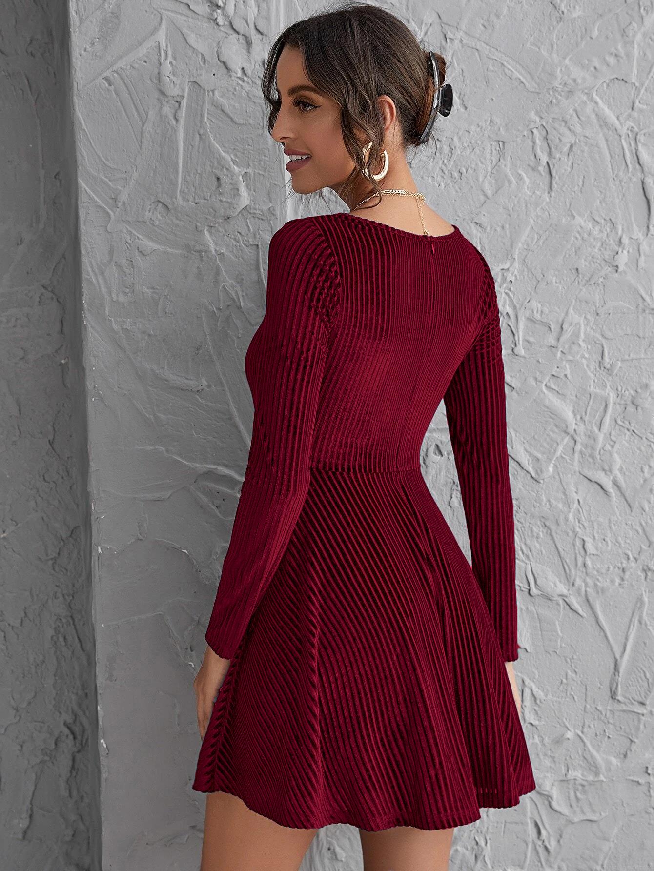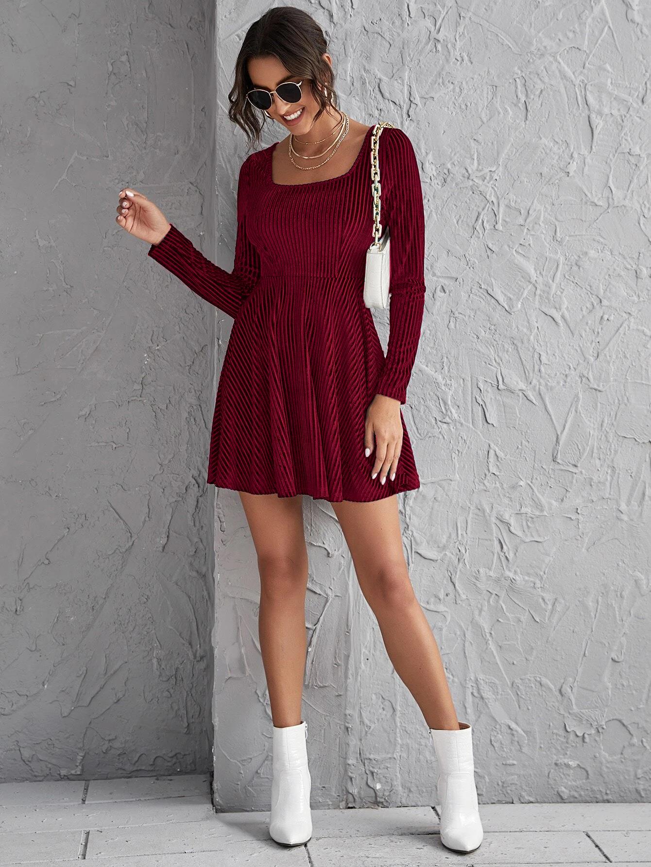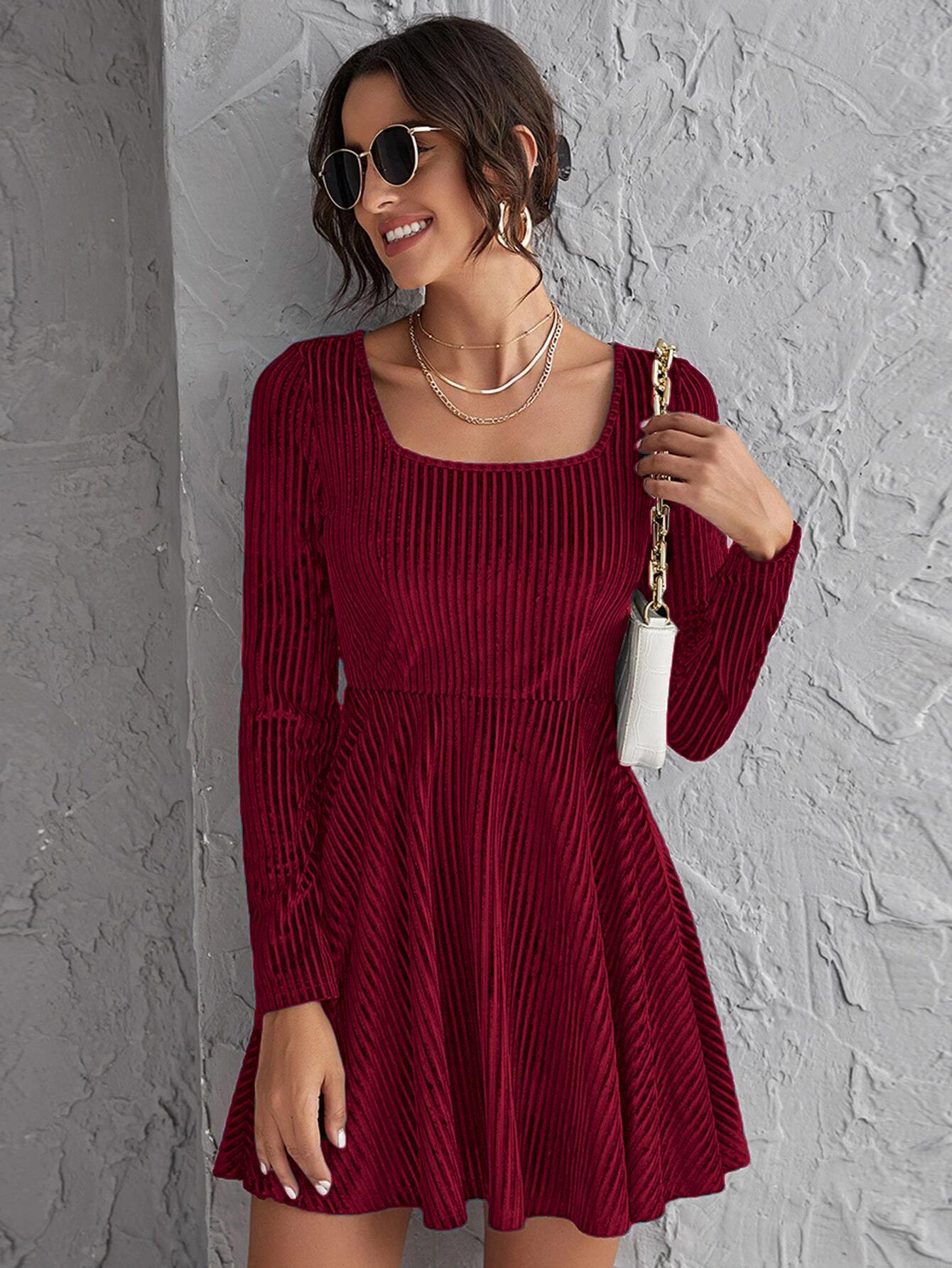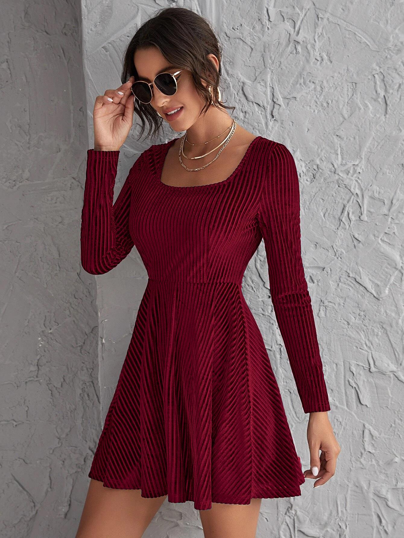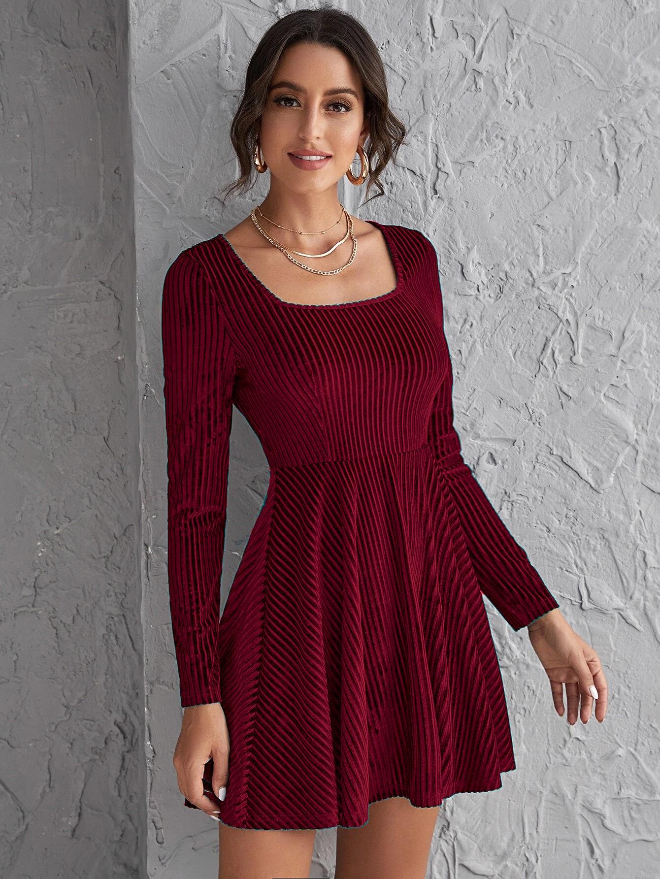 • Women's Elegant Square Neck Long Sleeve Ribbed Velvet Dress Slim Fit High Waist A-Line Mini Dress For Party Evening Clubwear Solid Wine Red