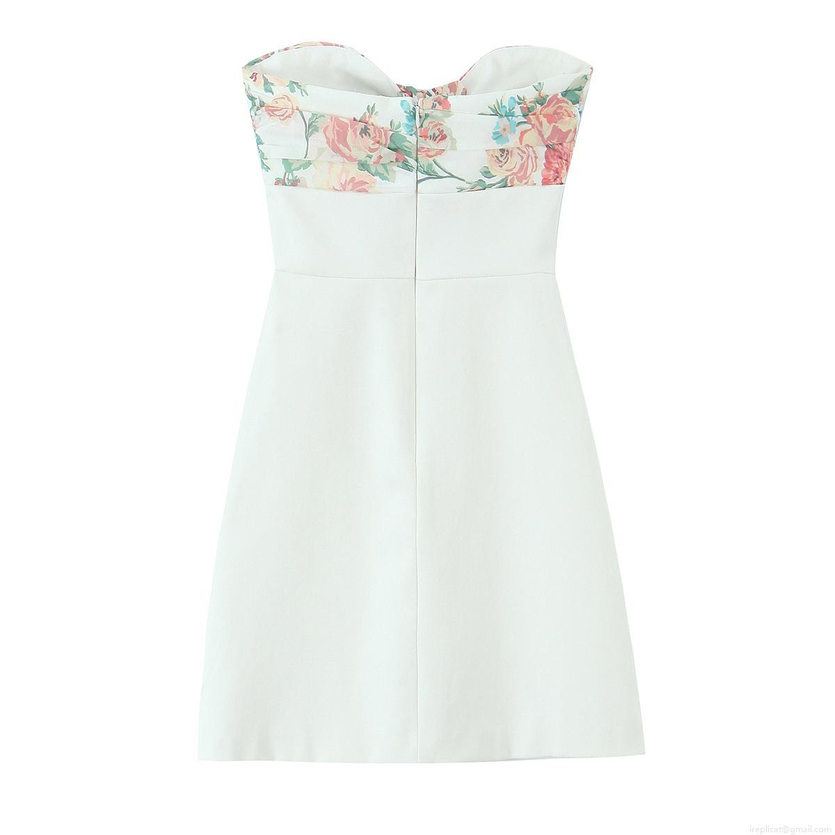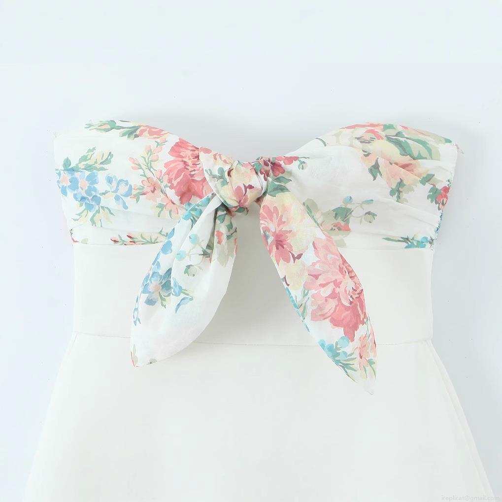 • Women's Elegant Strapless Tube Top Mini Dress White Polyester Floral Print Bow Detail Party Cocktail Short Dress