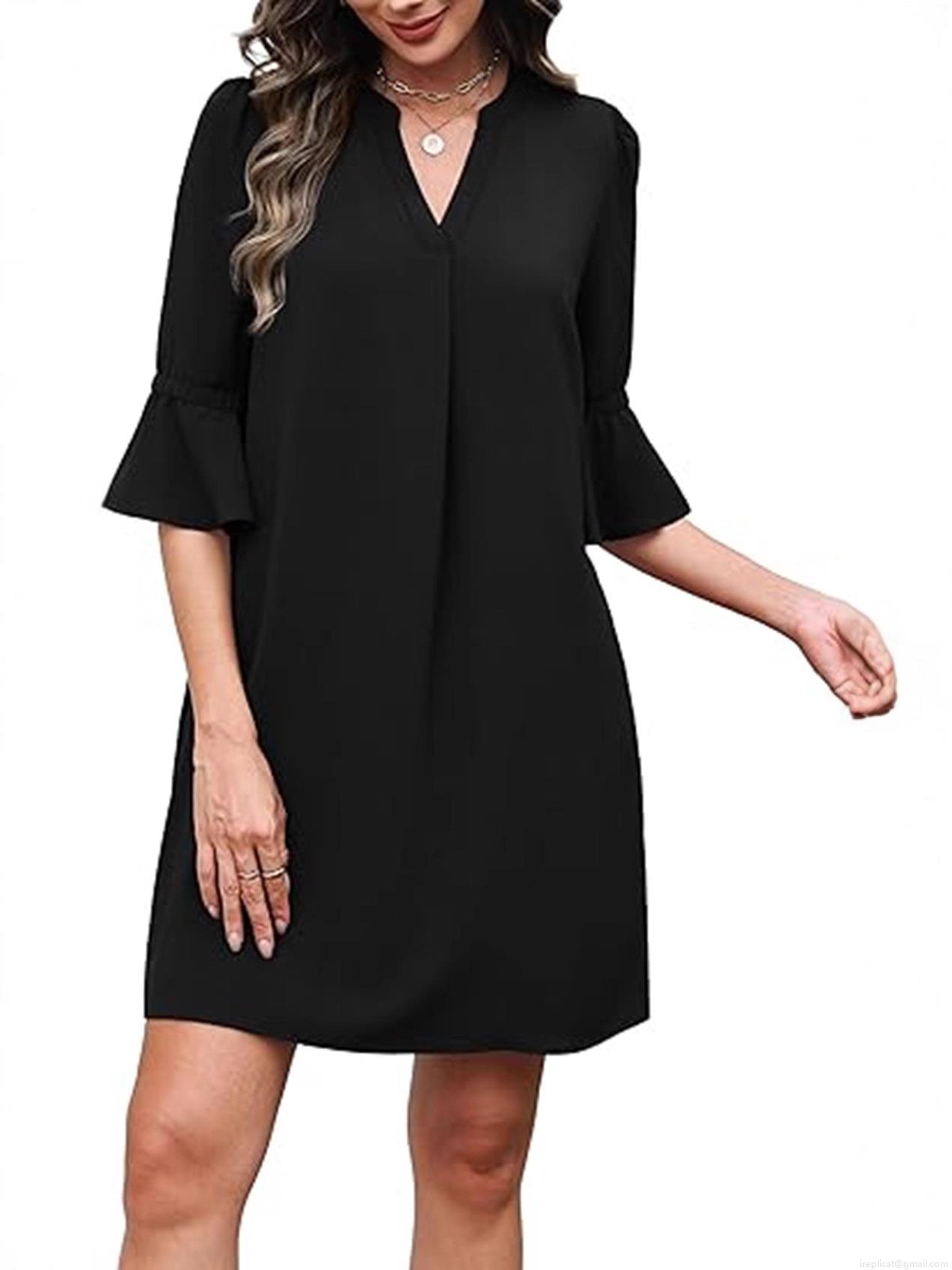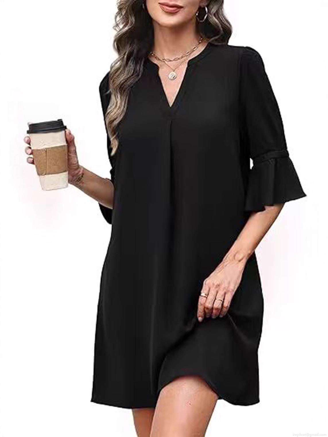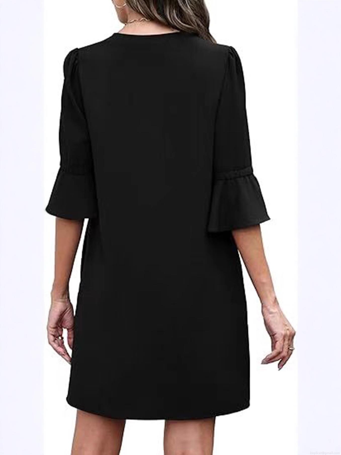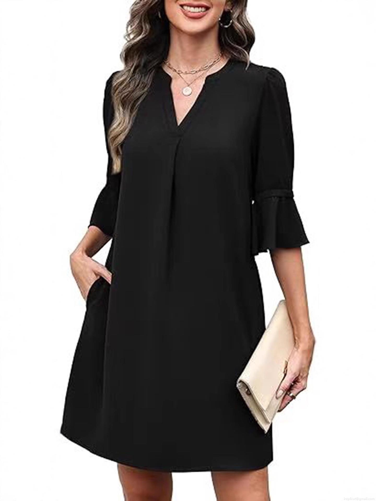 • Women's Elegant V Neck Bell Sleeve Shirt Dress Solid Color A-Line Mini Dress With Pockets Polyester Casual Party Wear For Ladies