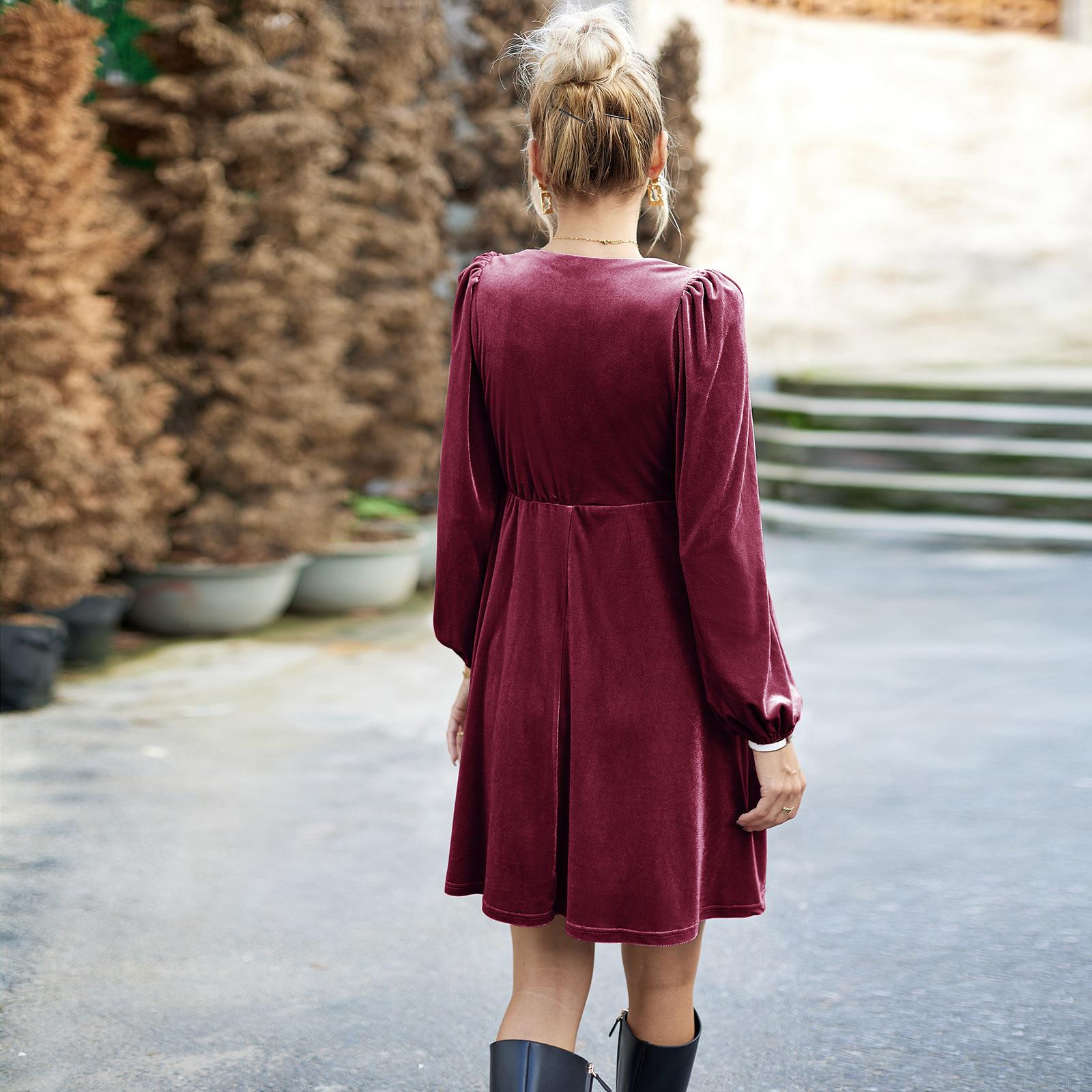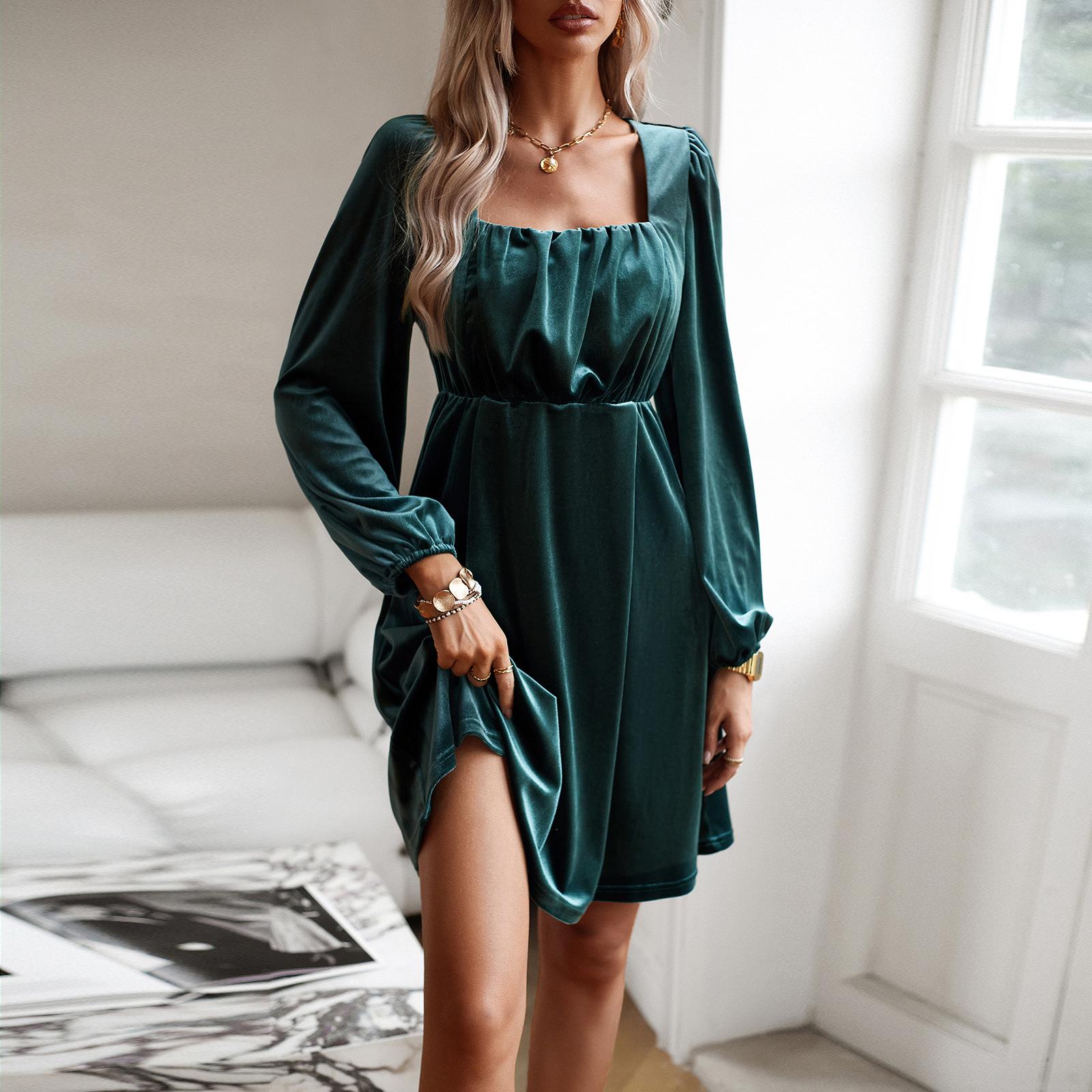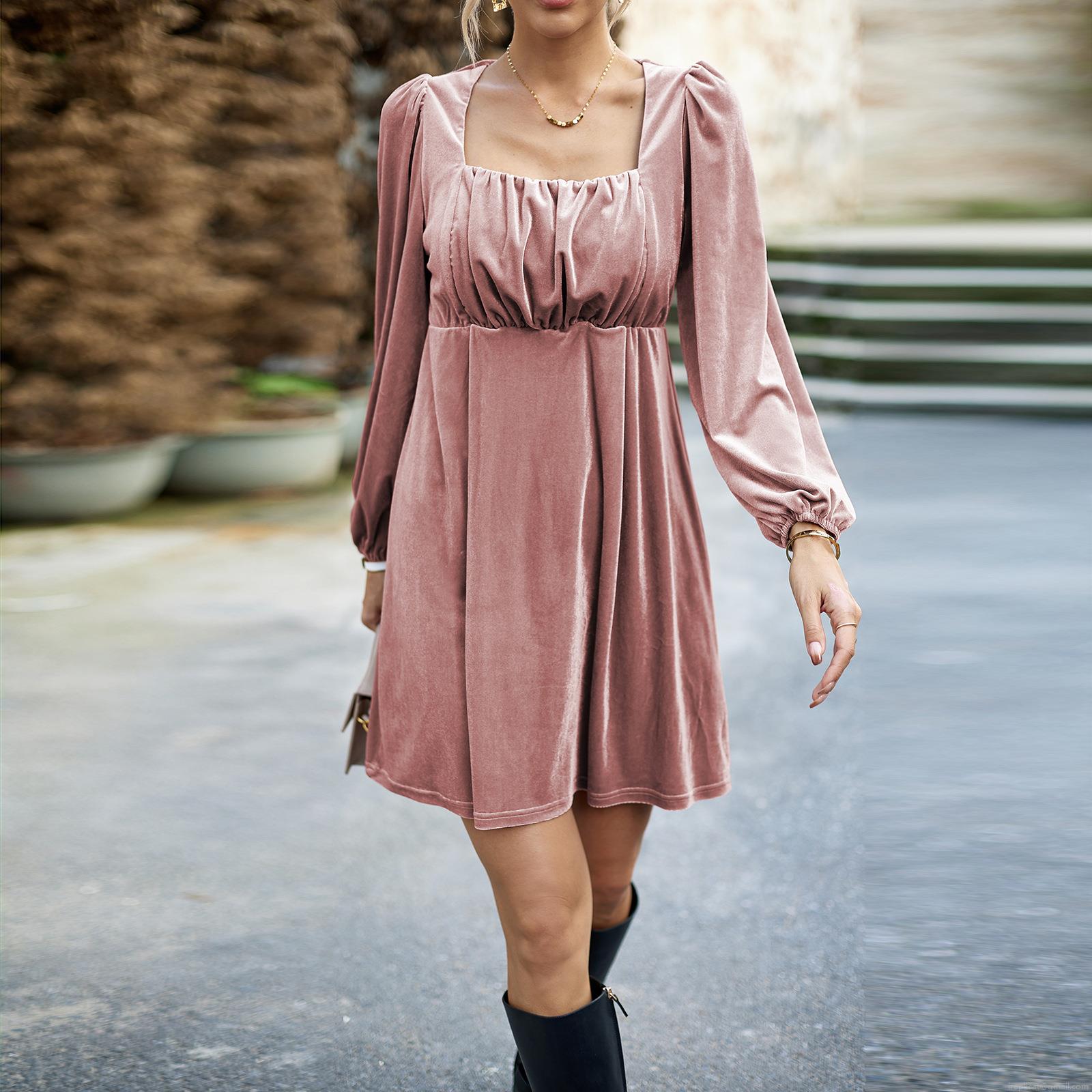 • Women's Elegant Velvet Square Neck Long Sleeve Dress High Waist Pleated A-Line Mini Dress Solid Color Autumn Winter Commuter Fashion Dress