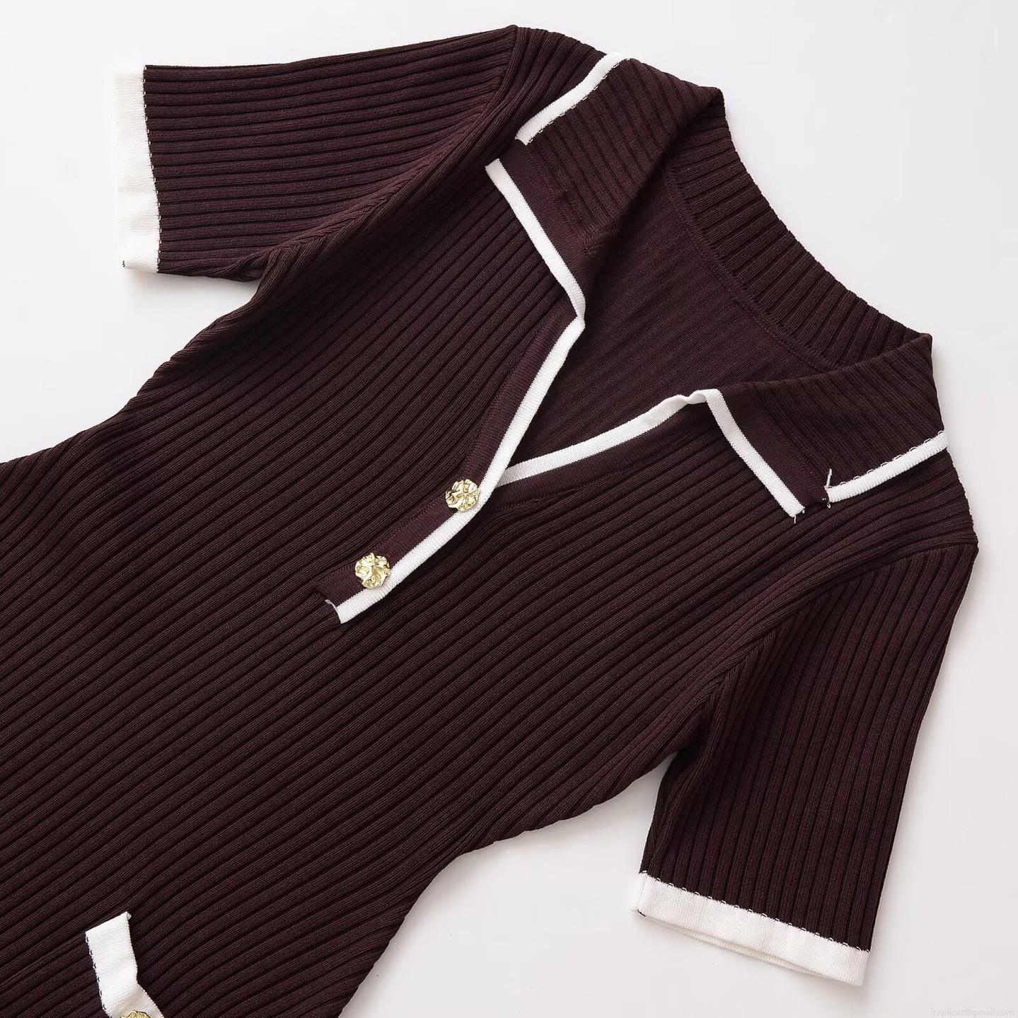 Women's Elegant V-Neck Knit Mini Dress Short Sleeve Ribbed A-Line Dress with Contrast Trim and Decorative Metal Buttons for Casual Office Party Wear