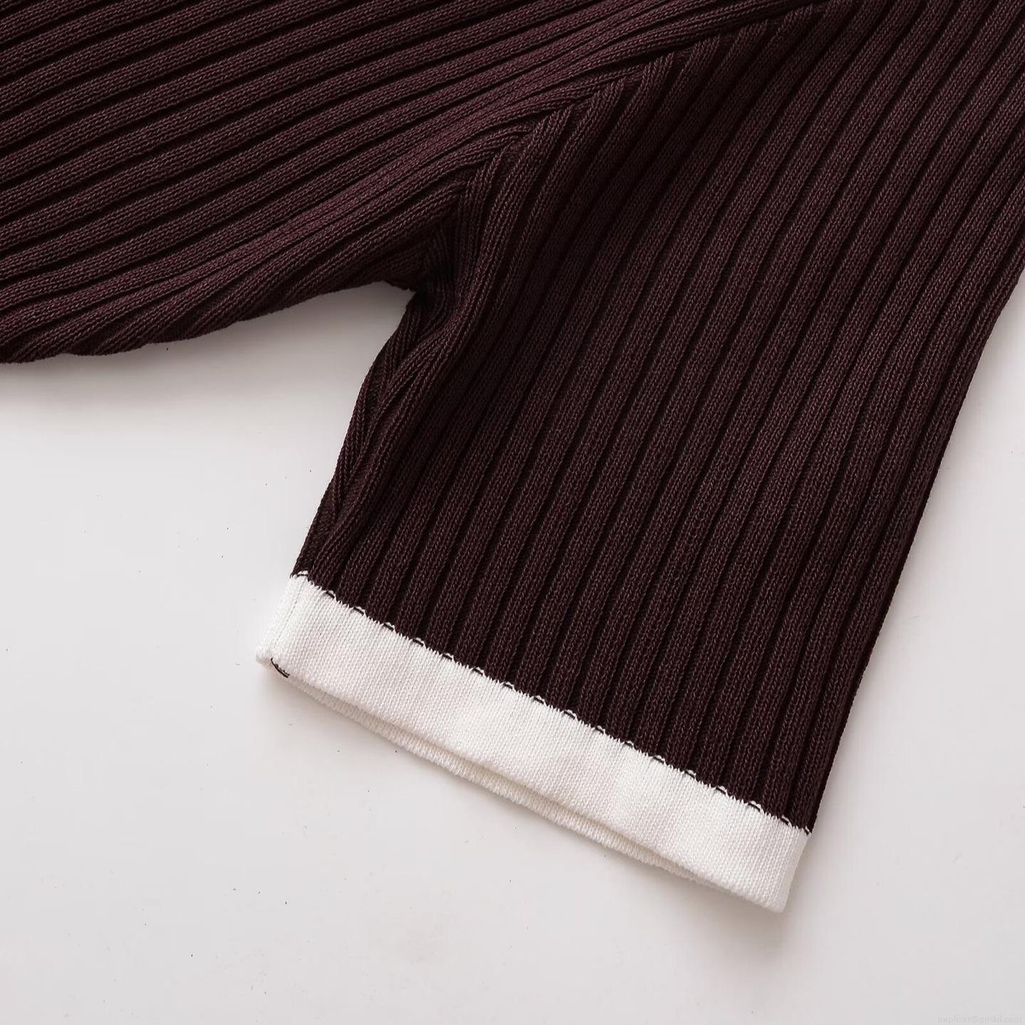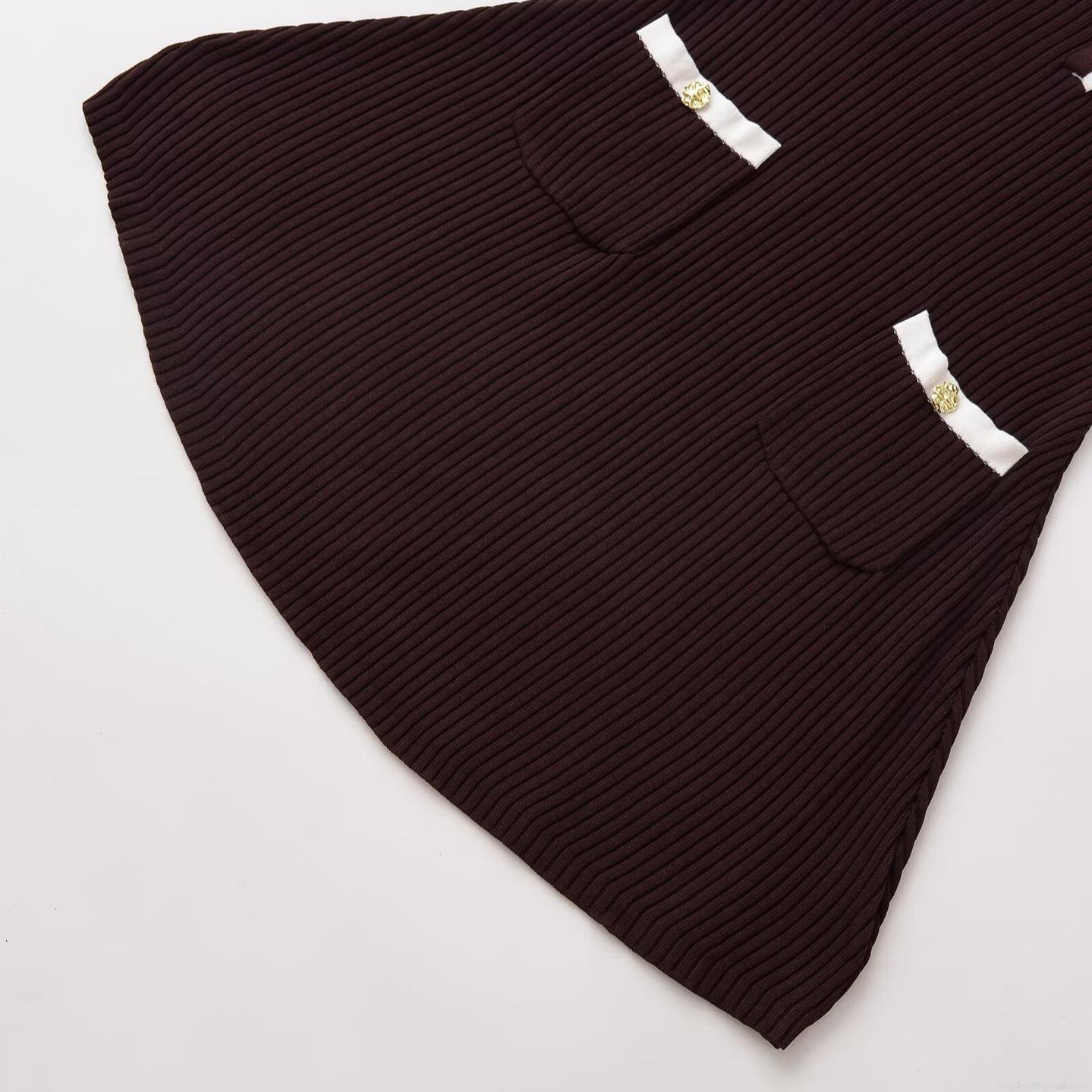 Solid Color, Color Blocking, V-neck, Contrasting Edging, Metal Buttons, A-line Skirt, Vertical Groove Texture