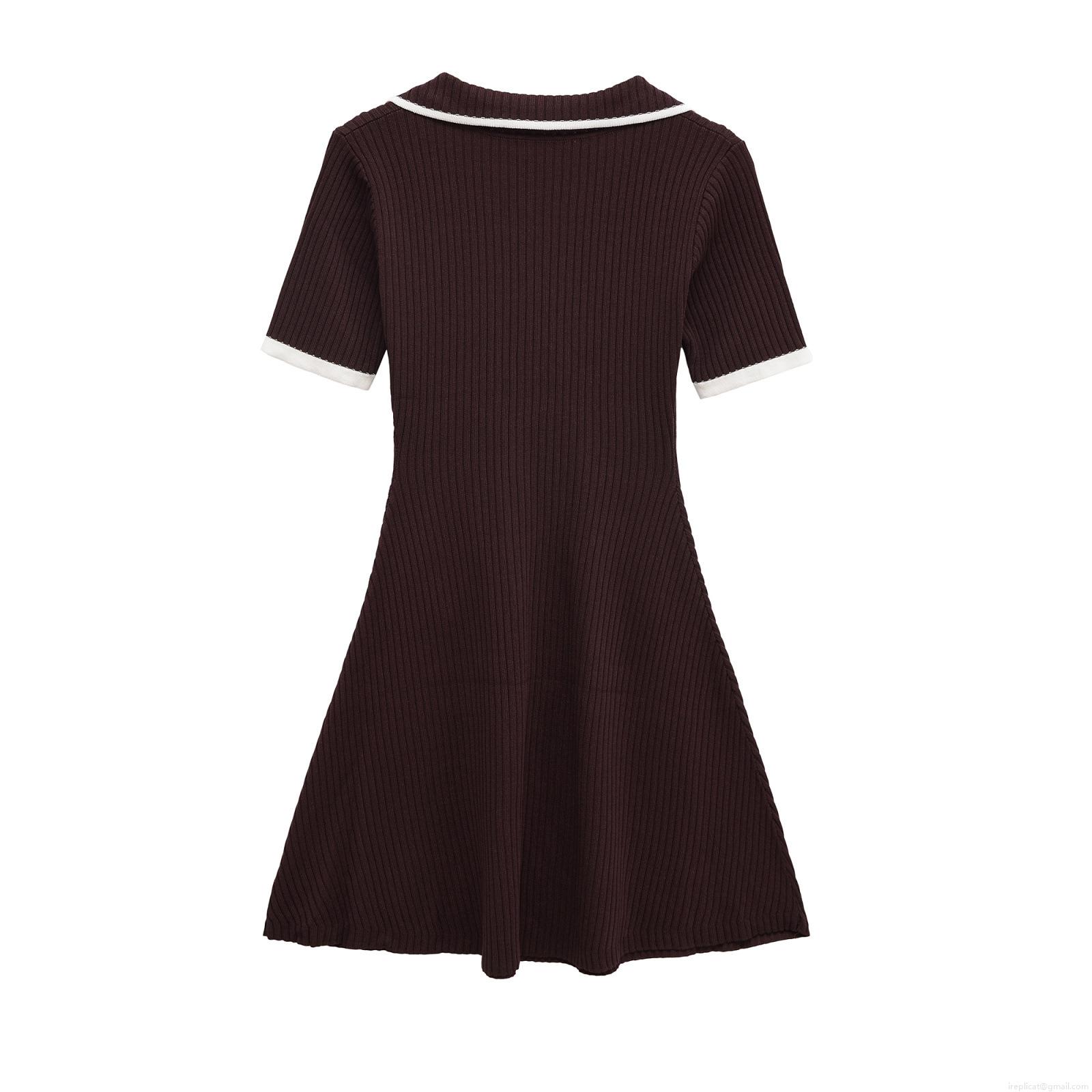 • Women's Elegant V-Neck Knit Mini Dress Short Sleeve Ribbed A-Line Dress with Contrast Trim and Decorative Metal Buttons for Casual Office Party Wear