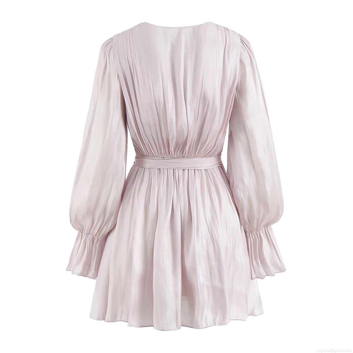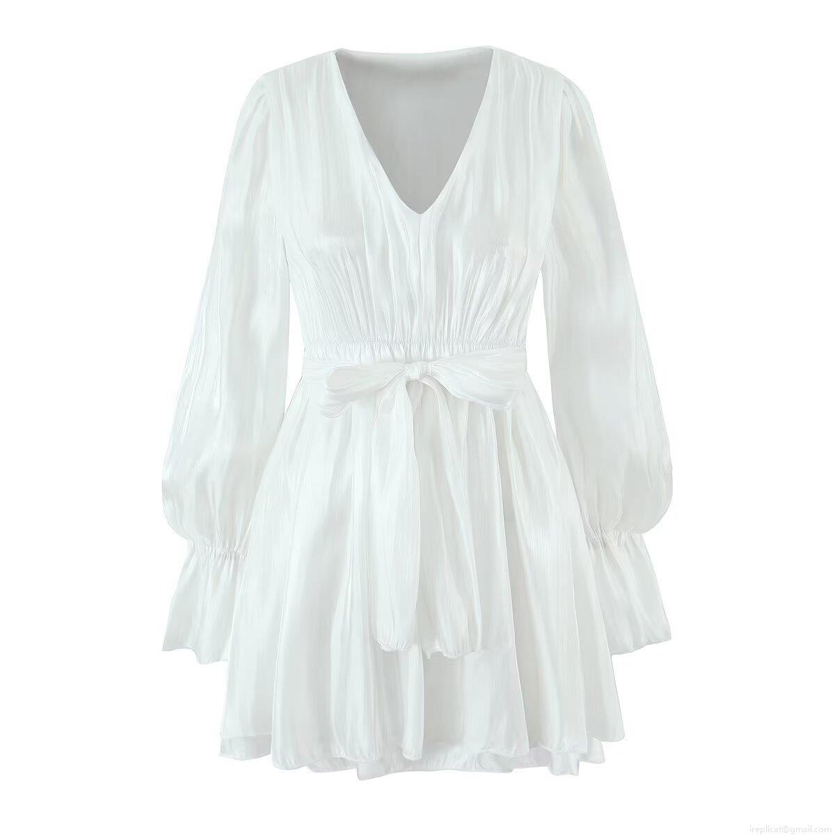 • Women's Elegant V-Neck Long Sleeve Mini Dress Satin Ruched Tie-Waist Lantern Sleeve Ruffle Short Dress Chic Party Wedding Guest Solid Color Streetwear Dress