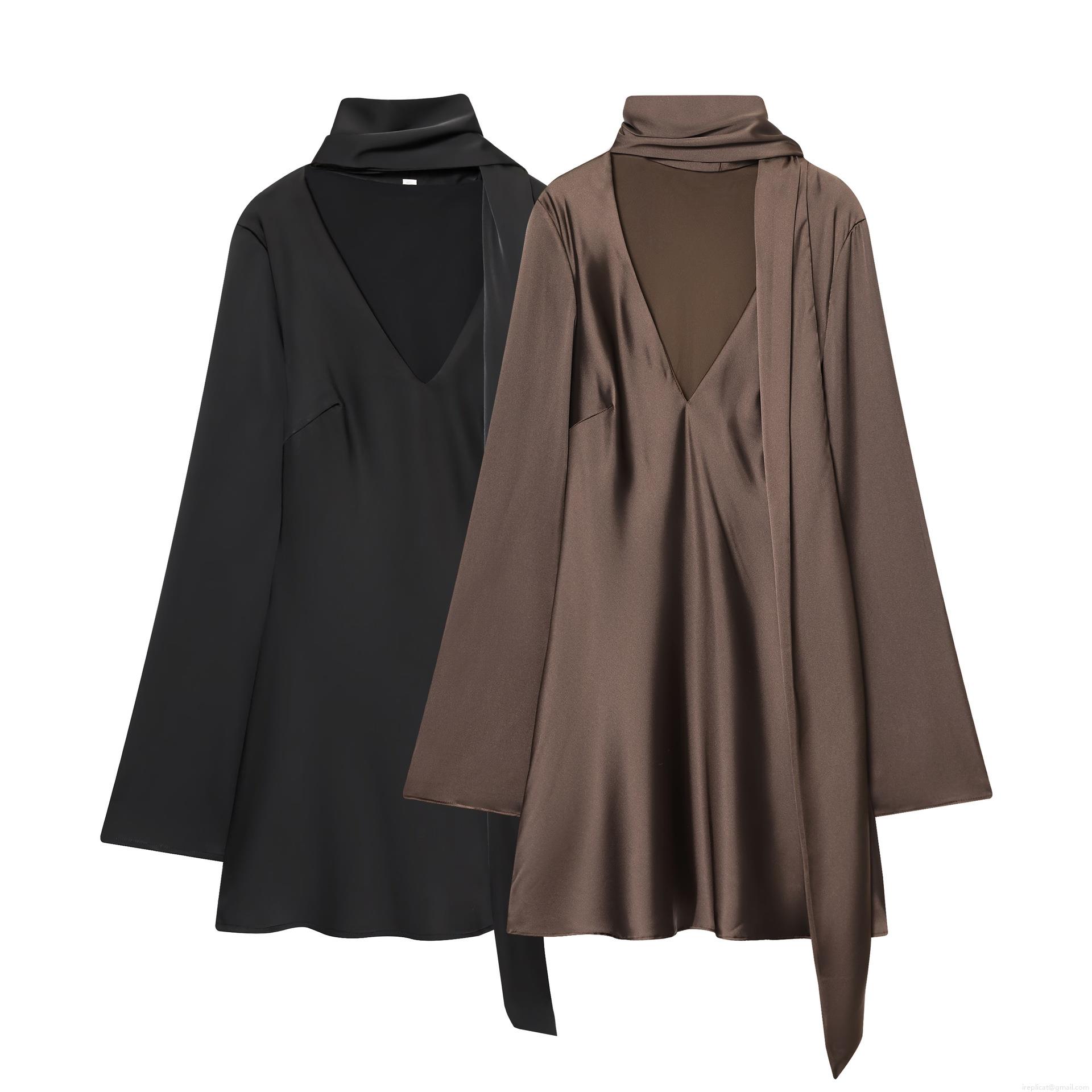 • Women's Elegant V-Neck Long Sleeve Satin Polyester Mini Dress With Scarf Collar Silky Cocktail Party Bodycon Sheath Dress For Ladies Formal Evening Event