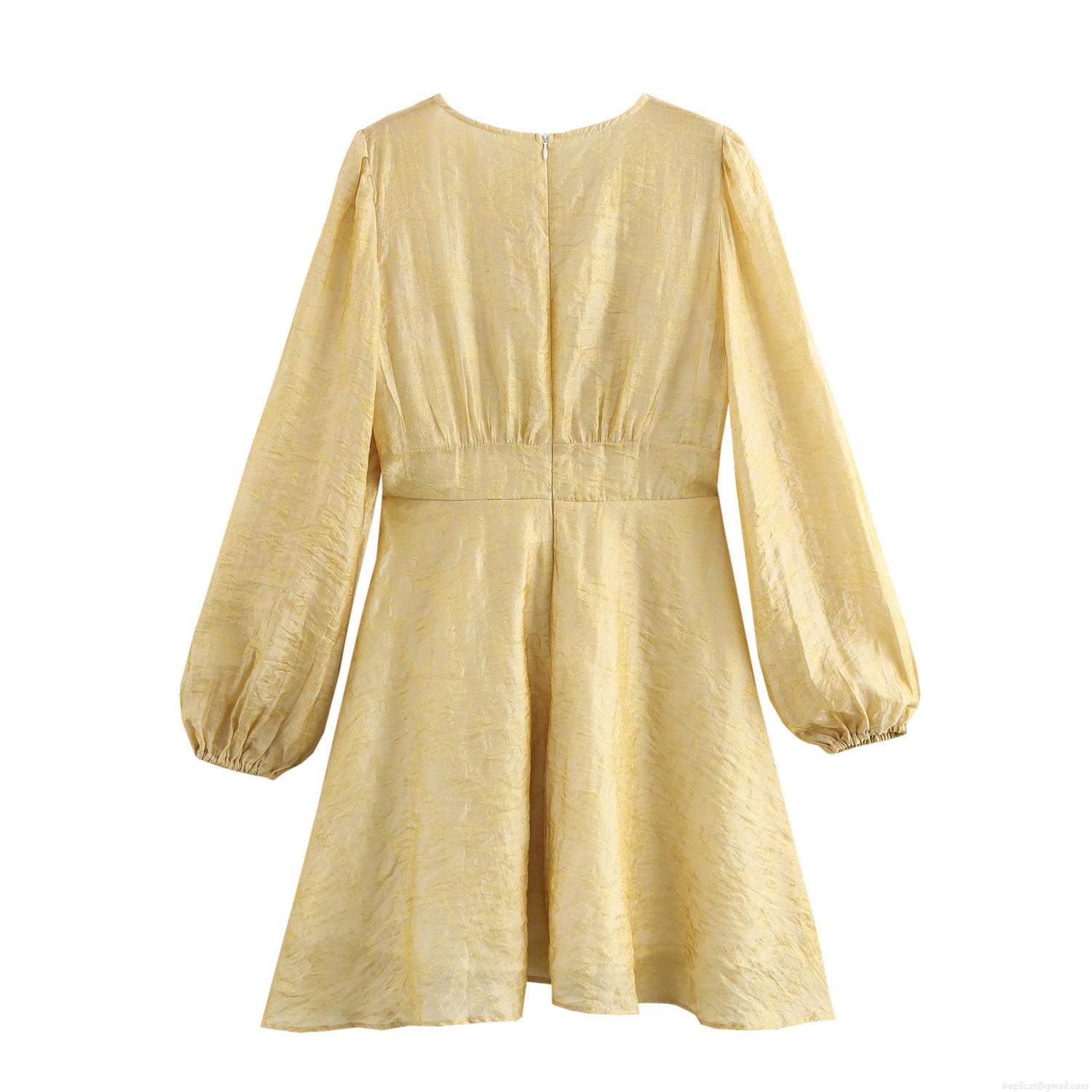 • Women's Elegant V-Neck Polyester Jacquard Mini Dress Vintage Lantern Sleeve High Waist A-Line Cocktail Party Short Dress Yellow