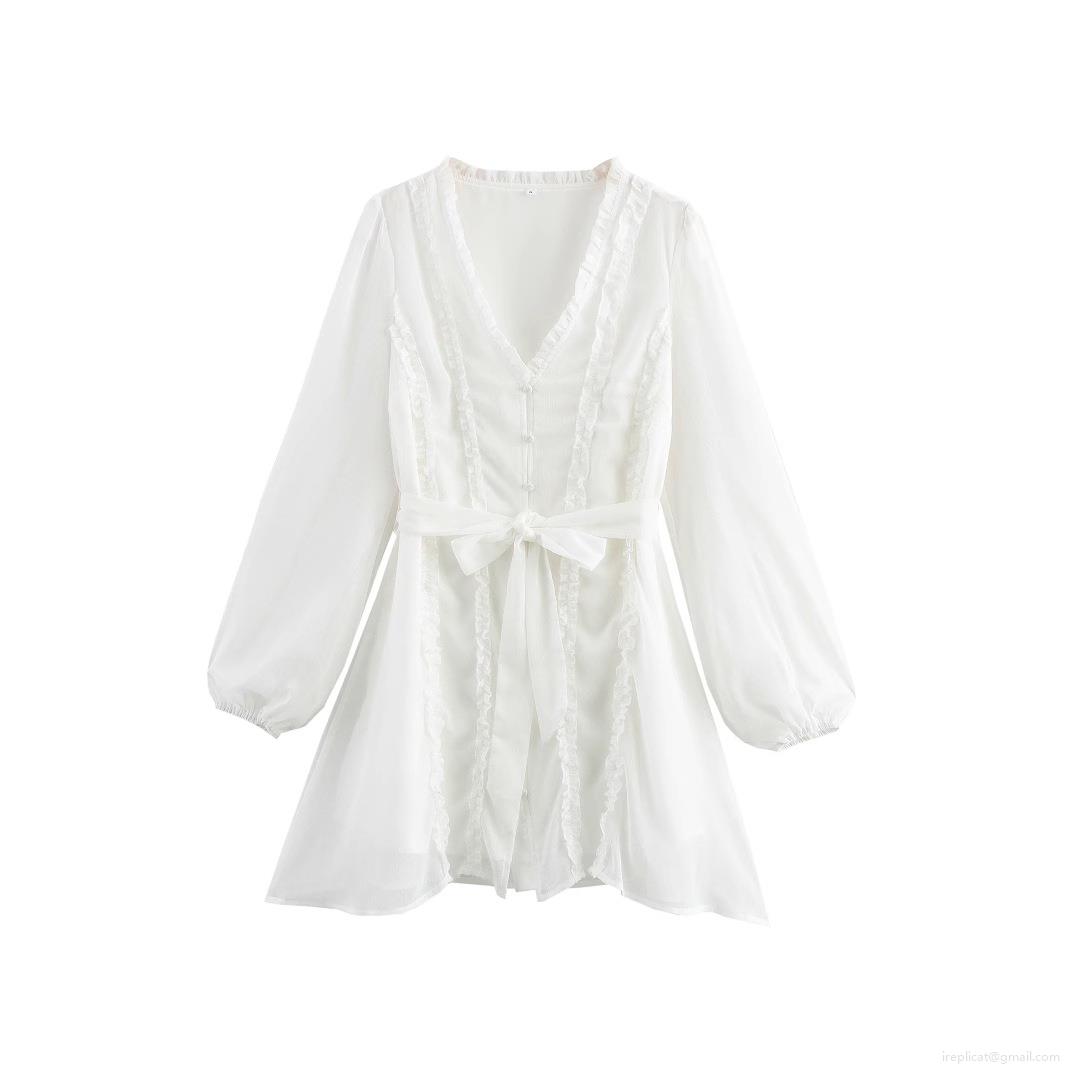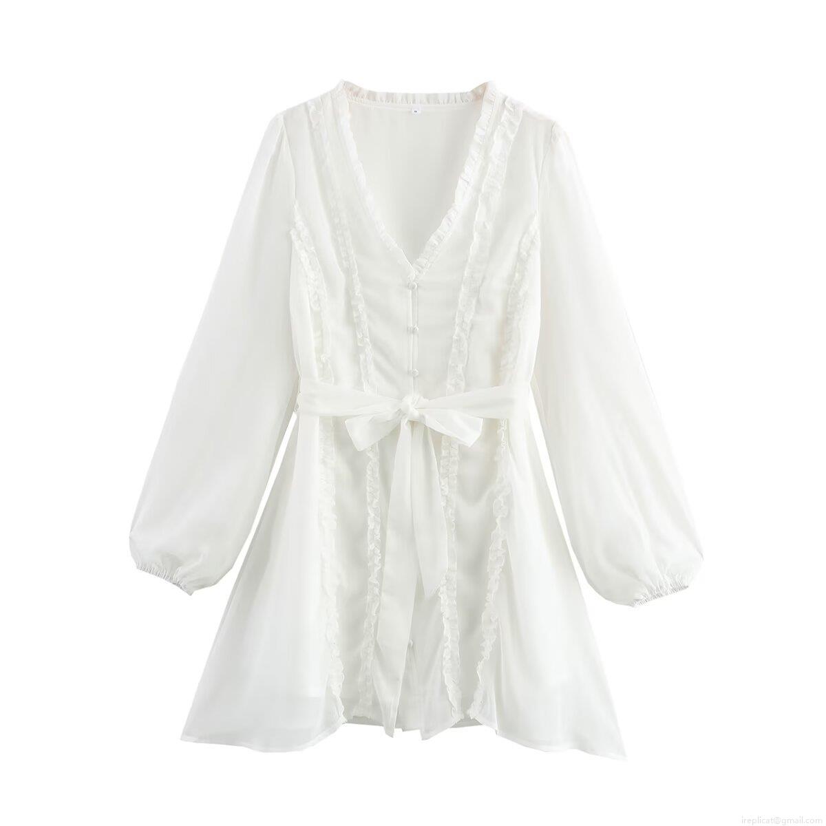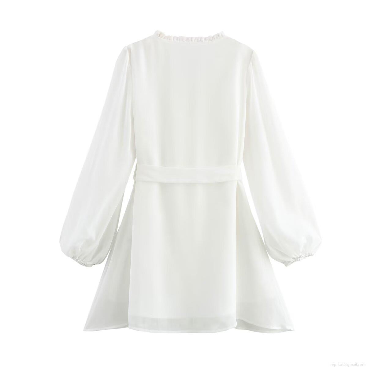 Women's Elegant V-Neck Ruffle Mini Dress 100% Polyester Chiffon Lantern Long Sleeve Single Breasted Bow Tie Waist A-Line White Fashion Party Dress