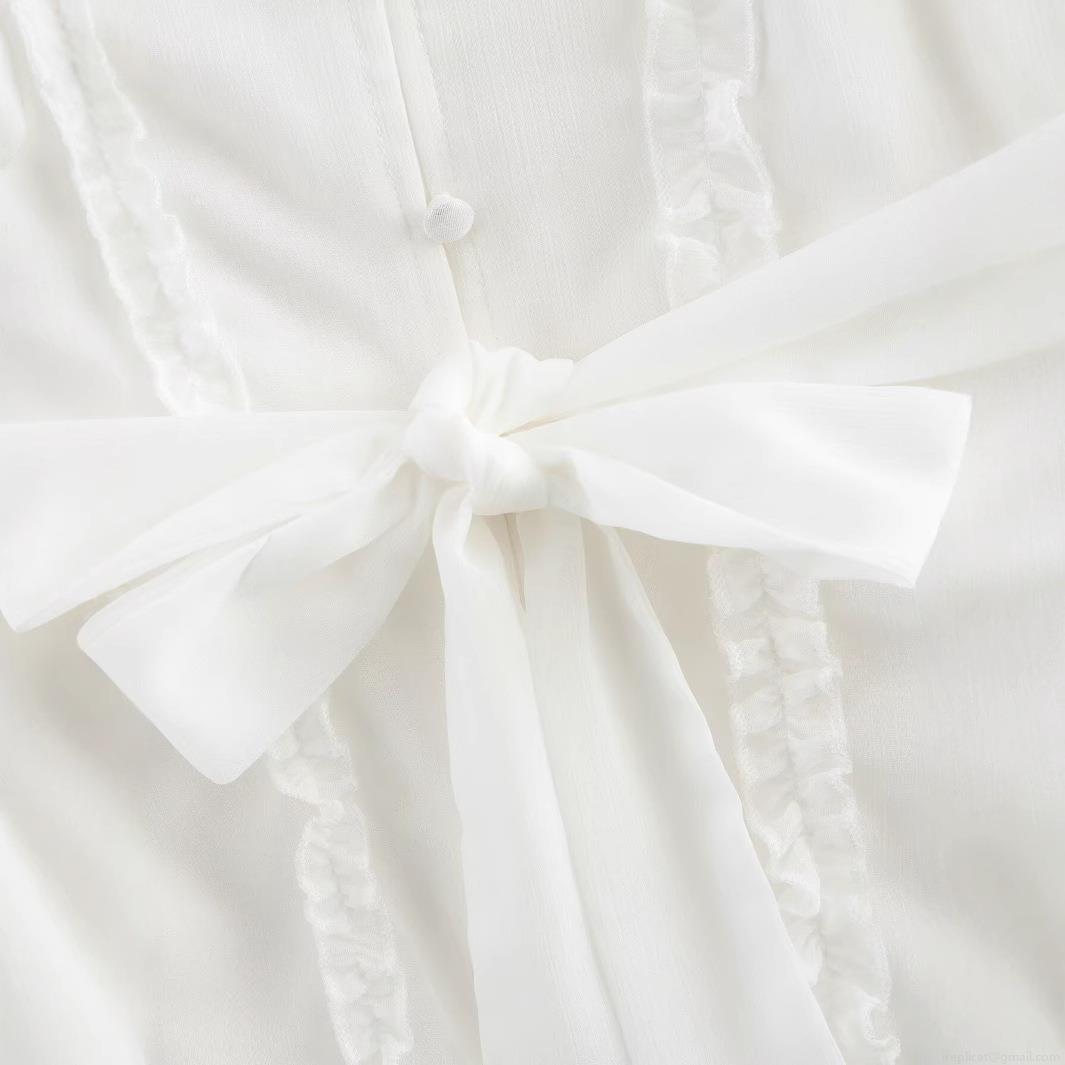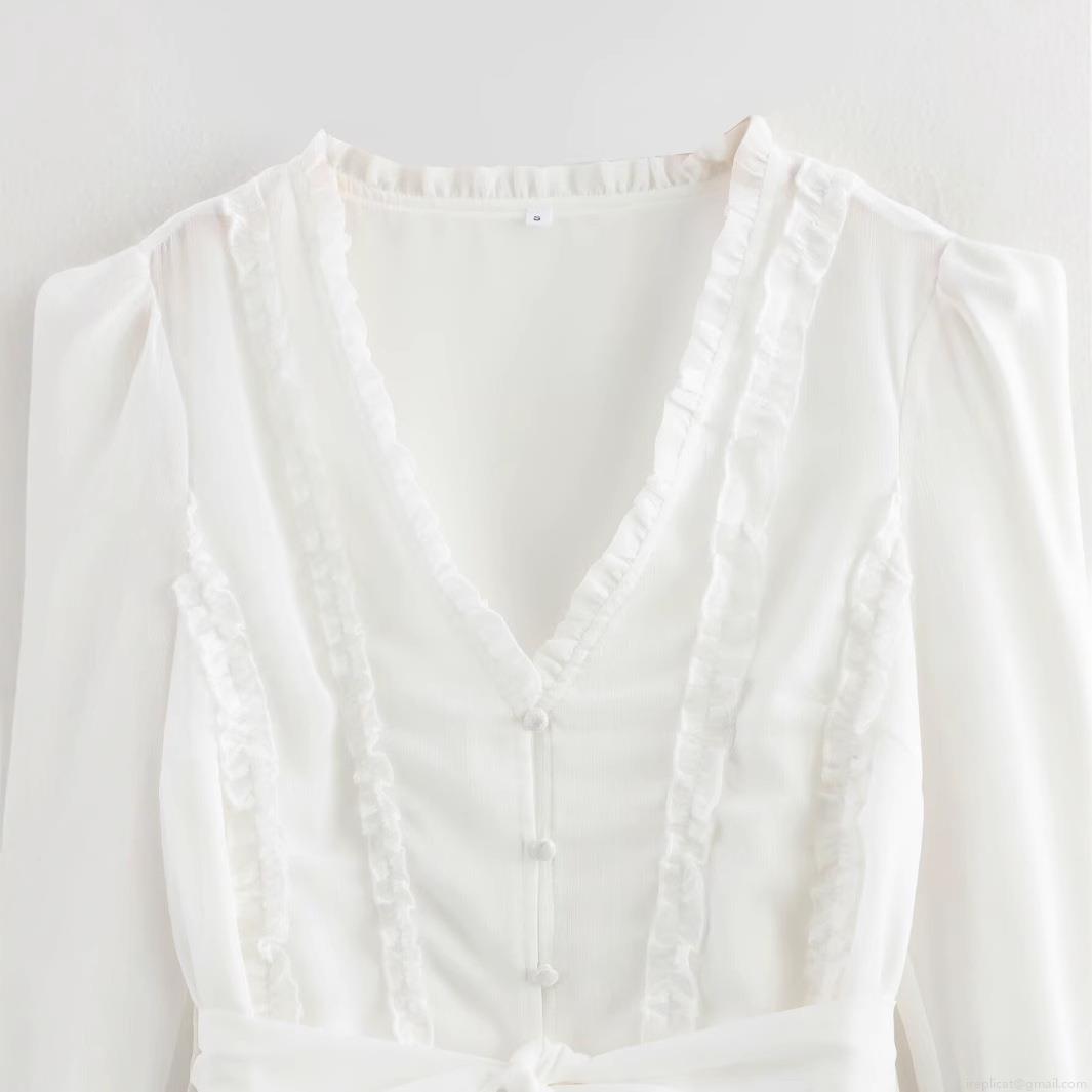 • Women's Elegant V-Neck Ruffle Mini Dress 100% Polyester Chiffon Lantern Long Sleeve Single Breasted Bow Tie Waist A-Line White Fashion Party Dress