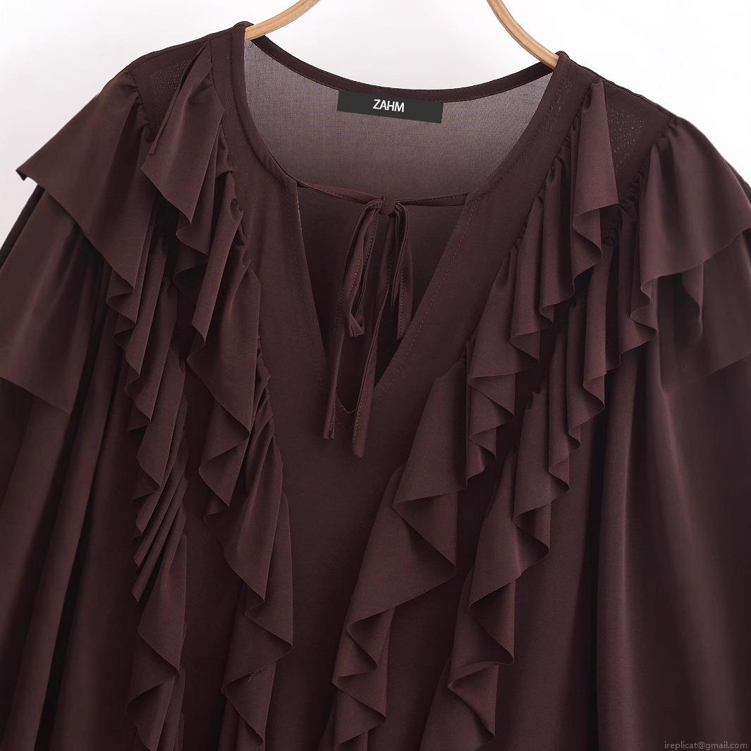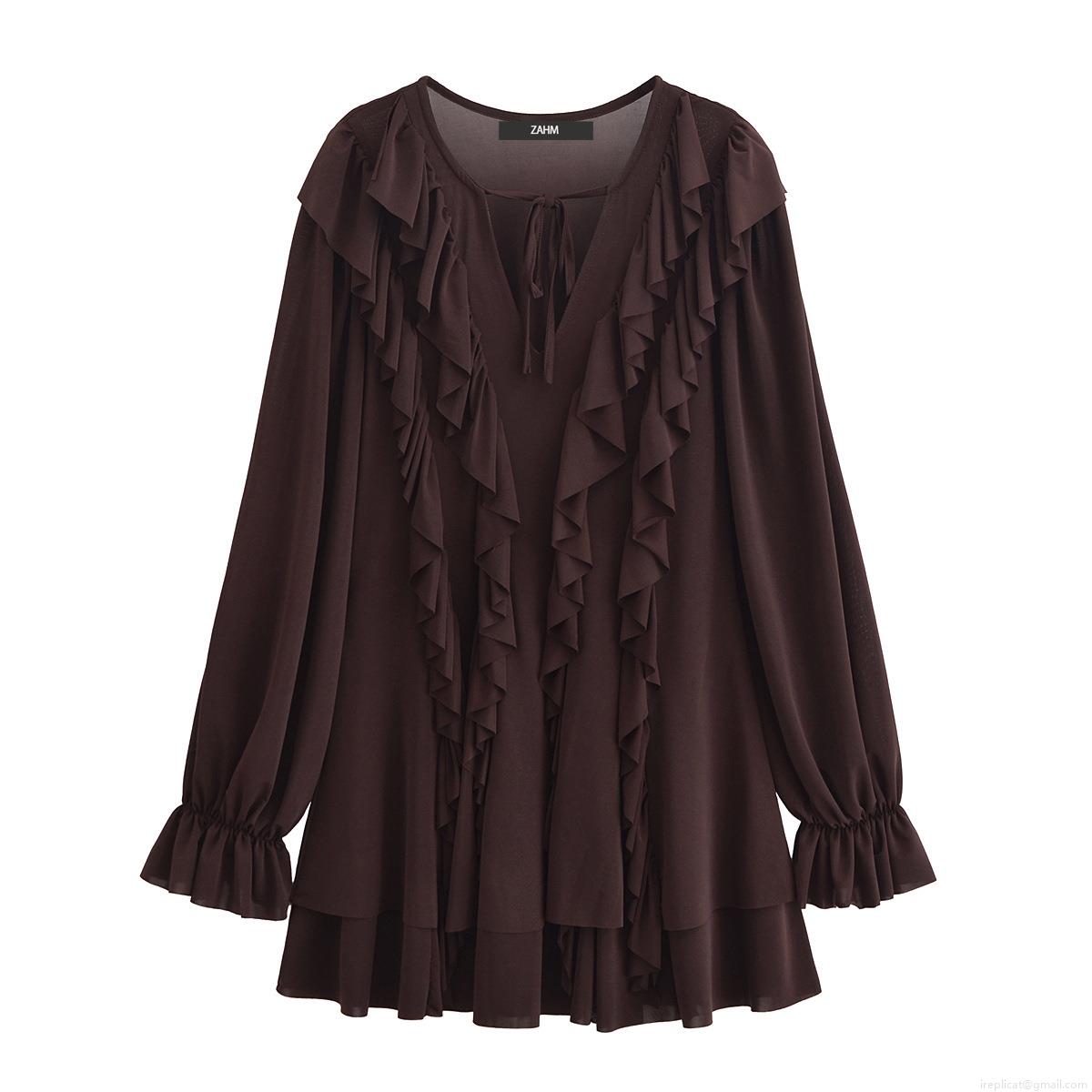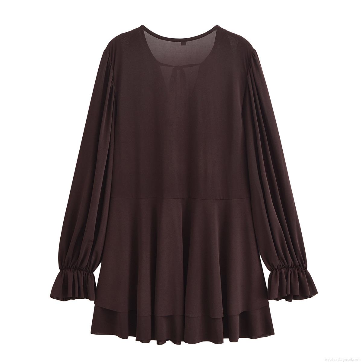 • Women's Elegant V-Neck Tie-Front Bow Layered Ruffle Long Sleeve Chiffon Mini Dress Solid Coffee Brown Party Evening Dress
