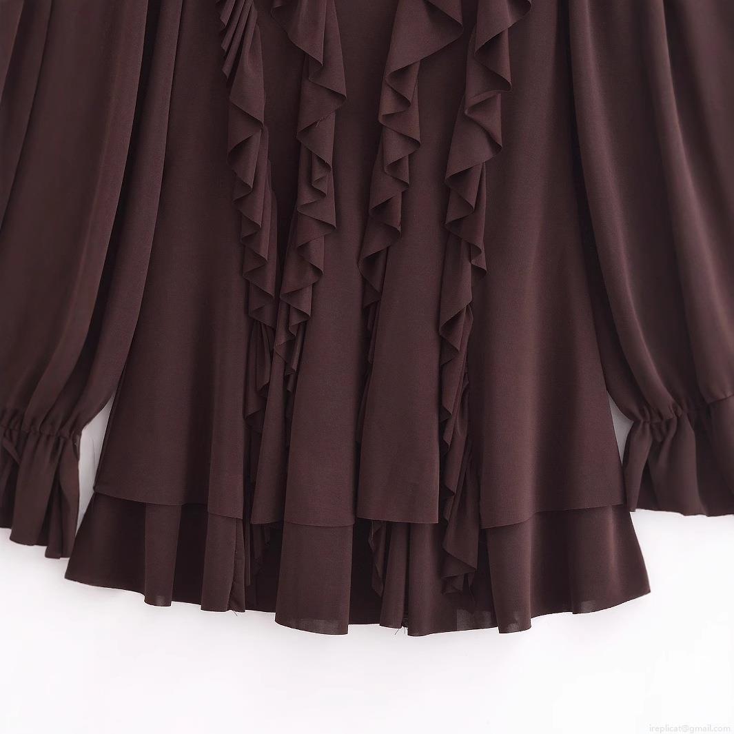 Women's Elegant V-Neck Tie-Front Bow Layered Ruffle Long Sleeve Chiffon Mini Dress Solid Coffee Brown Party Evening Dress
