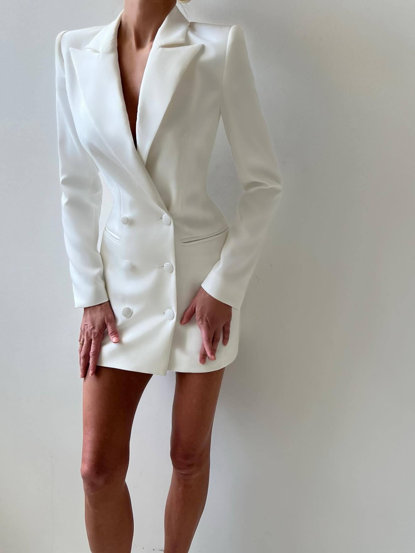• Women's Elegant White Double Breasted Blazer Dress Long Sleeve Lapel Collar Mini Dress With Shoulder Pads Slim Fit Cotton Blend Professional Party Office Lady Vestidos
