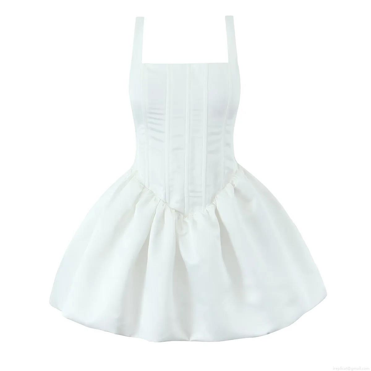 Women's Elegant White Satin Mini Dress Square Neck Sleeveless Corset Bone Waist Slimming Puff Hem Skirt Evening Party Cocktail Wedding Guest Dress