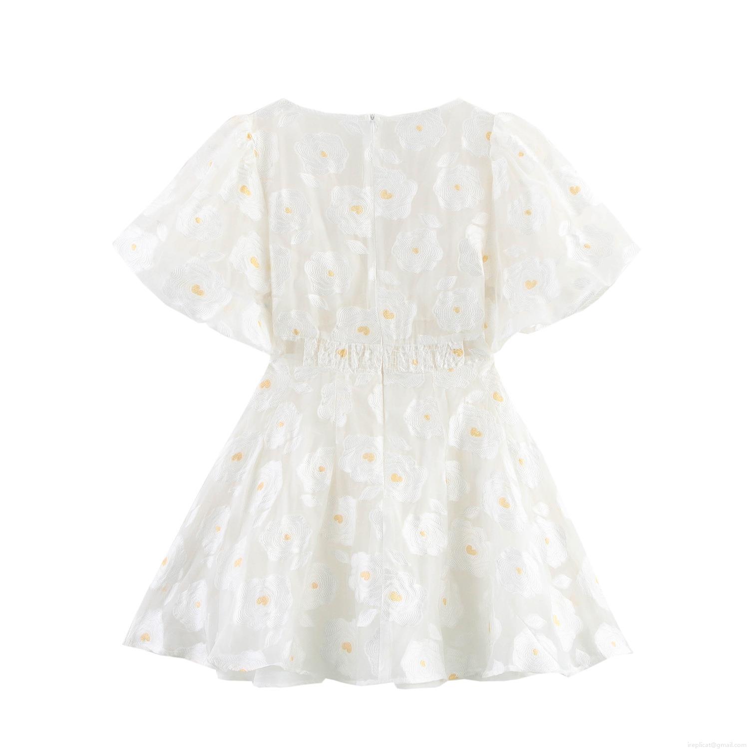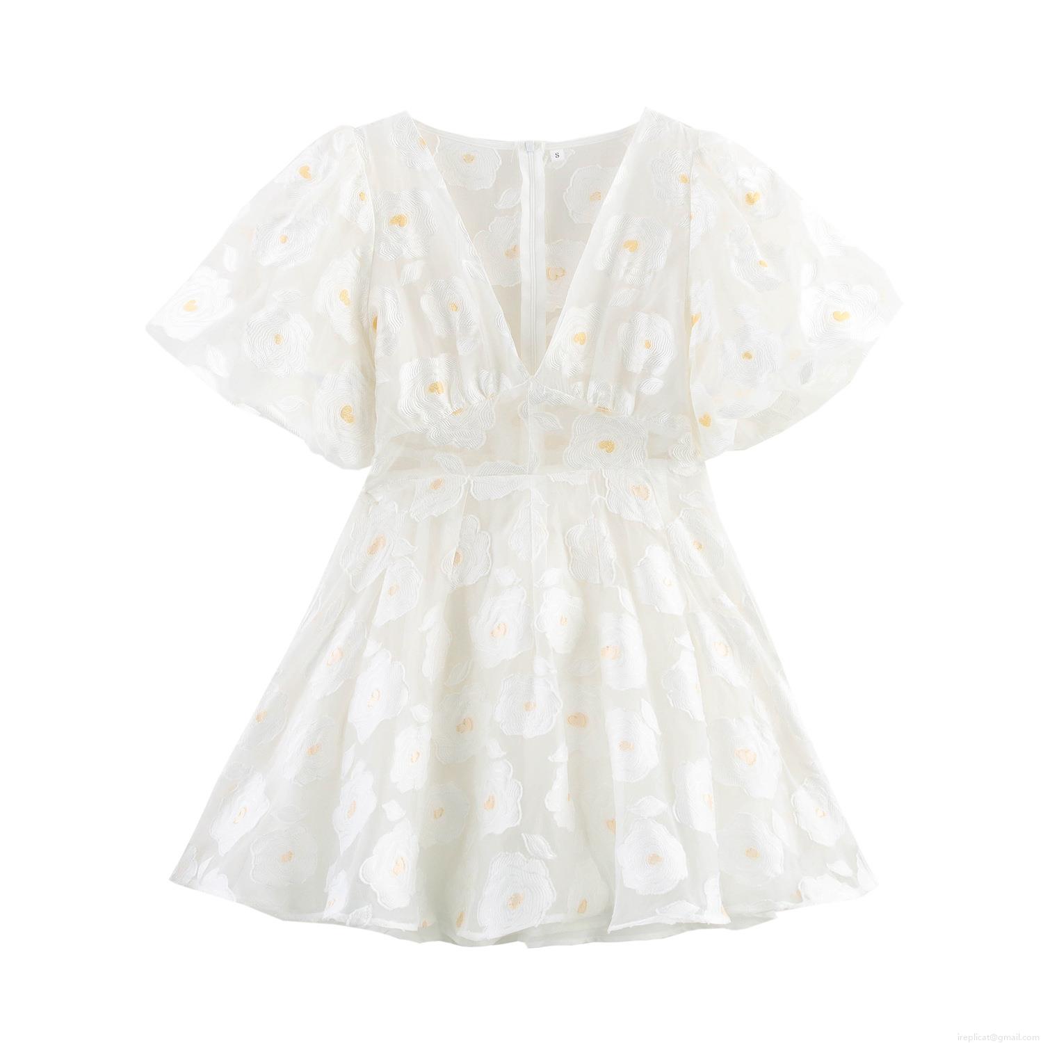 • Women's Elegant White V Neck Puff Sleeve Mini Dress Sweet Floral Embroidery Mesh Tulle Party Short Dress For Date Wedding