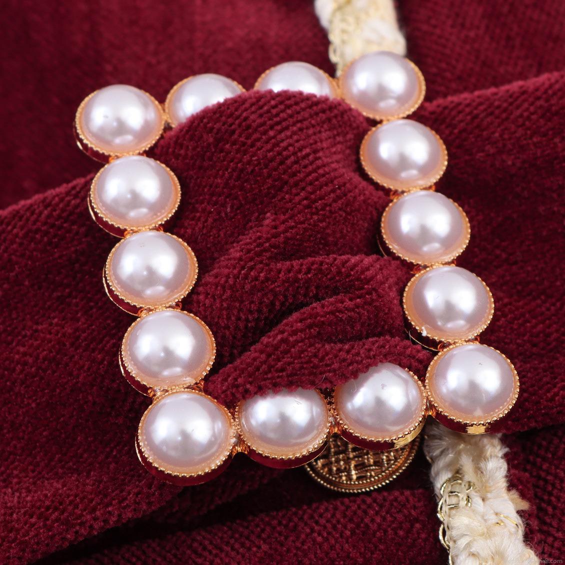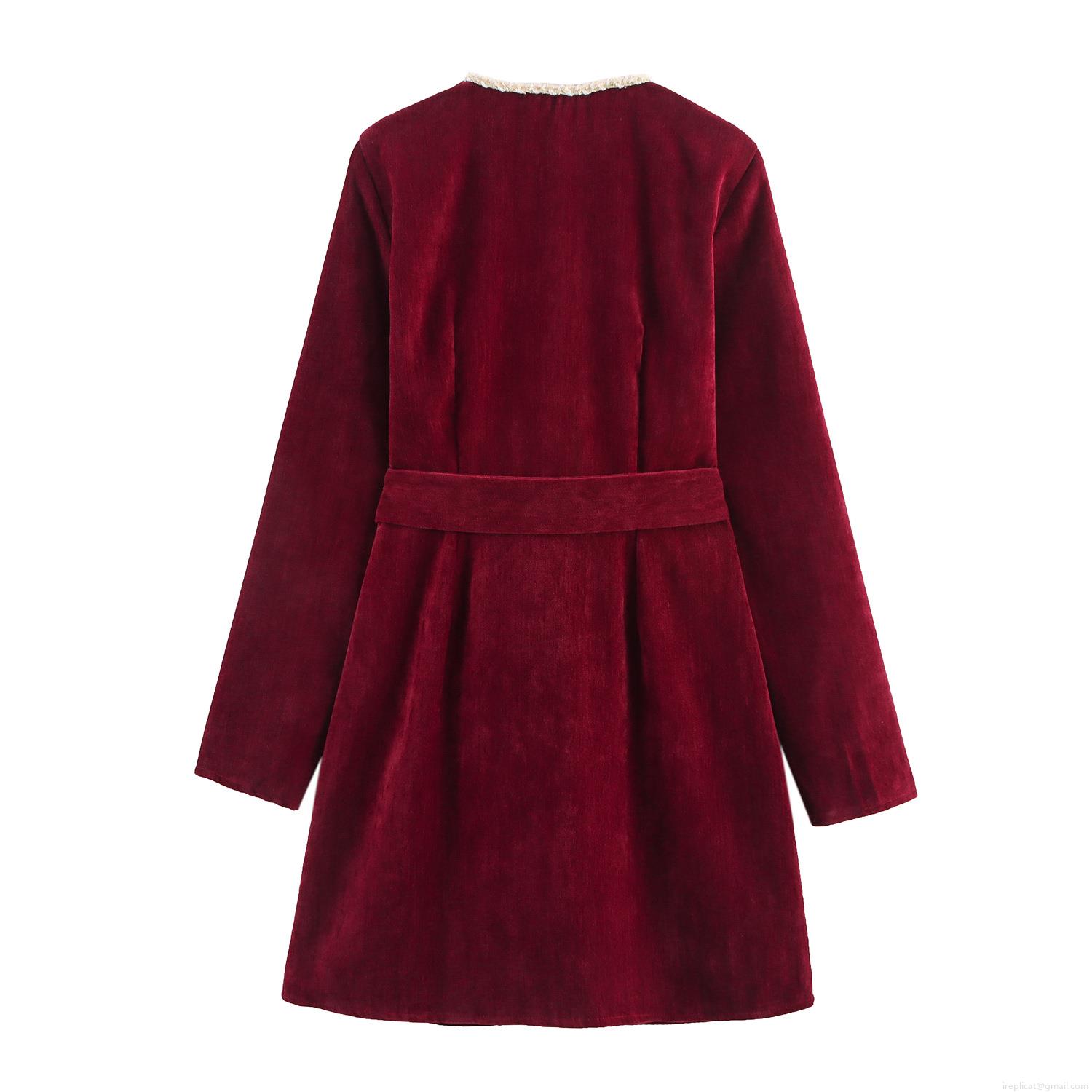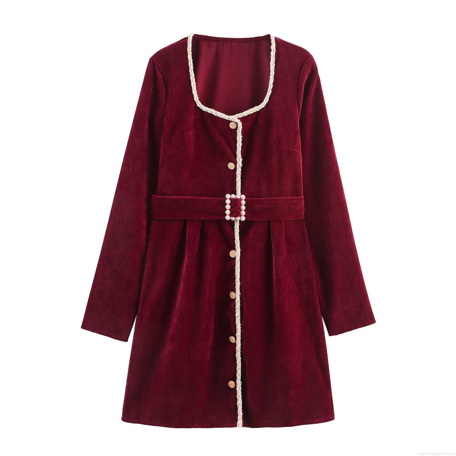 • Women's Elegant Wine Red Velvet Chenille Dress Square Neck With Pearl Buttons Professional Long Sleeve Mini Dress For Office Party