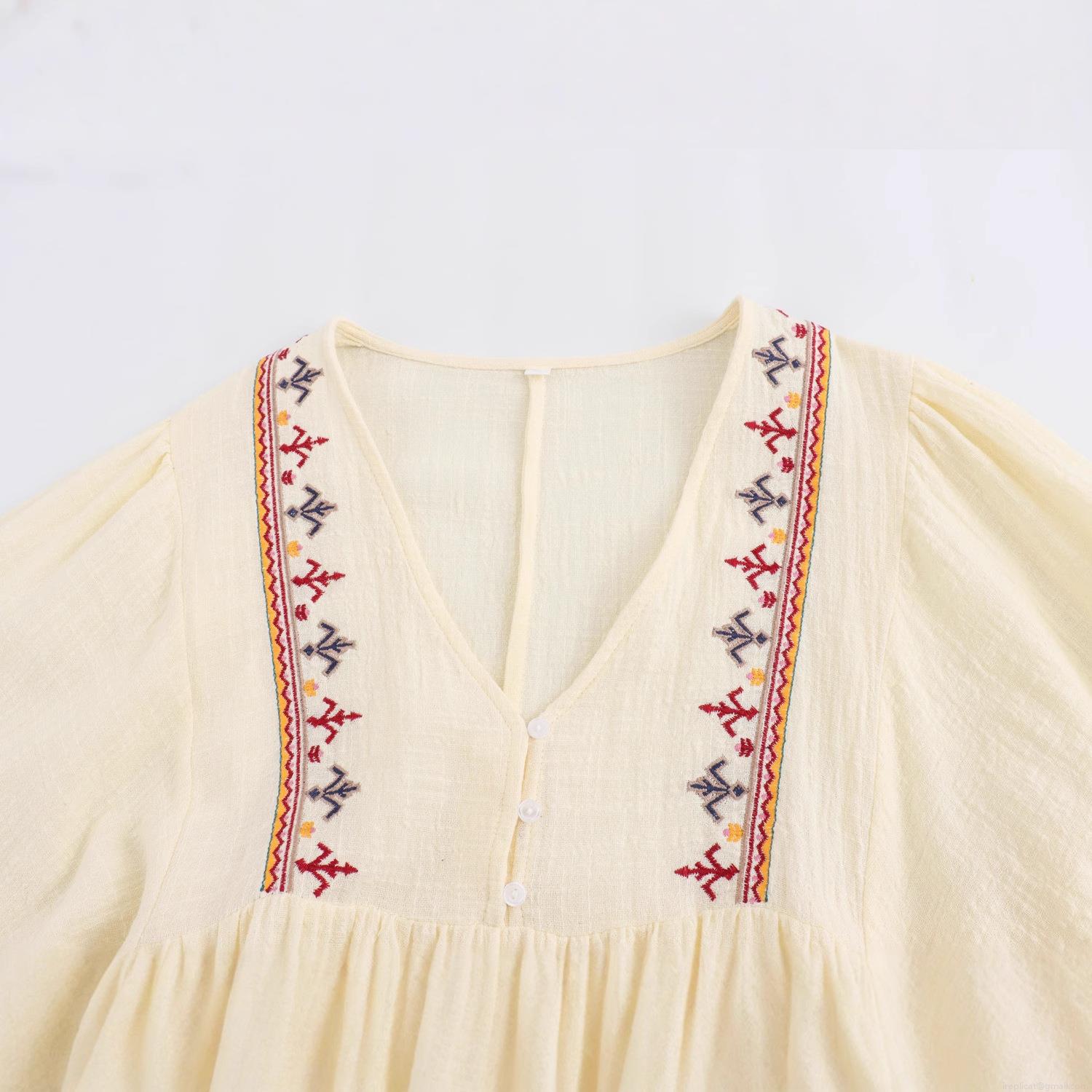 • Women's Ethnic Embroidery Mini Dress Elegant V Neck Puff Sleeve Polyester Boho Casual Loose Sundress For Lady Party Beach Vacation