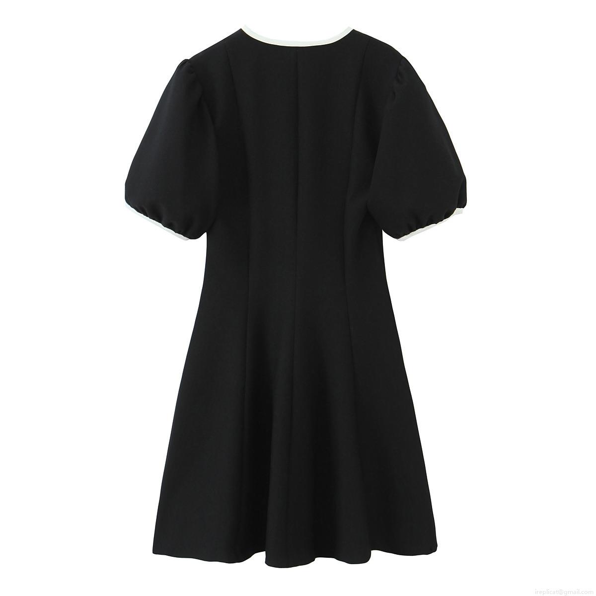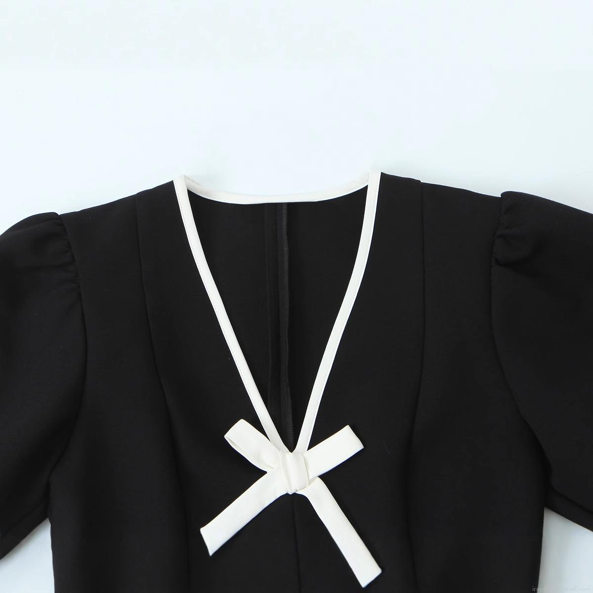 • Women's Fashion Contrast Piping Mini Dress Elegant V-Neck Short Puff Sleeve White Bow-Knot Decoration Color-block Black Dress For Women