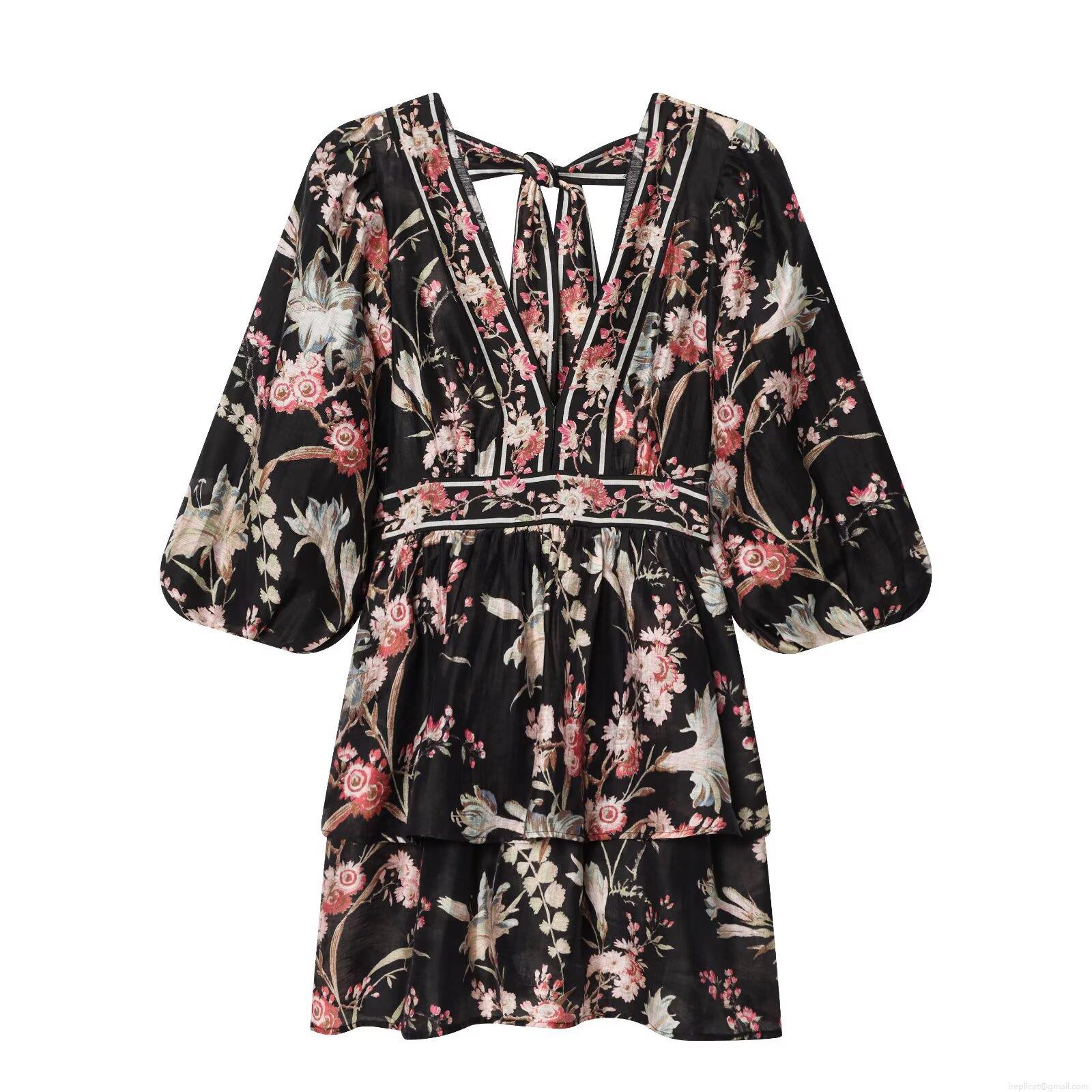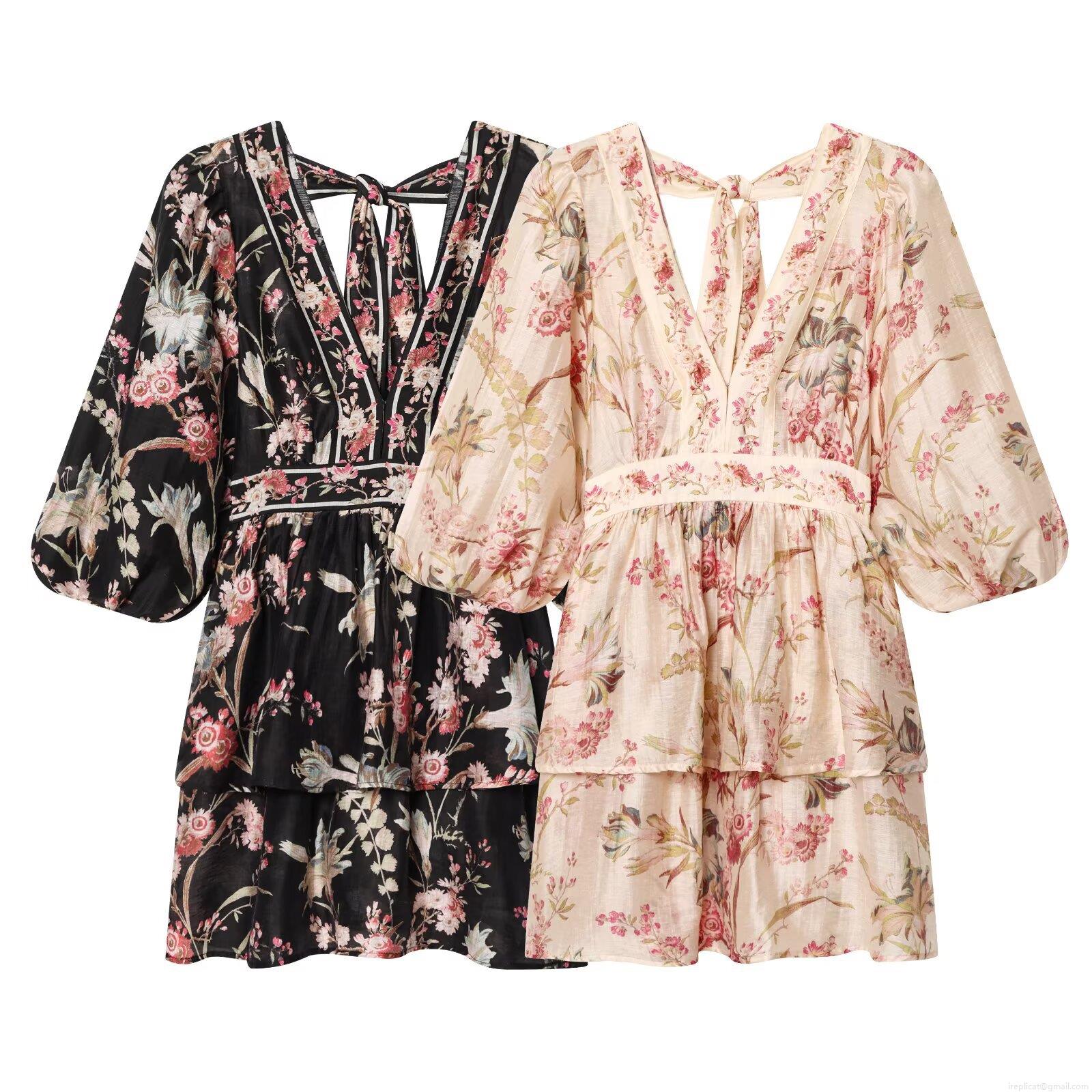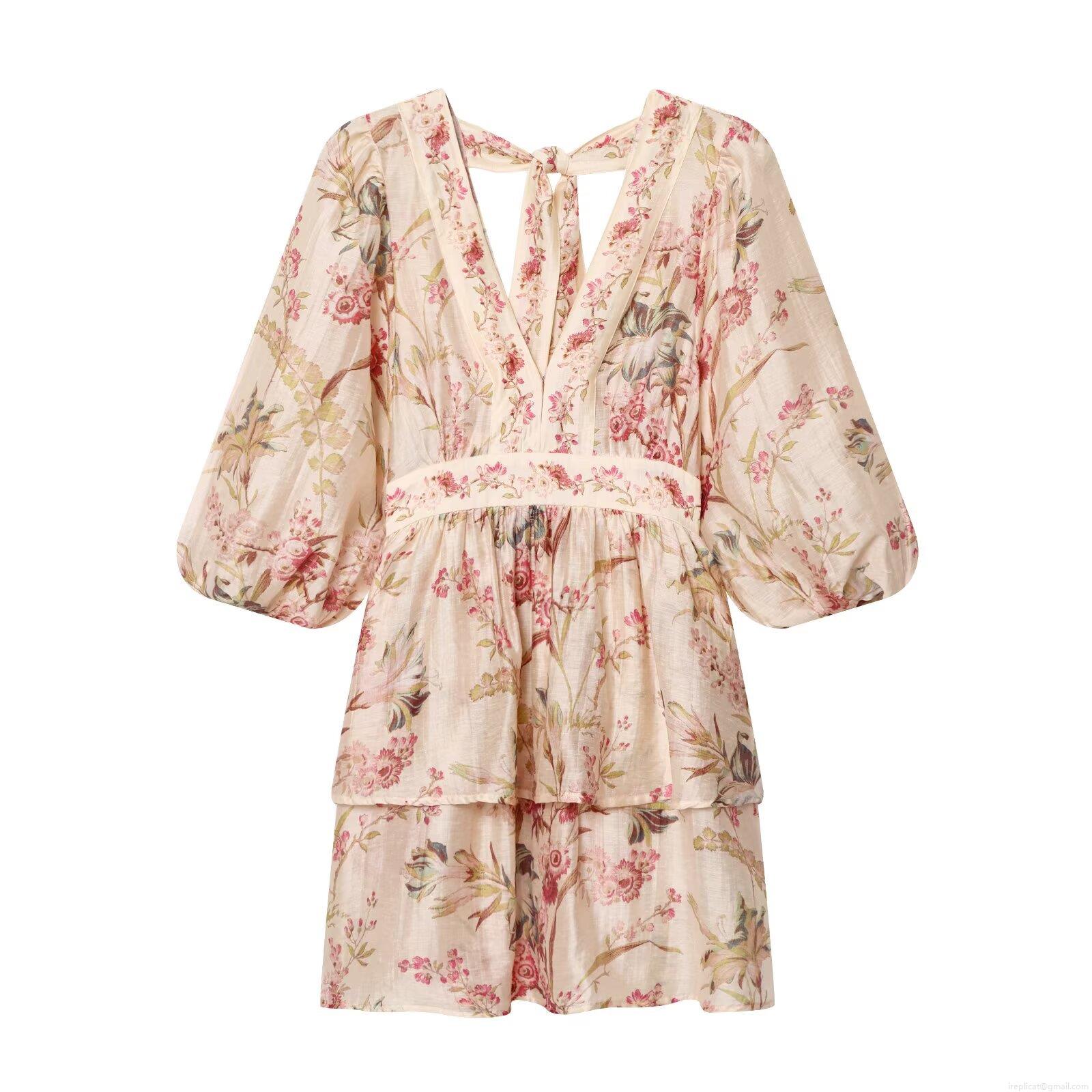 • Women's Floral Print V-Neck Mini Dress Lantern Sleeve Backless Tie Up Tiered Ruffle Hem Bohemian Summer Vacation Party Dresses