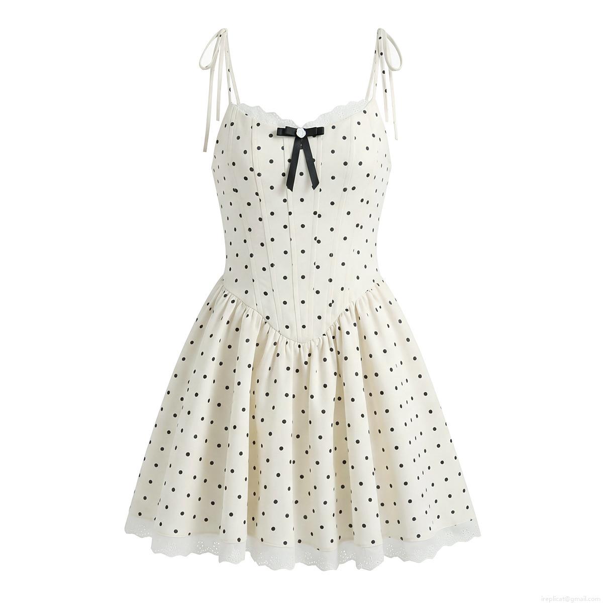 • Women's French Elegant Polka Dot Mini Dress With Lace Trim And Black Bow Decoration Summer Sleeveless Camisole Slim Fit A-Line Dress For Vacation